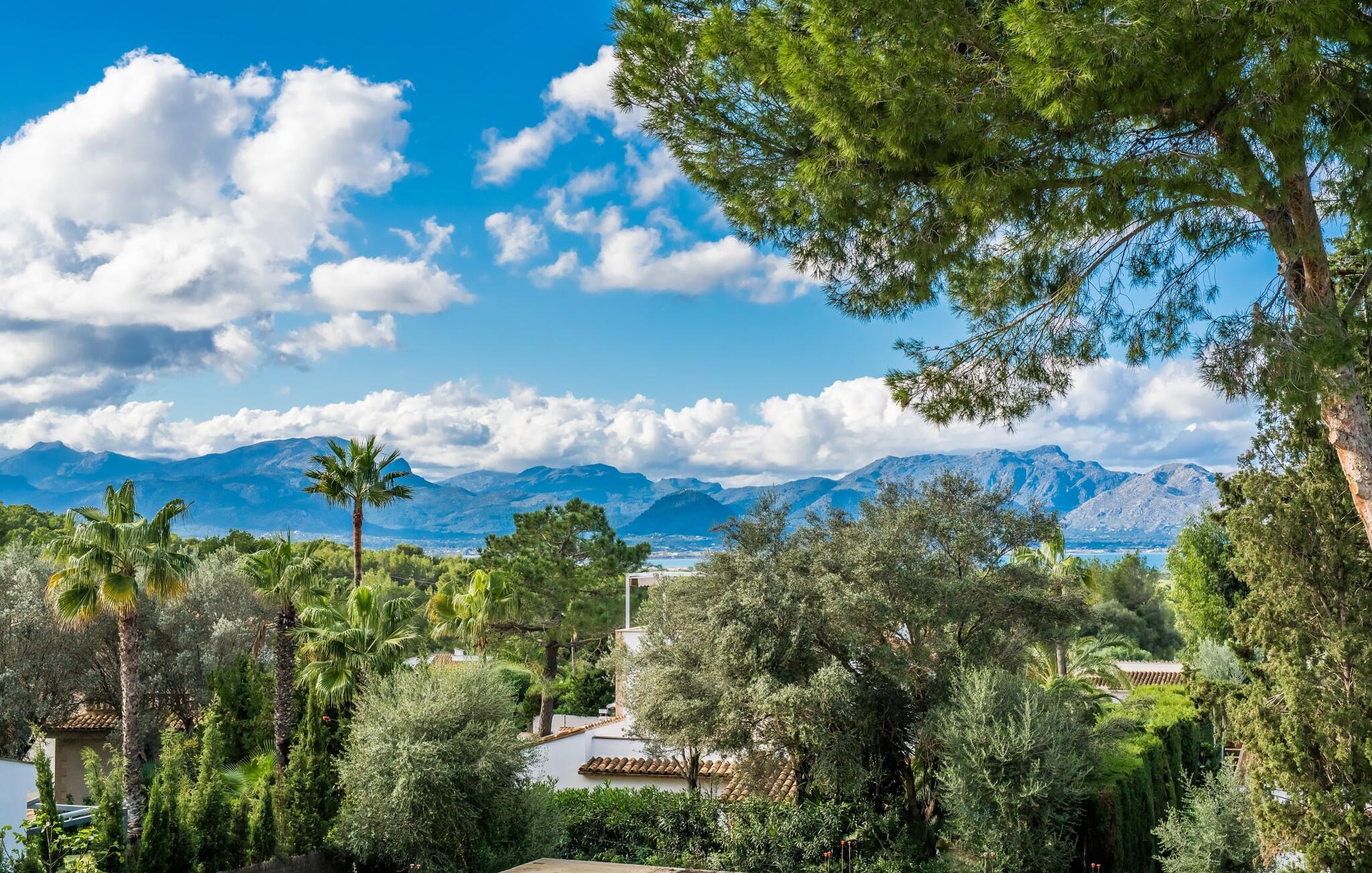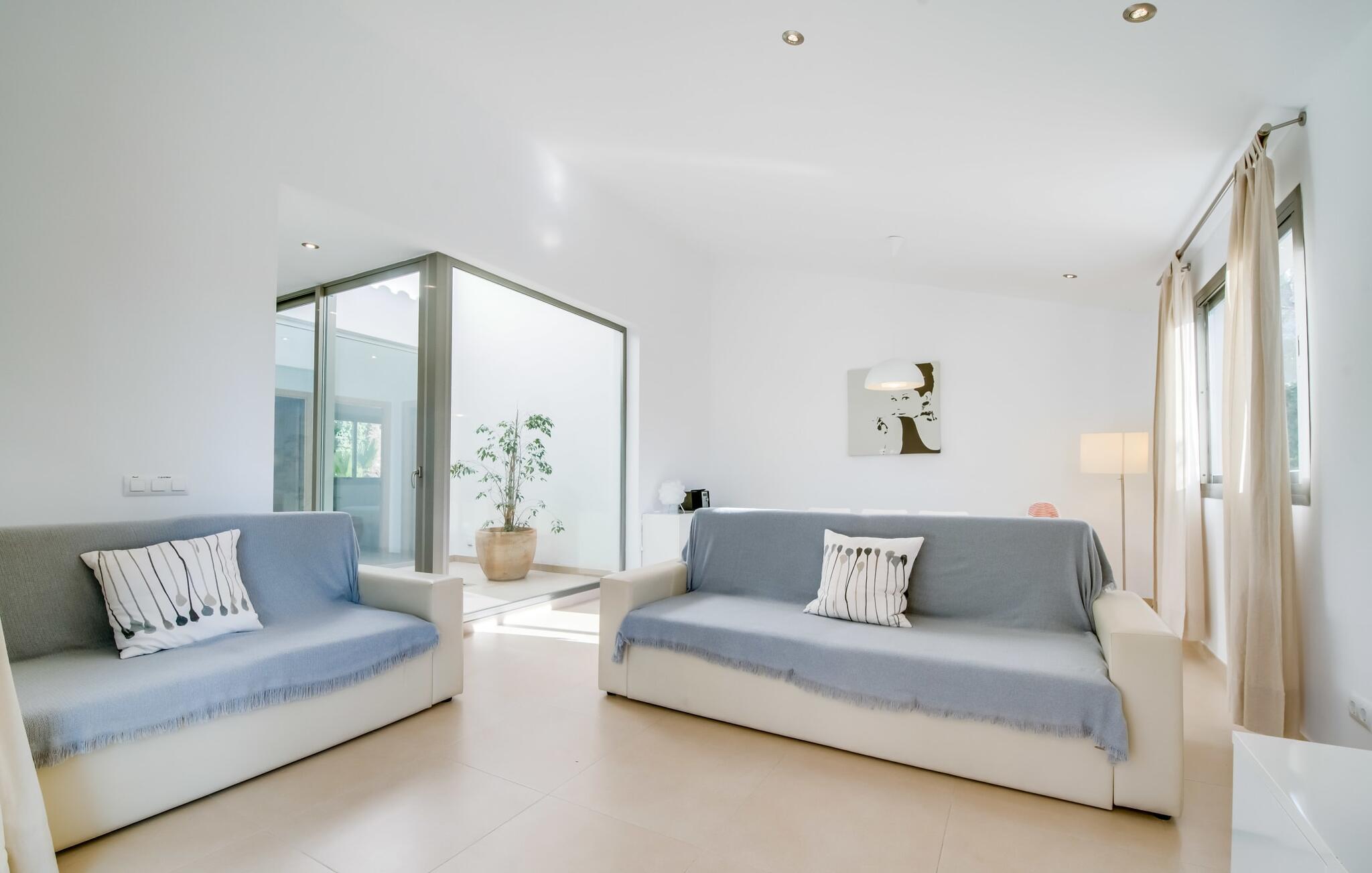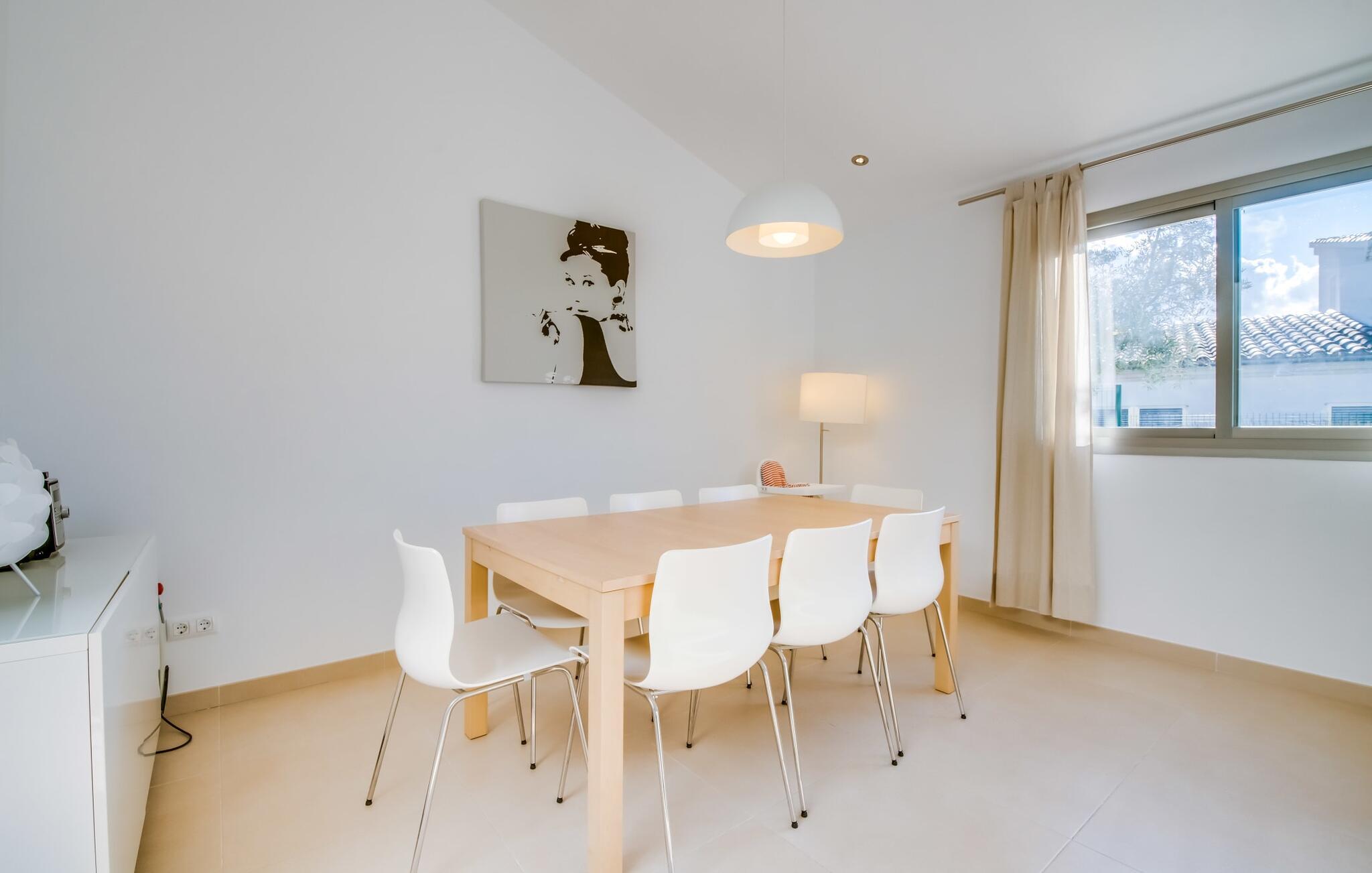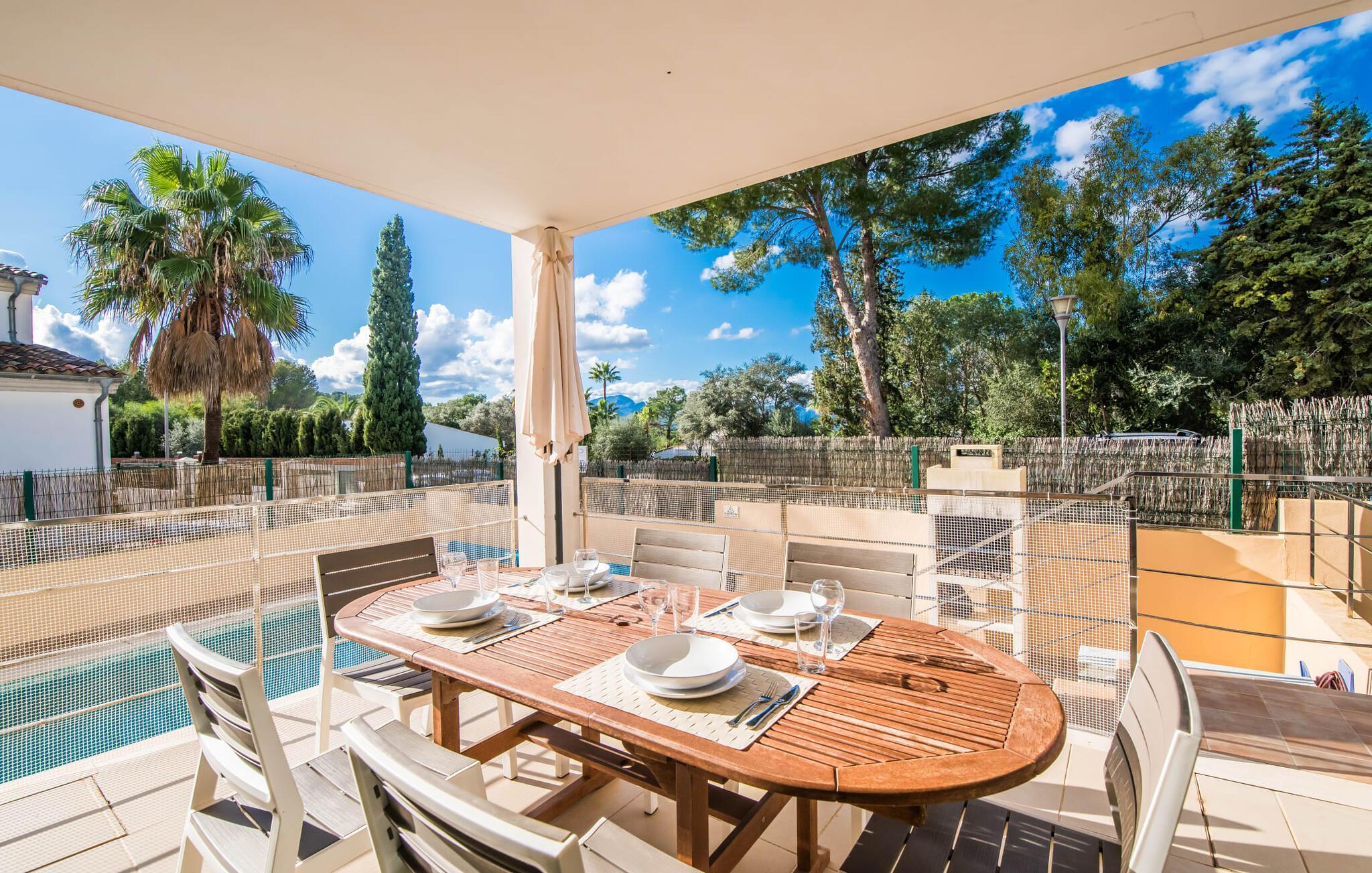 Den skinande vita Villa Roure de Alcudia kombinerar allt du behöver för en drömsemester på Mallorca under ett tak. Detta semesterhus för åtta gäster får höga poäng bara i utomhusområdet: En privat pool i ett bostadsområde, som inte är en självklarhet, är lika mycket en del av den paradisiska atmosfären som en inbjudande solterrass med bekväma solstolar. Det knotiga gamla olivträdet några trappsteg upp skapar en klassisk medelhavsatmosfär. Matbordet är också upphöjt, precis intill huset, varifrån du har en utmärkt utsikt över poolen och samtidigt en behagligt kort promenad in i huset. På kvällen kommer du säkert att känna för att tända upp tegelgrillen och förbereda kulinariska läckerheter över glöden. En terrass på övervåningen avrundar utbudet av uteserveringar och erbjuder underbar utsikt så långt som till havet.