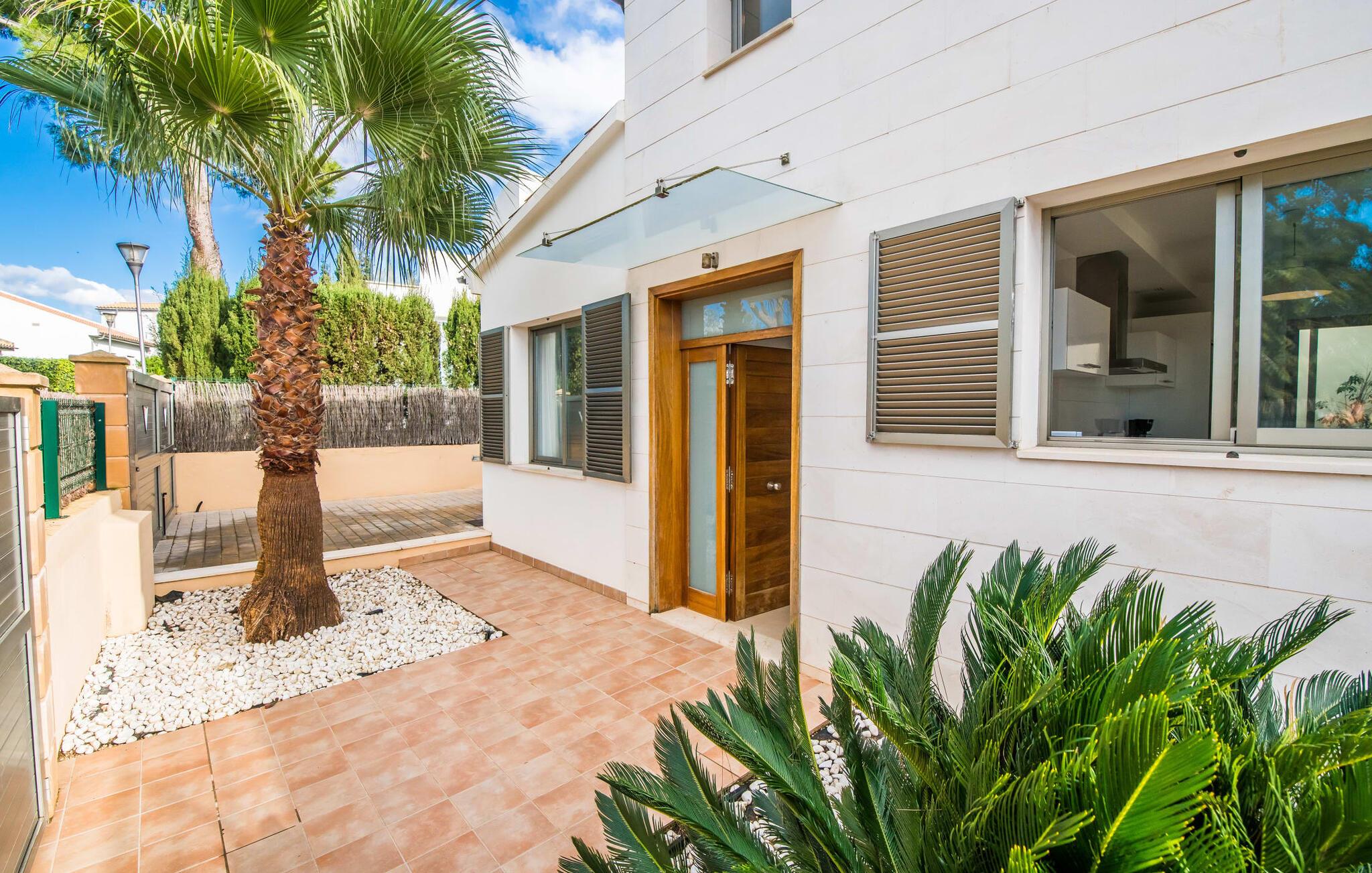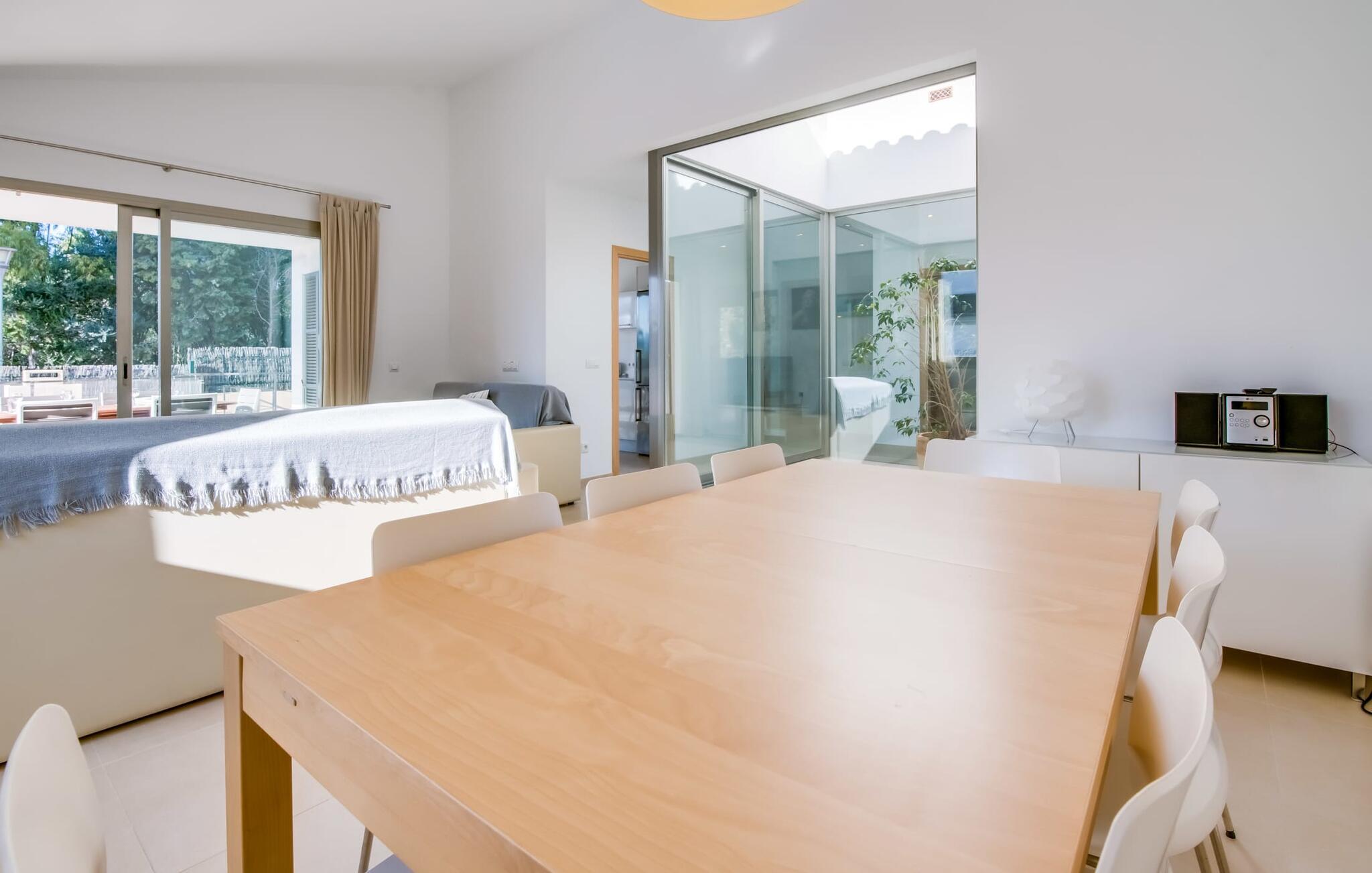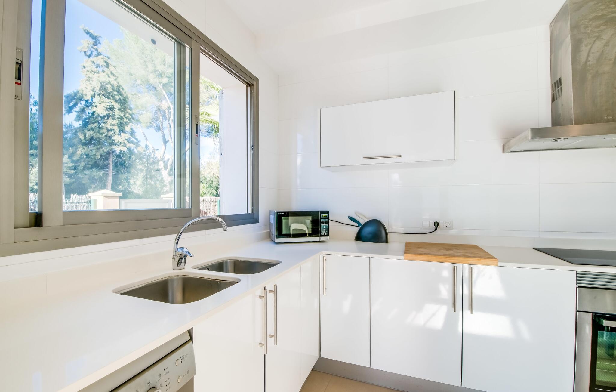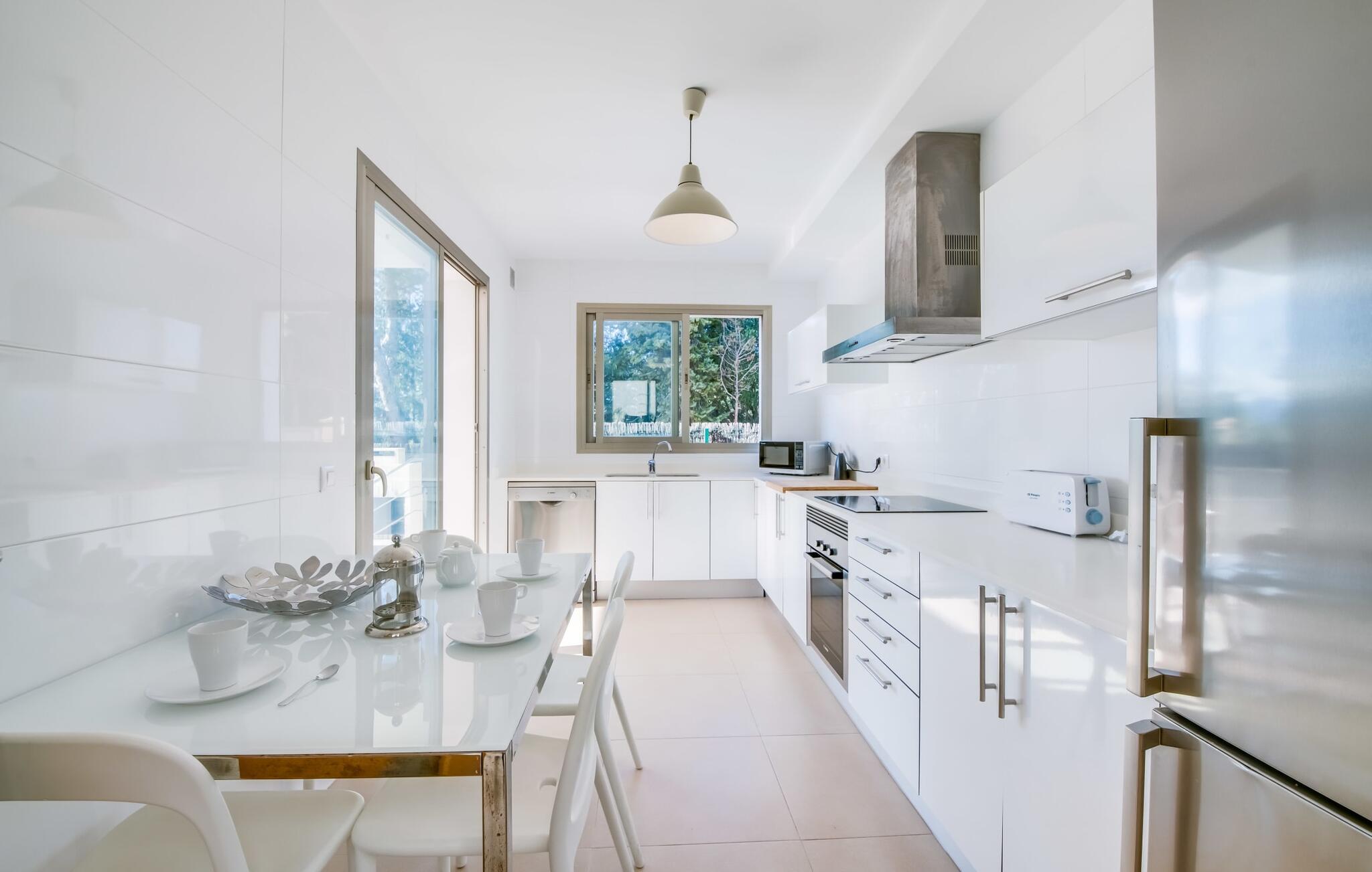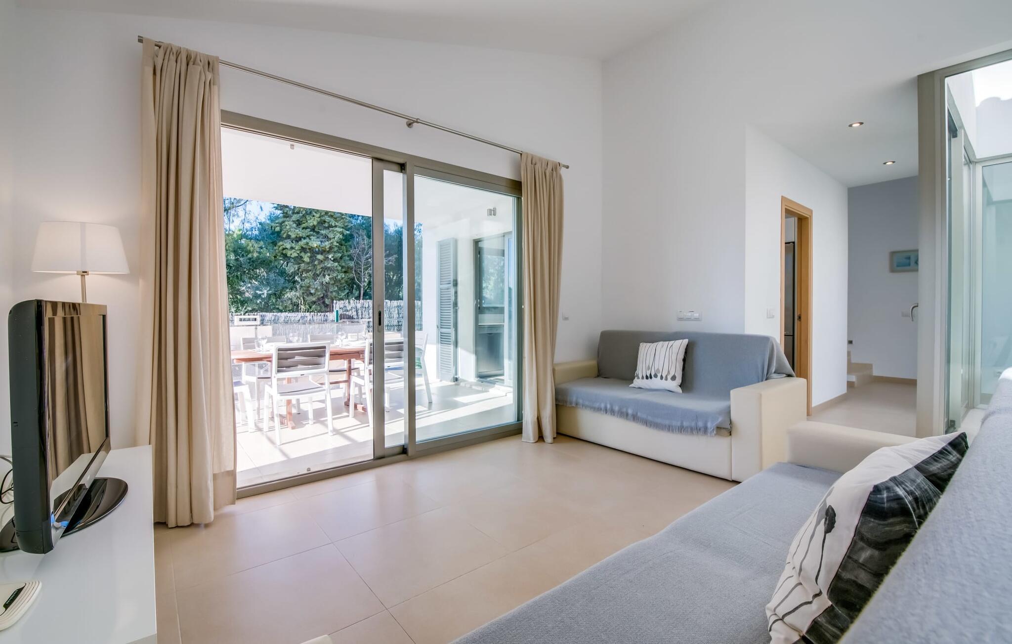 Den skinande vita Villa Roure de Alcudia kombinerar allt du behöver för en drömsemester på Mallorca under ett tak. Detta semesterhus för åtta gäster får höga poäng bara i utomhusområdet: En privat pool i ett bostadsområde, som inte är en självklarhet, är lika mycket en del av den paradisiska atmosfären som en inbjudande solterrass med bekväma solstolar. Det knotiga gamla olivträdet några trappsteg upp skapar en klassisk medelhavsatmosfär. Matbordet är också upphöjt, precis intill huset, varifrån du har en utmärkt utsikt över poolen och samtidigt en behagligt kort promenad in i huset. På kvällen kommer du säkert att känna för att tända upp tegelgrillen och förbereda kulinariska läckerheter över glöden. En terrass på övervåningen avrundar utbudet av uteserveringar och erbjuder underbar utsikt så långt som till havet.