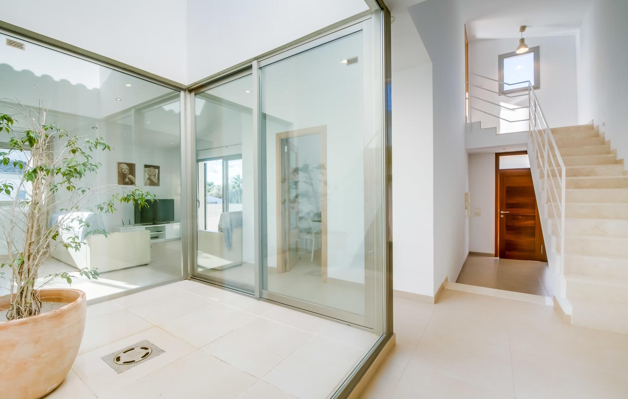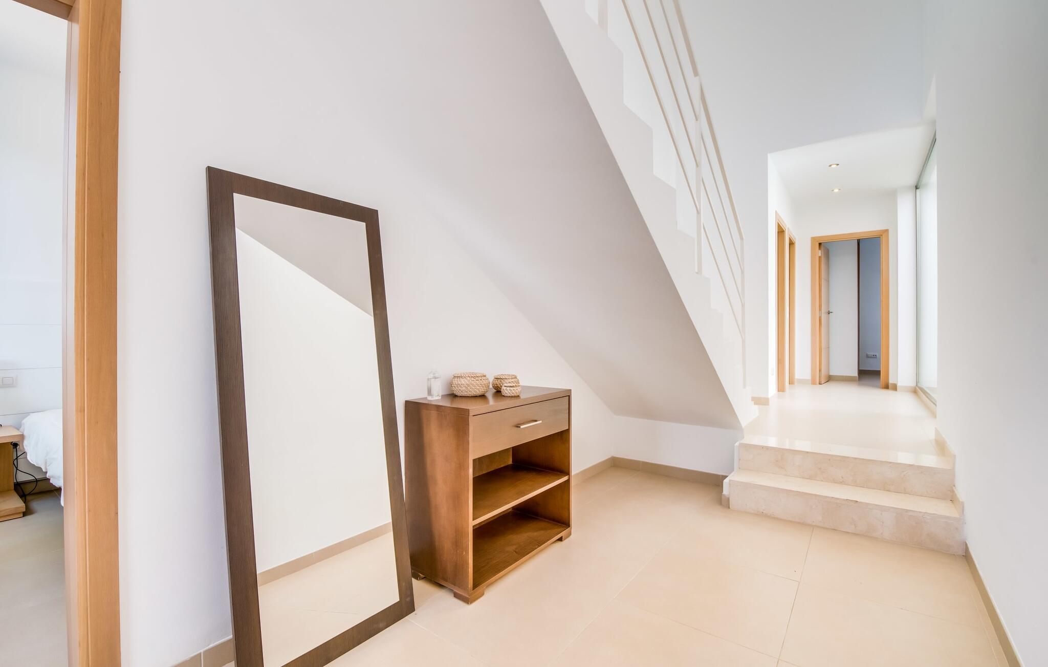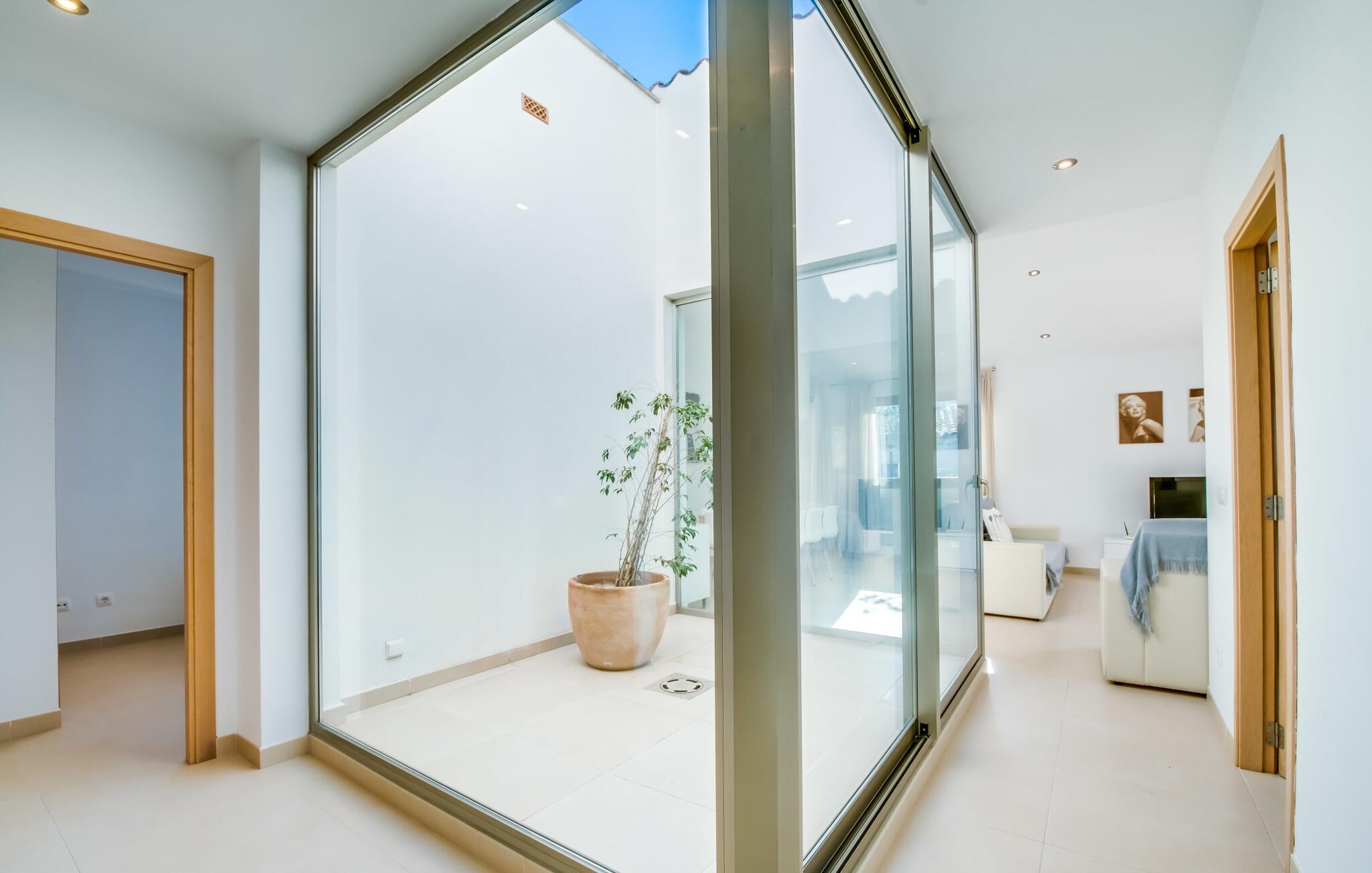 Interiören fortsätter att vara underbart översvämmad av ljus. Här är det raka linjer, ljusa och harmoniska färger och former som gäller. Förutom entrén finns det ett vackert vardagsrum/matsal på bottenvåningen samt ett kök, som naturligtvis är fullt utrustat och skiner i den trendiga vita stilen. Det finns till och med plats för ett extra matbord. Tre estetiskt utformade dubbelrum, varav ett har eget badrum, och ett andra badrum ligger också på detta vardagsrumsplan, som har en mycket speciell effekt tack vare glaskuben. Det fjärde sovrummet, också med eget badrum, ligger på övervåningen. Härifrån har du tillgång till den tidigare nämnda terrassen, där du också kan fira ditt första kaffe på morgonen. Denna charmiga villa med privat pool ligger i det ganska lugna Cielo de Bonaire. Havet ligger bara 10 minuters promenad bort. Området är inte särskilt turistigt och är därför den perfekta tillflyktsorten för alla Mallorca-semesterfirare som letar efter lugnet på ön. De attraktiva sevärdheterna i Alcúdia och Pollensa ligger 5-10 minuter bort med bil och kan lätt nås via väg. Det finns flera attraktiva stränder inom en radie av 2 till 4 kilometer.