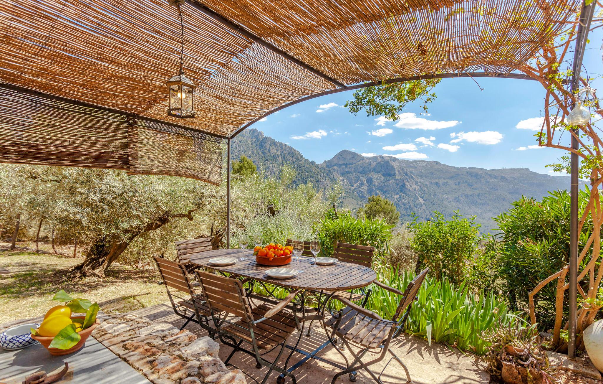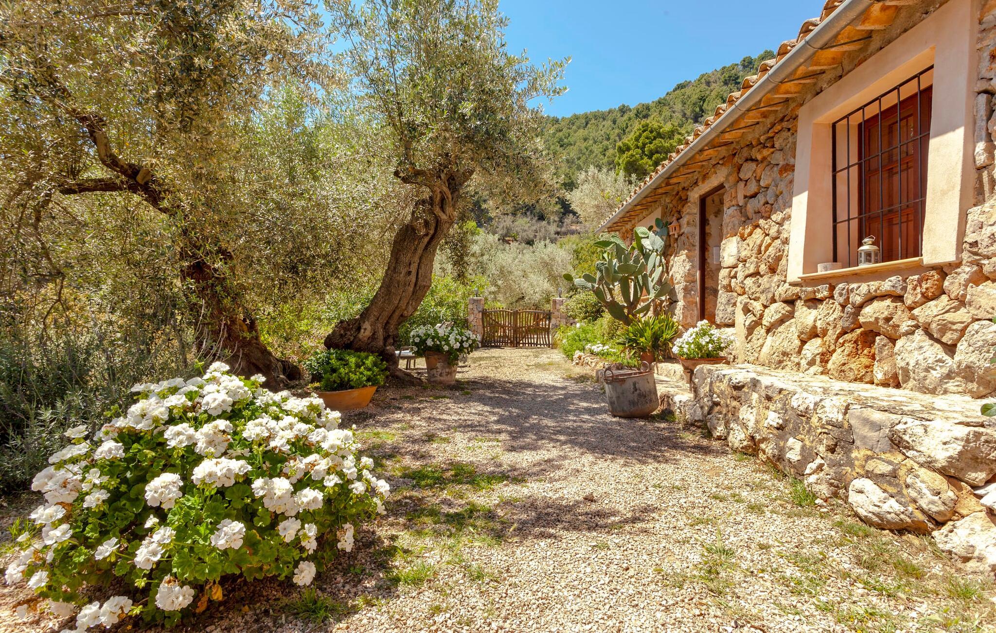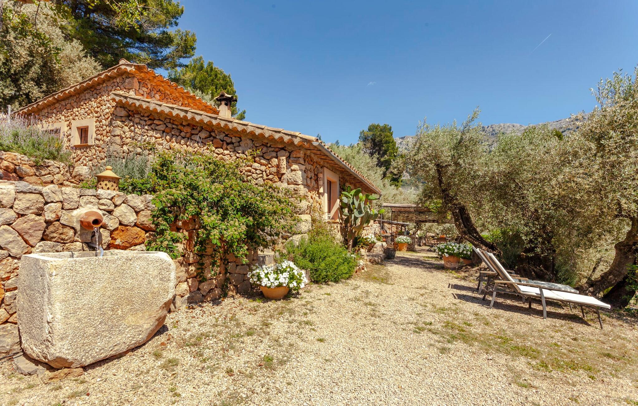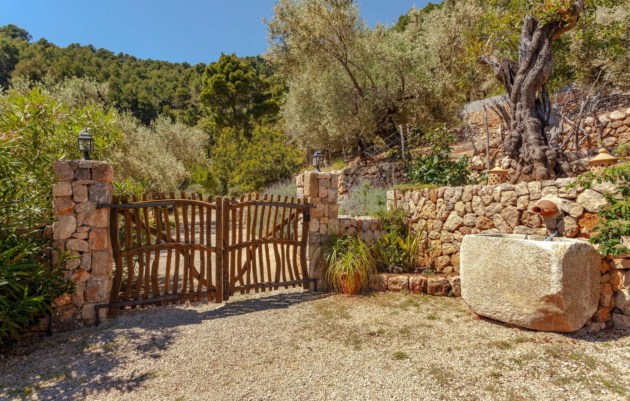 Denna lilla, högt belägna bergsoas av lugn och ro gör ett magiskt intryck, inbäddad i Tramuntana-bergens imponerande bakgrund med rustik elegans. Hitta din favoritplats under ett knotigt olivträd eller på den luftiga, täckta terrassen och njut av lugnet och tystnaden runt denna underbara plats, utsikten över dalen, bergen och skogarna till fullo. Lyssna till fågelsången och upplev den lugnande effekten av en vild och romantisk miljö som du inte hittar någon annanstans. De naturliga stenväggarna, de utspridda blomkrukorna och den rustika grinden ramar in ditt tillfälliga smycke på ett pittoreskt sätt och skapar en vild romantisk känsla. Under de hängande lamporna bredvid den prydliga fontänen är terrassen särskilt frodig på kvällen, särskilt om du förbereder några medelhavsdelikatesser på grillen och sedan njuter av dem när dagen går mot sitt slut.