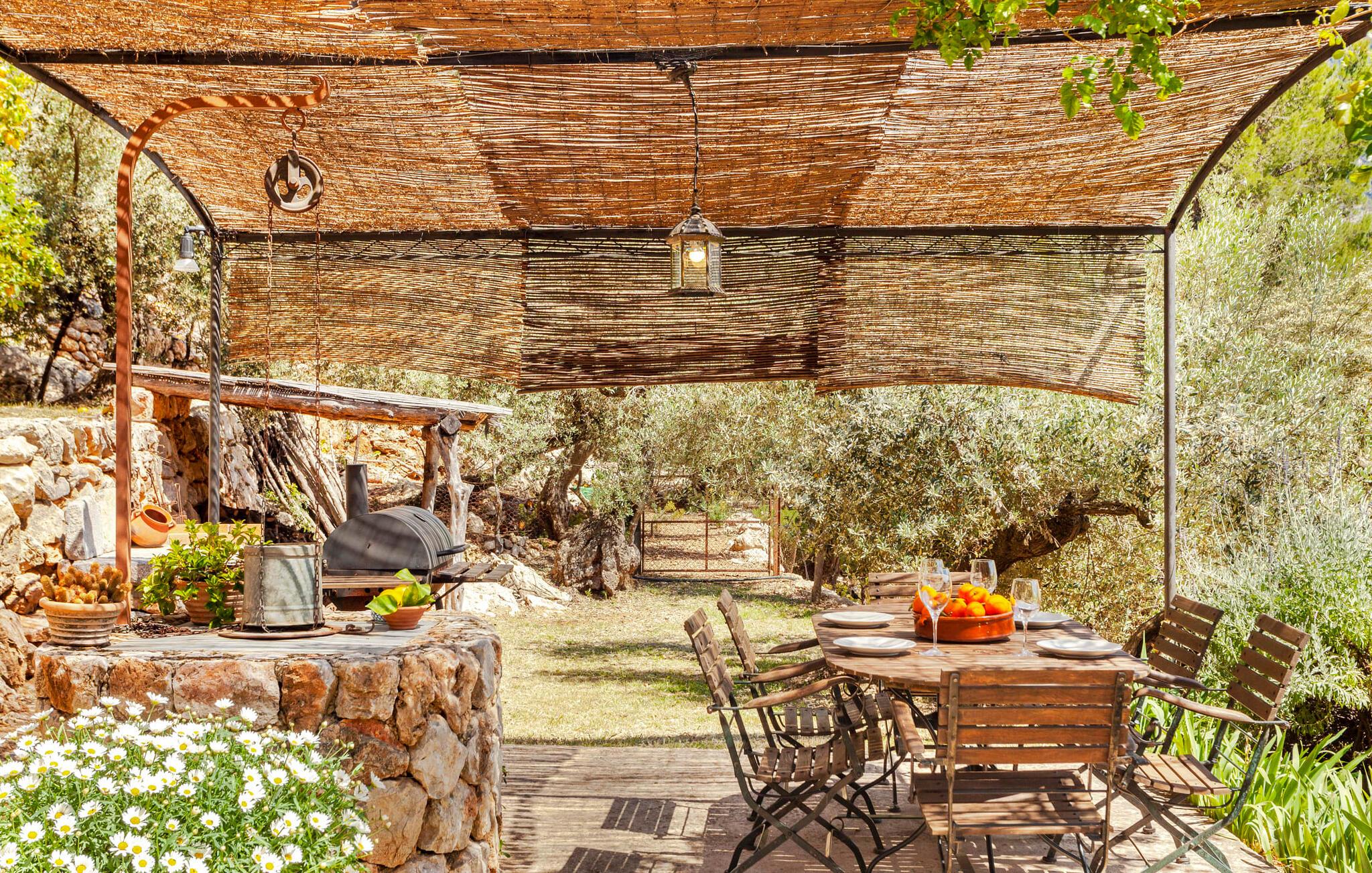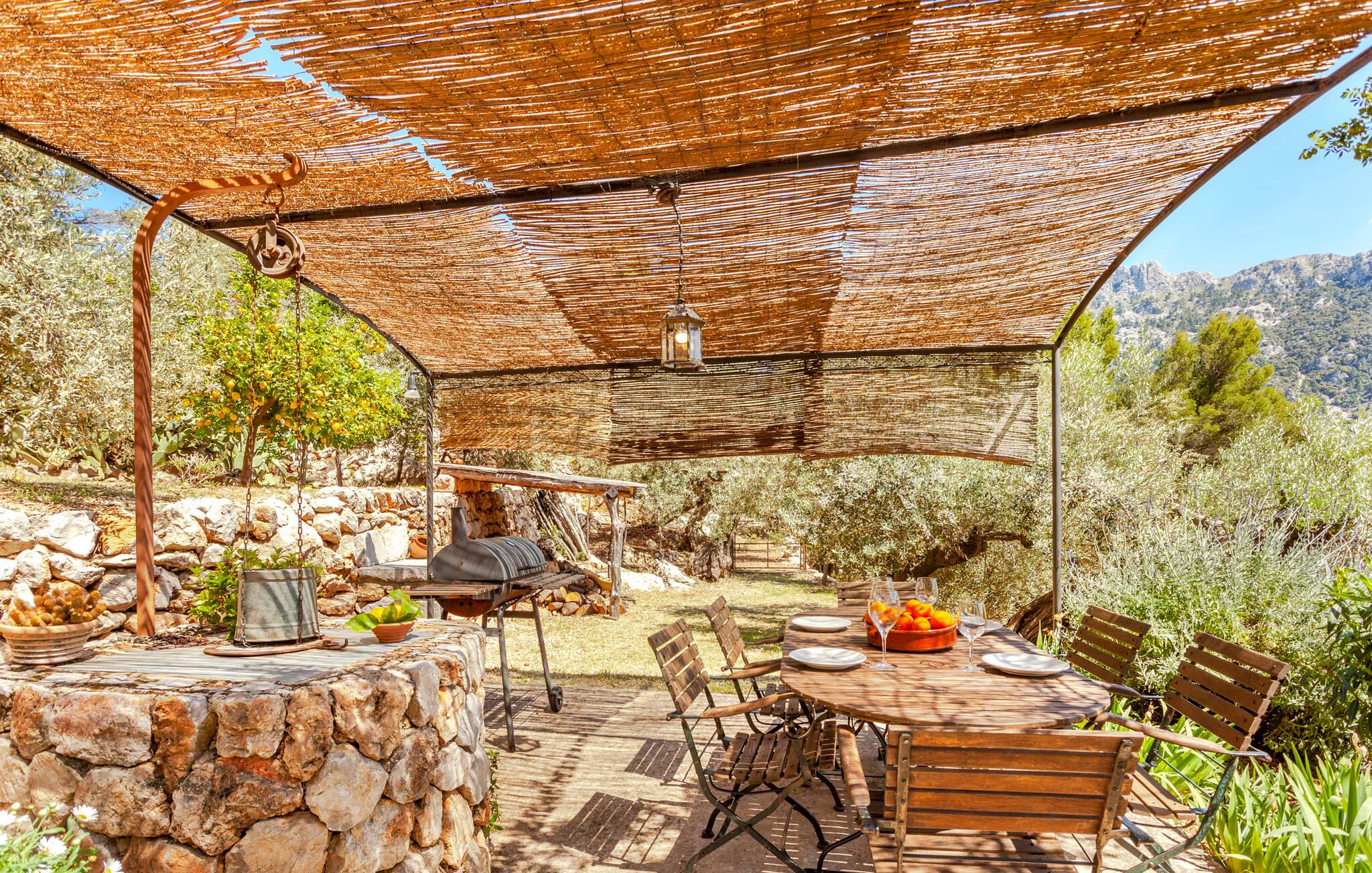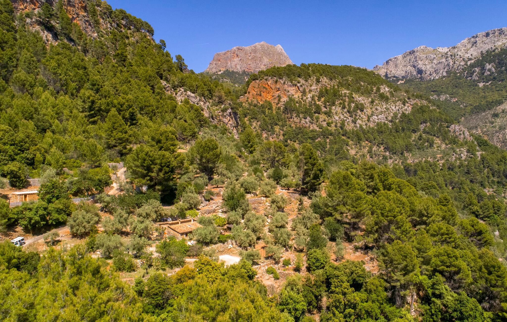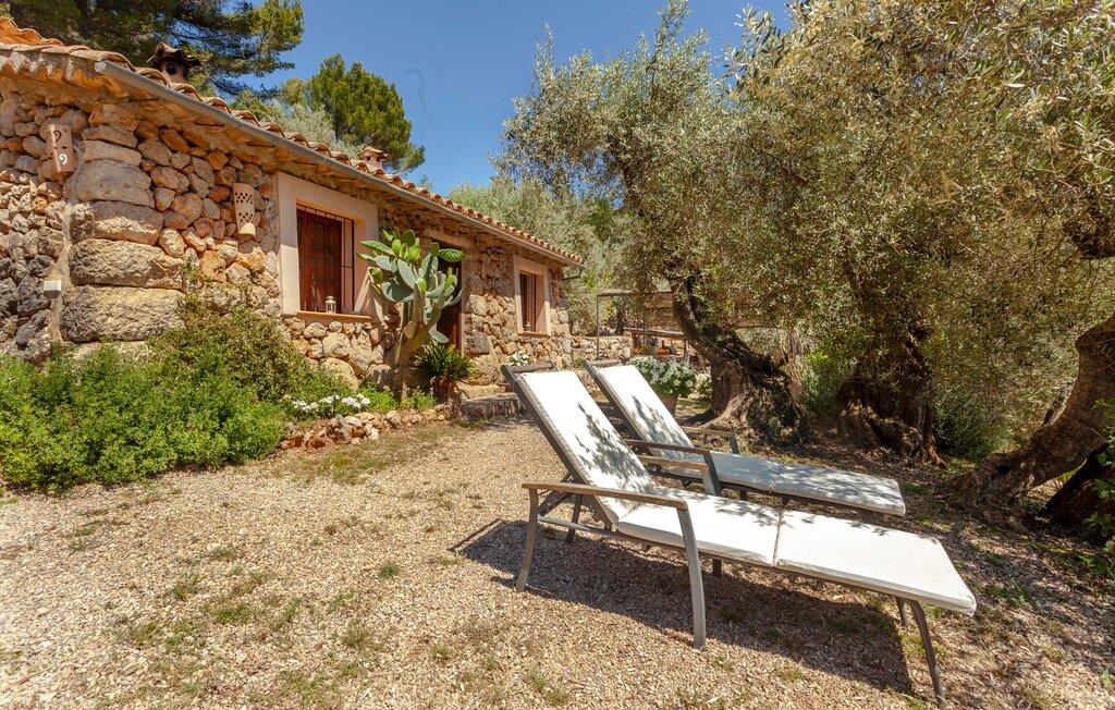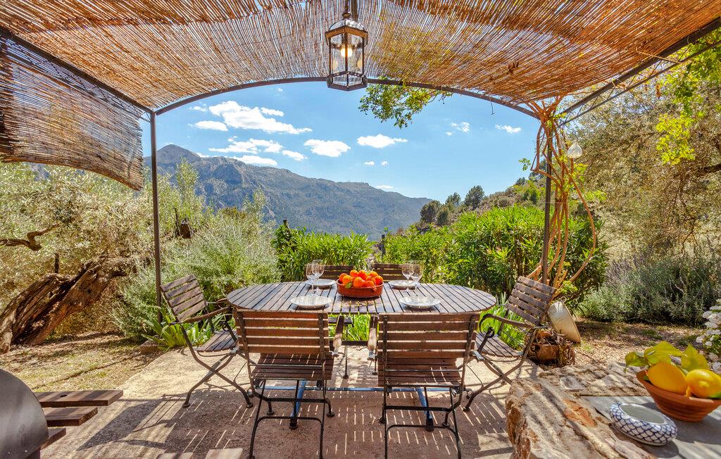 Denna lilla, högt belägna bergsoas av lugn och ro gör ett magiskt intryck, inbäddad i Tramuntana-bergens imponerande bakgrund med rustik elegans. Hitta din favoritplats under ett knotigt olivträd eller på den luftiga, täckta terrassen och njut av lugnet och tystnaden runt denna underbara plats, utsikten över dalen, bergen och skogarna till fullo. Lyssna till fågelsången och upplev den lugnande effekten av en vild och romantisk miljö som du inte hittar någon annanstans. De naturliga stenväggarna, de utspridda blomkrukorna och den rustika grinden ramar in ditt tillfälliga smycke på ett pittoreskt sätt och skapar en vild romantisk känsla. Under de hängande lamporna bredvid den prydliga fontänen är terrassen särskilt frodig på kvällen, särskilt om du förbereder några medelhavsdelikatesser på grillen och sedan njuter av dem när dagen går mot sitt slut.