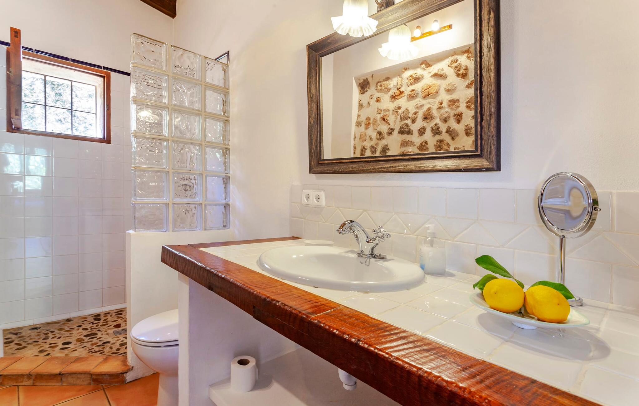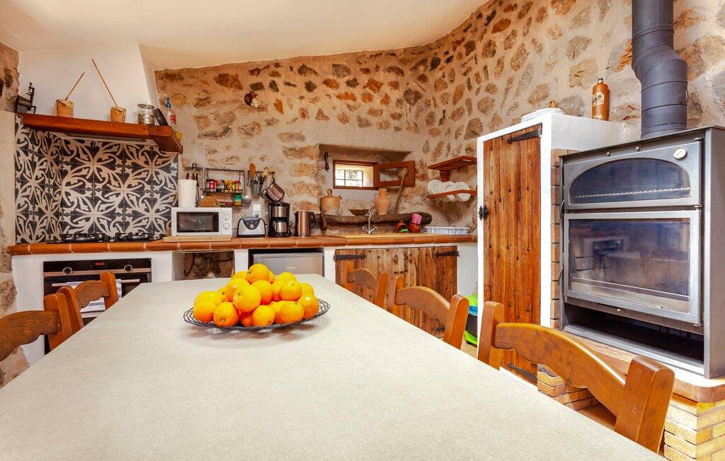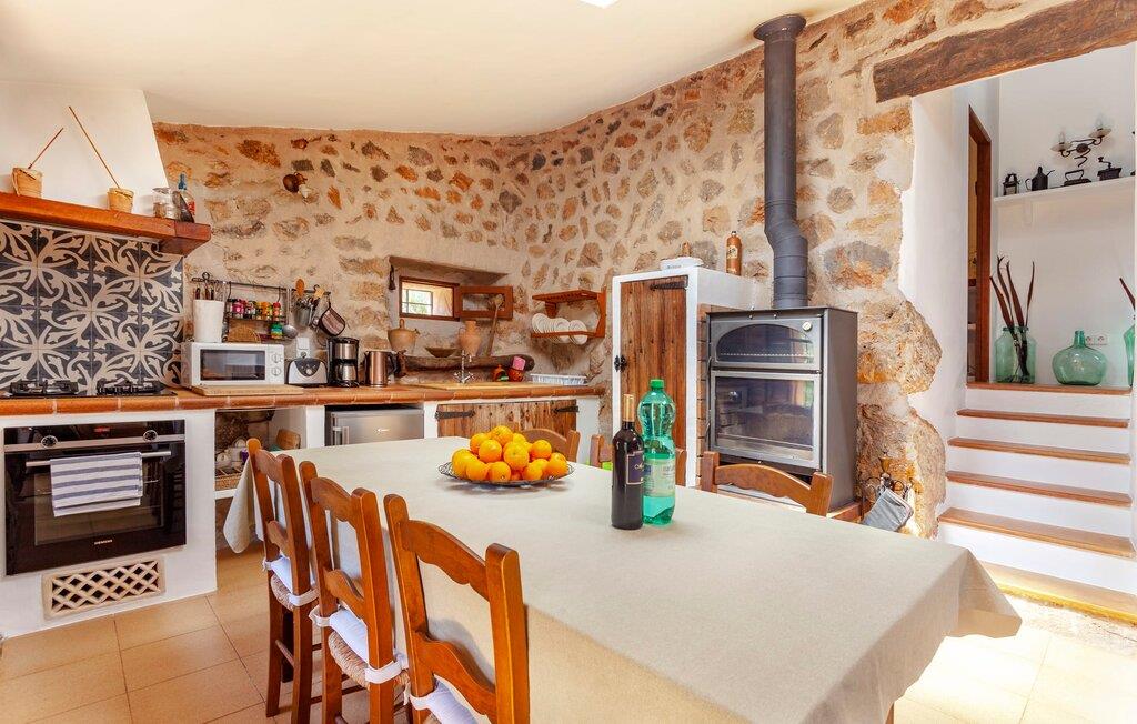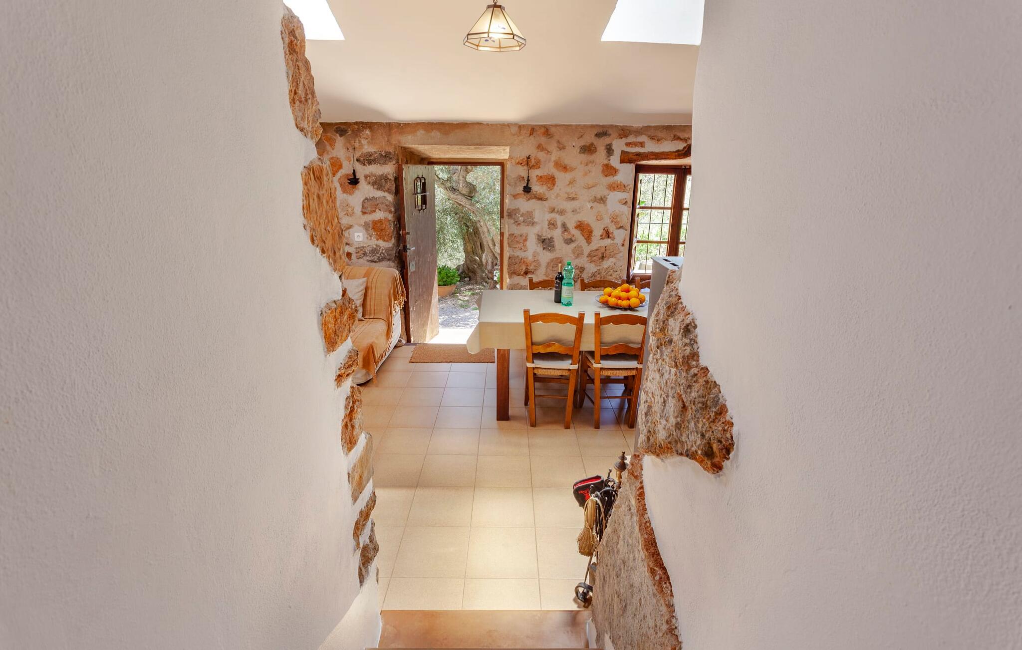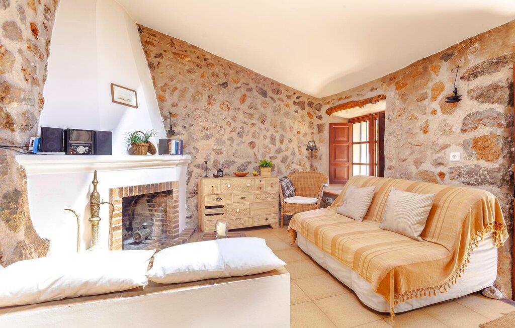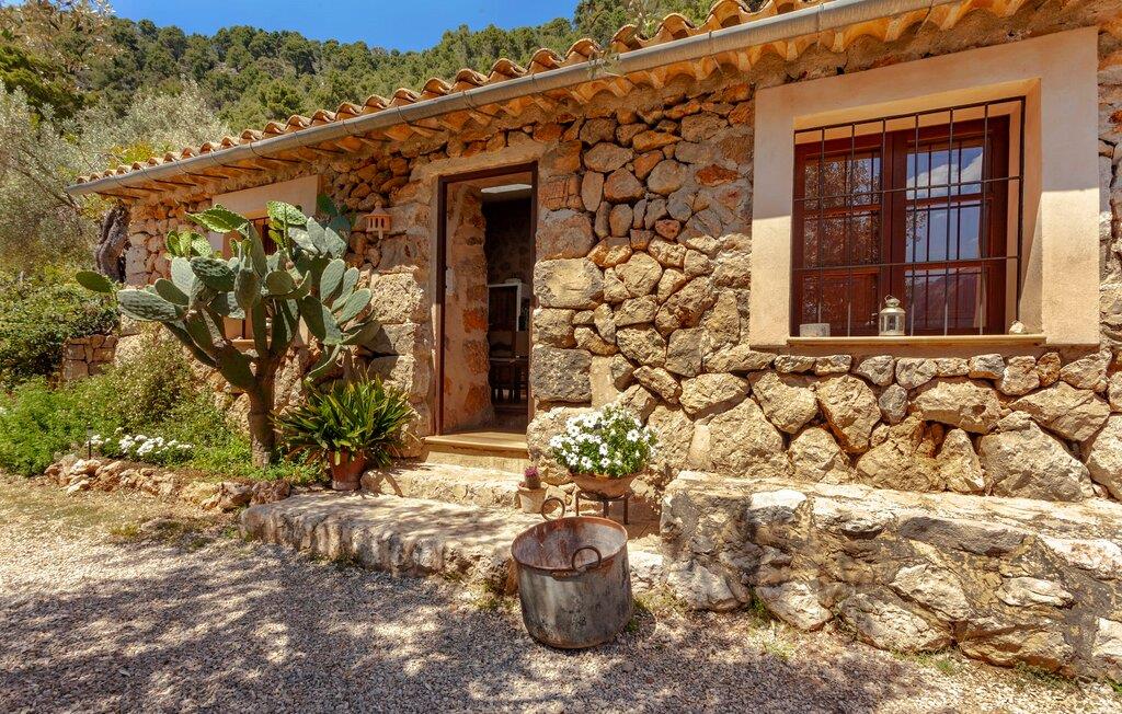 Denna lilla, högt belägna bergsoas av lugn och ro gör ett magiskt intryck, inbäddad i Tramuntana-bergens imponerande bakgrund med rustik elegans. Hitta din favoritplats under ett knotigt olivträd eller på den luftiga, täckta terrassen och njut av lugnet och tystnaden runt denna underbara plats, utsikten över dalen, bergen och skogarna till fullo. Lyssna till fågelsången och upplev den lugnande effekten av en vild och romantisk miljö som du inte hittar någon annanstans. De naturliga stenväggarna, de utspridda blomkrukorna och den rustika grinden ramar in ditt tillfälliga smycke på ett pittoreskt sätt och skapar en vild romantisk känsla. Under de hängande lamporna bredvid den prydliga fontänen är terrassen särskilt frodig på kvällen, särskilt om du förbereder några medelhavsdelikatesser på grillen och sedan njuter av dem när dagen går mot sitt slut.