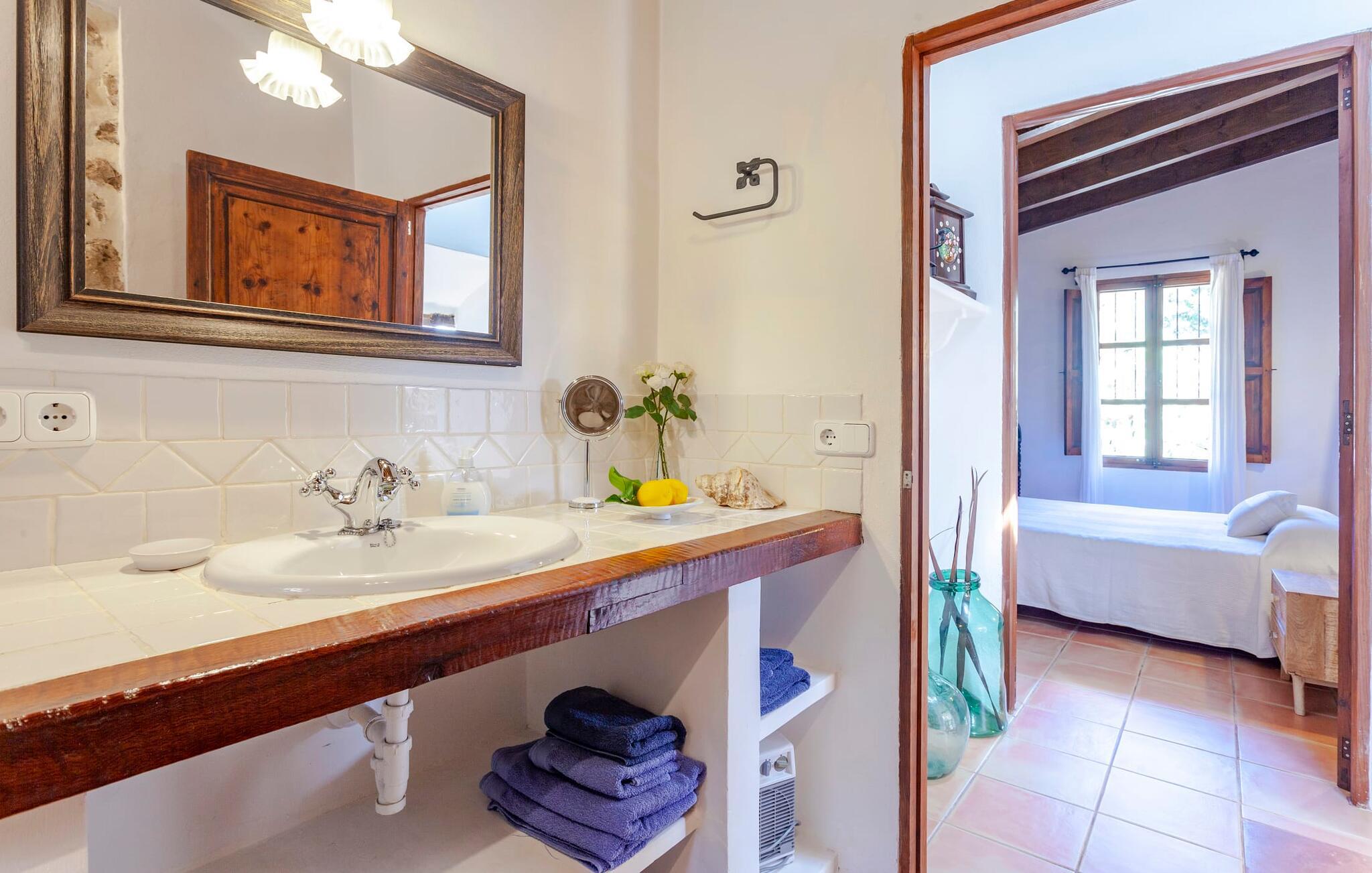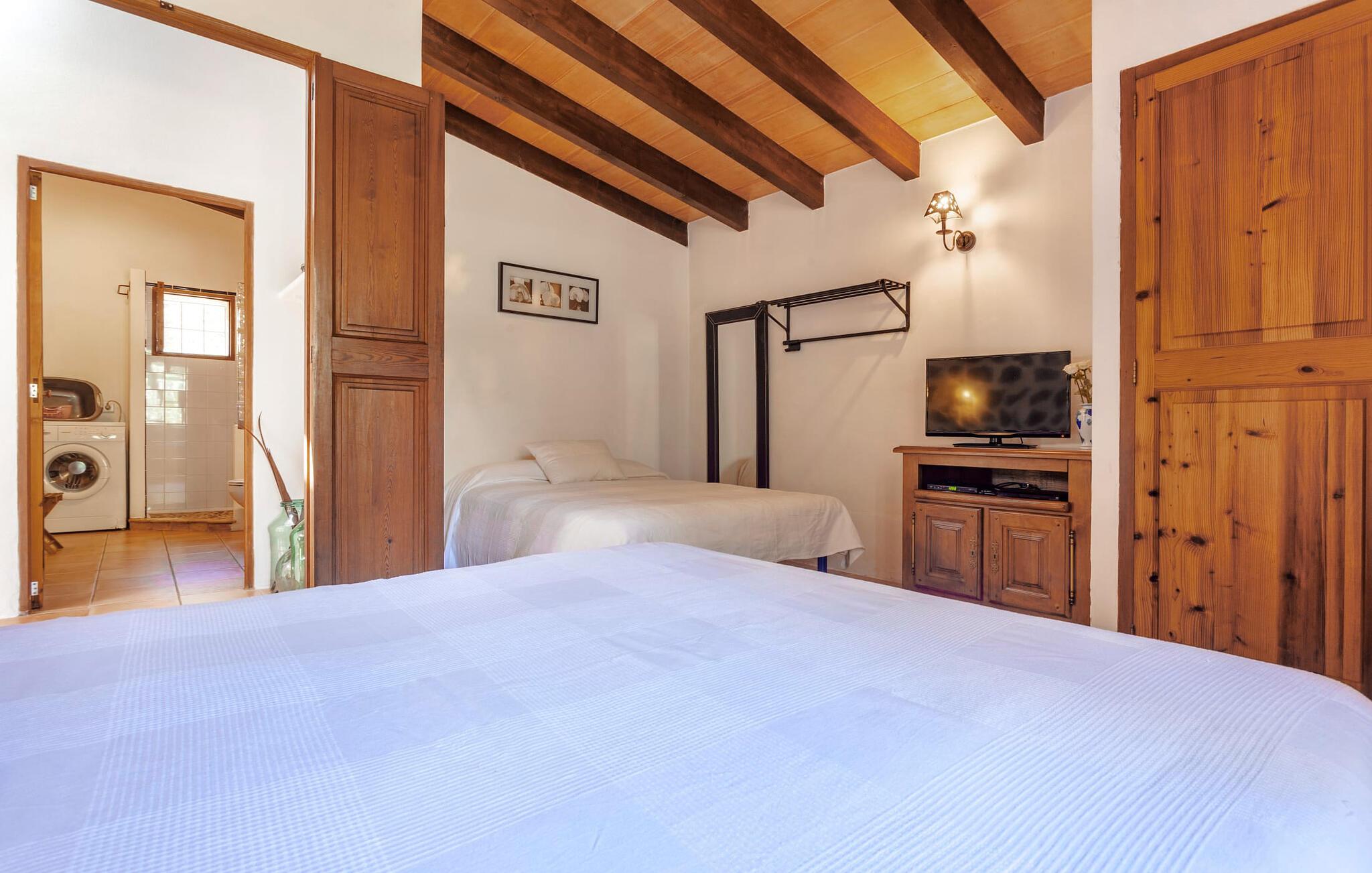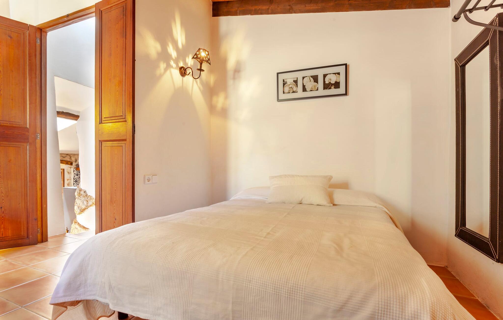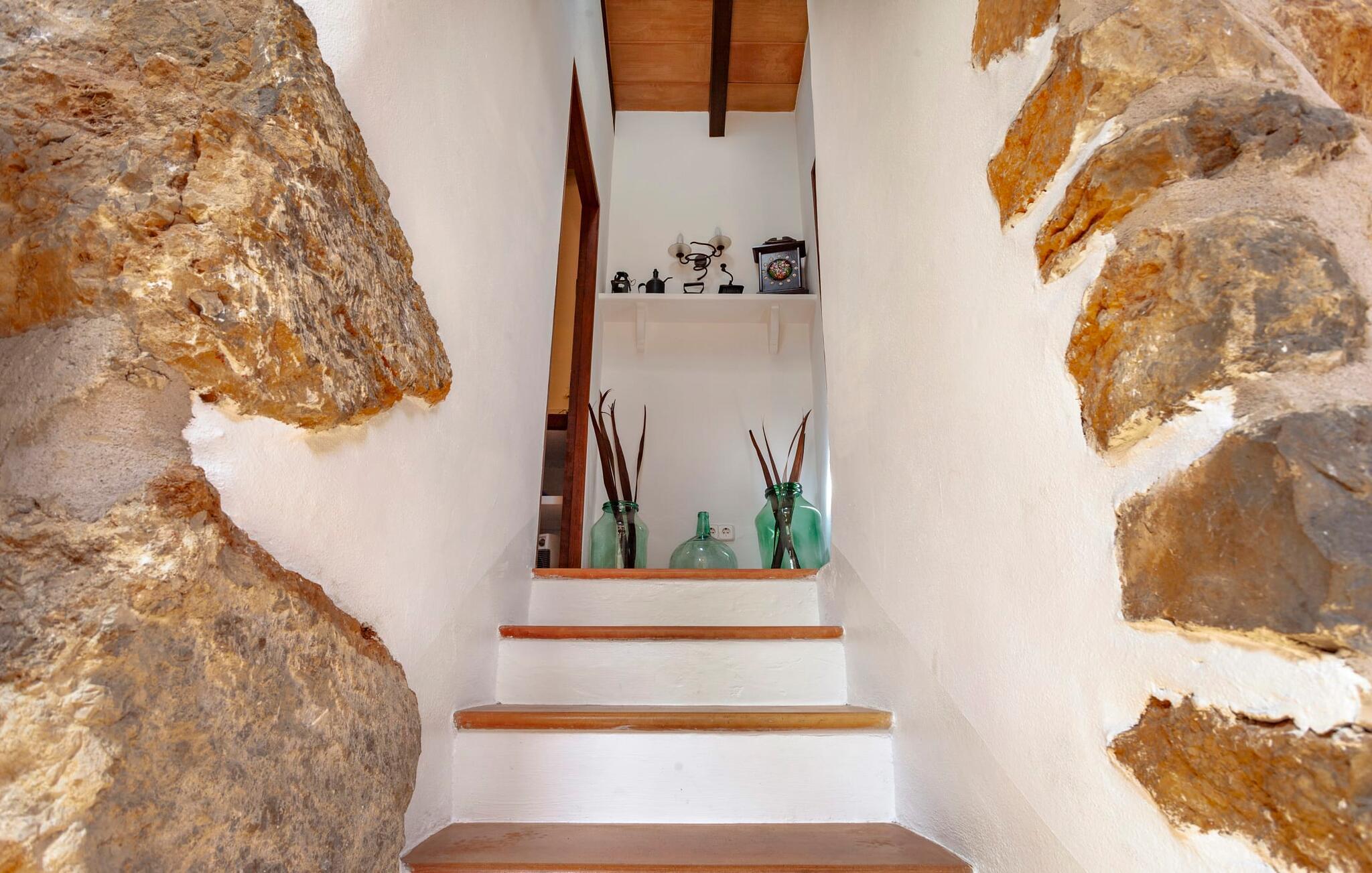 Denna lilla, högt belägna bergsoas av lugn och ro gör ett magiskt intryck, inbäddad i Tramuntana-bergens imponerande bakgrund med rustik elegans. Hitta din favoritplats under ett knotigt olivträd eller på den luftiga, täckta terrassen och njut av lugnet och tystnaden runt denna underbara plats, utsikten över dalen, bergen och skogarna till fullo. Lyssna till fågelsången och upplev den lugnande effekten av en vild och romantisk miljö som du inte hittar någon annanstans. De naturliga stenväggarna, de utspridda blomkrukorna och den rustika grinden ramar in ditt tillfälliga smycke på ett pittoreskt sätt och skapar en vild romantisk känsla. Under de hängande lamporna bredvid den prydliga fontänen är terrassen särskilt frodig på kvällen, särskilt om du förbereder några medelhavsdelikatesser på grillen och sedan njuter av dem när dagen går mot sitt slut.