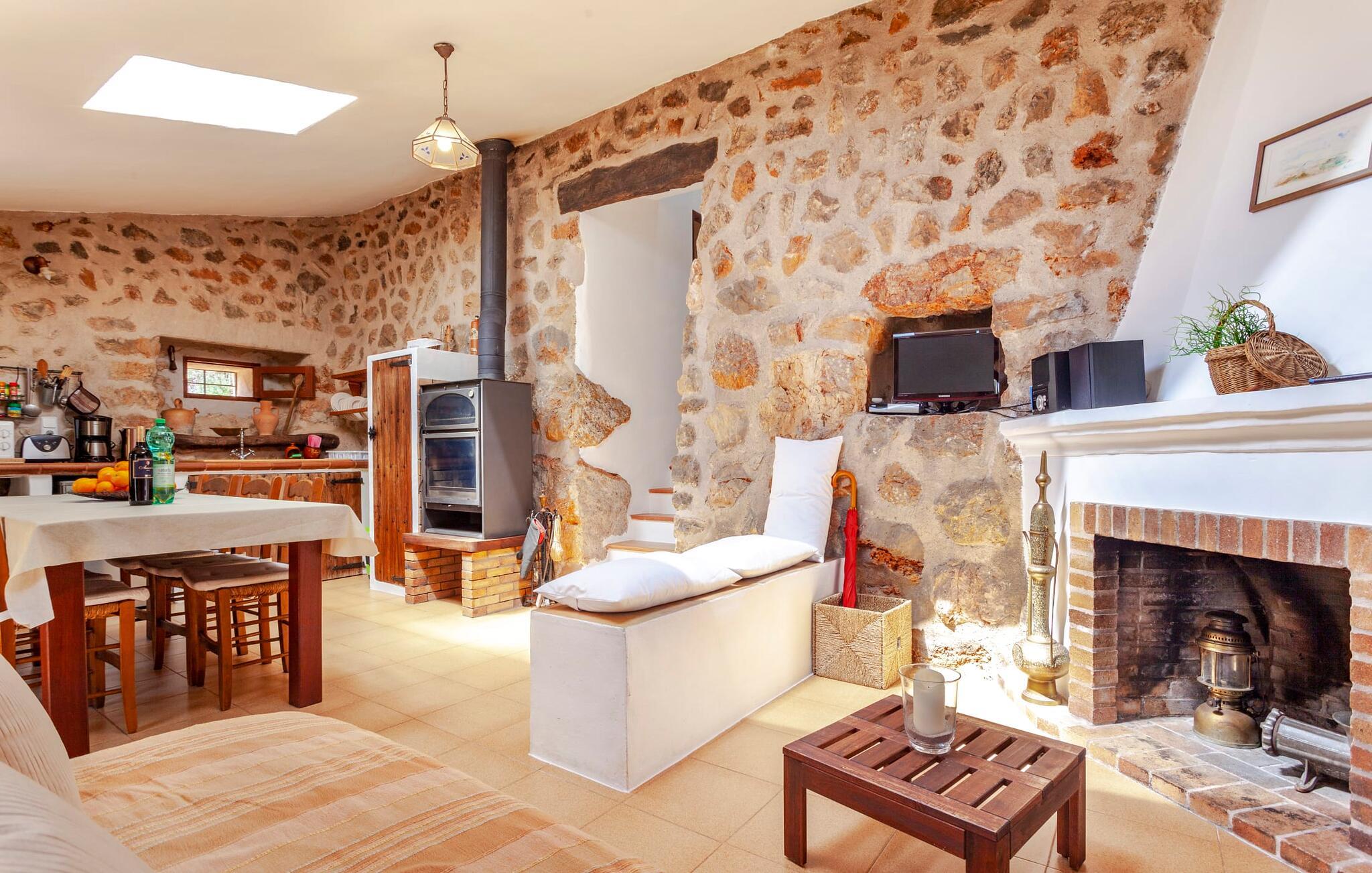 Du kommer också att upptäcka autentisk känsla i vardagsrummen med massor av natursten och trä. Vita väggar, tak med synliga bjälkar, vackra stora golvplattor, rustika trappsteg och ljusa, noggrant samordnade tyger erbjuder modern komfort och skapar en absolut lugnande harmoni. De naturliga stenväggarna säkerställer också optimal temperaturreglering. Det öppna, rustika köket är välutrustat och ugnen som är installerad här värmer inte bara huset under kalla dagar, utan är också perfekt för att förbereda måltider (den öppna spisen är också en härlig dekorativ funktion). Du kan tillbringa avkopplande kvällar i soffan i andra änden av det mysiga rummet. Från vardagsrummet/matsalen leder några trappsteg upp till det eleganta sovrummet, som är inrett med två dubbelsängar; det dagsljusöppna badrummet med dekorativt brett handfat och dusch ligger direkt intill. Den tilltalande naturstensestetiken fortsätter även i detta rum.