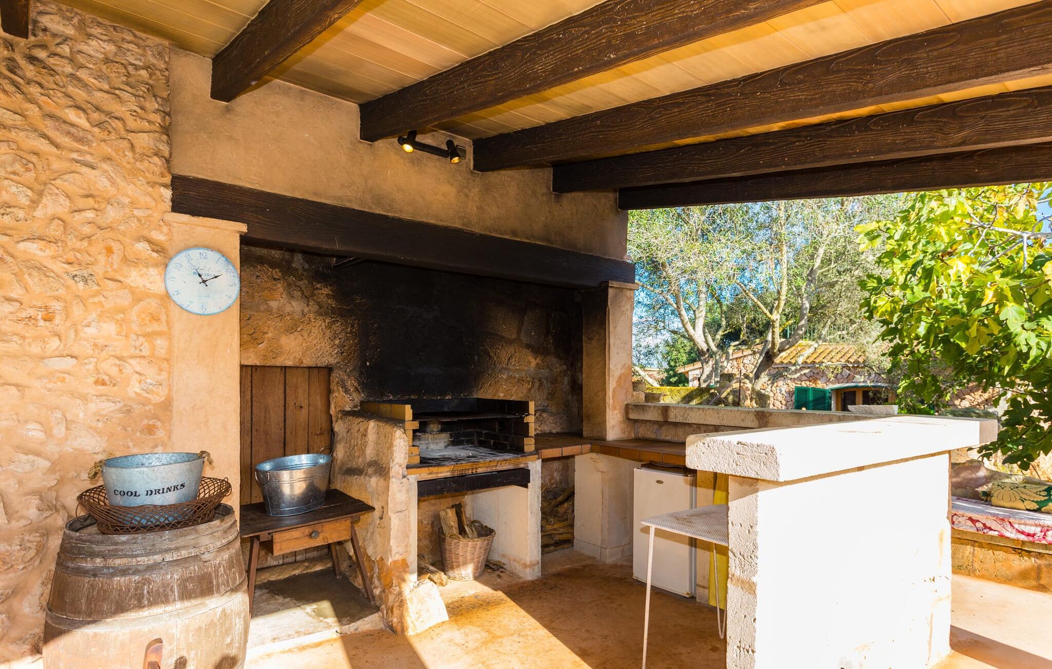 Du kommer att älska detta söta lilla semesterhus med sina vackra gröna fönsterluckor från det ögonblick du anländer. Det ligger i en villa som är över 100 år gammal och har smakfullt restaurerats i enlighet med lokal tradition och omgivningarna. Semesterhuset är omgivet av ett idylliskt naturlandskap med en fruktträdgård och till och med några glada kycklingar som strövar runt fastigheten. Den vackra gemensamma poolen är också tillgänglig för de andra fem lägenheterna på egendomen: Sa Cova Cabrera, Sa Cova Mallorca, Sa Cova Menorca, Sa Cova Tagomago och Sa Cova Ibiza. Om du föredrar något lite mer aktivt, är de vackra omgivningarna perfekta för långa promenader genom landskapet, förbi de pittoreska små väderkvarnarna som är så typiska för denna region. På kvällen är det praktiska utomhusköket den perfekta platsen för att förbereda en överdådig grillfest.
