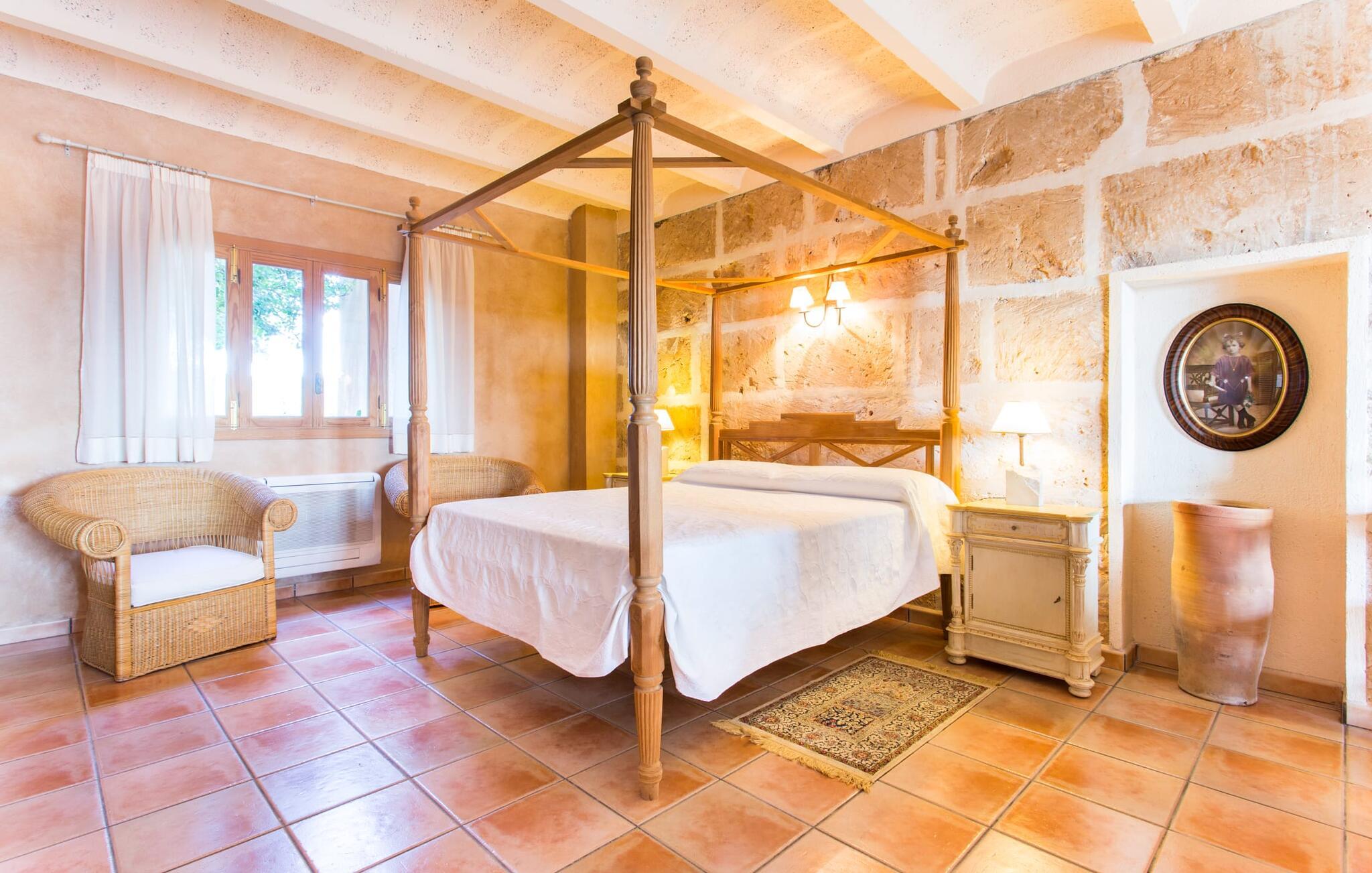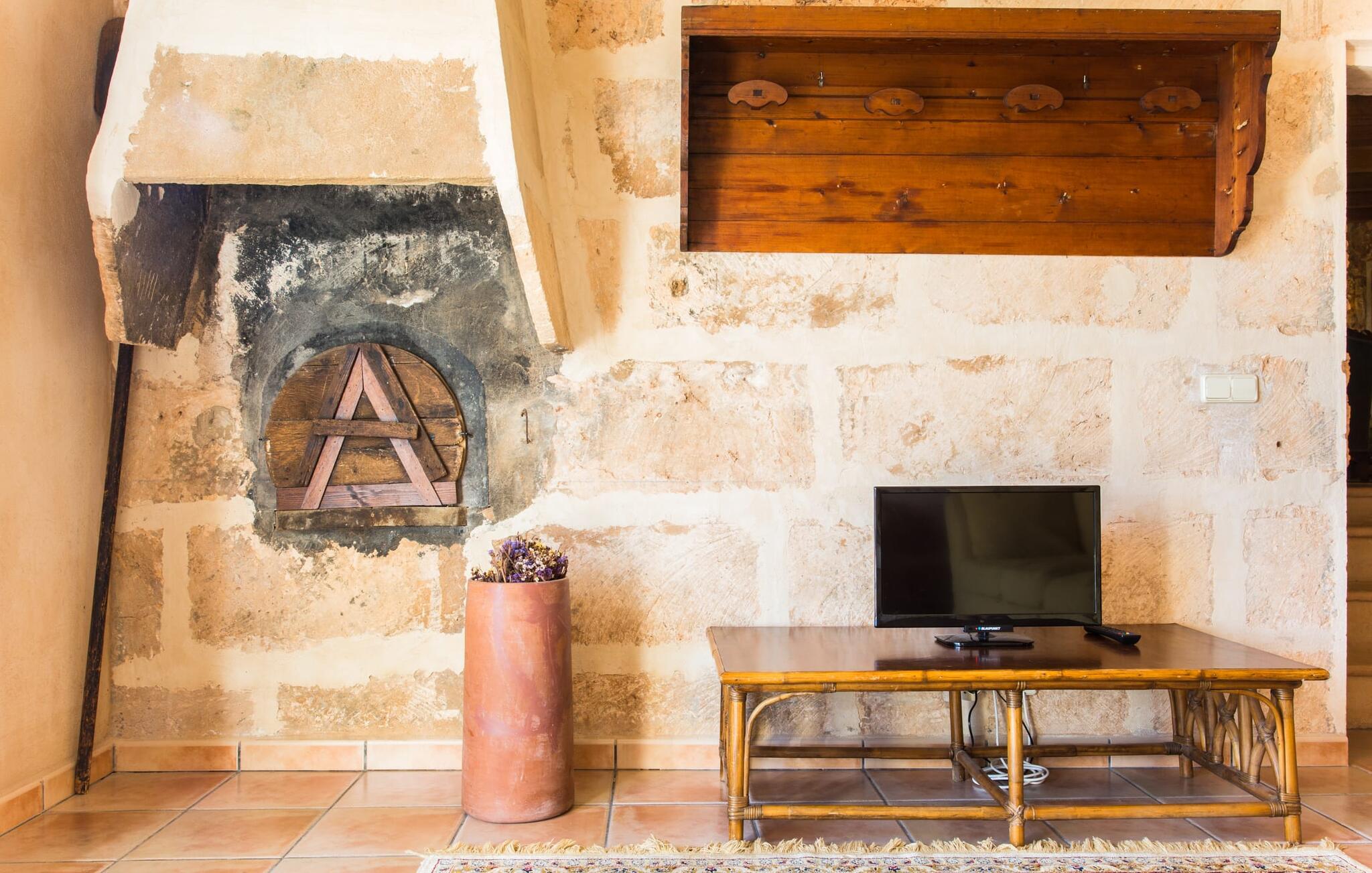 Det charmiga semesterhuset Sa Cova Formentera utstrålar sin ursprungliga lanthuskänsla: rustika takbjälkar, naturstenväggar, typiska mallorcanska plattor och mycket trä. De stora fönstren släpper in mycket naturligt ljus i rummen och understryker medelhavsatmosfären. Denna lägenhet erbjuder två inomhusalternativ: du kan äta dina måltider i den separata matsalen eller i det ljusa och luftiga köket, som är perfekt utrustat för självhushåll. Det enkla men vackert inredda sovrummet med sin himmelssäng inbjuder till drömmar. Till sovrummet hör också en vardagsrumsdel med TV, som kan skiljas från sovdelen med en träskärm. Badrummet är en-suite; en naturstensvägg, som harmonierar perfekt med den gyllene spegeln, ger badrummet sin förtrollande känsla. Varje rum i detta semesterhus har utformats så att du alltid känner att du är där du är: mitt i det autentiska Mallorca. Långt borta från de ansiktslösa fasaderna som förstör landskapet i turistområdena.