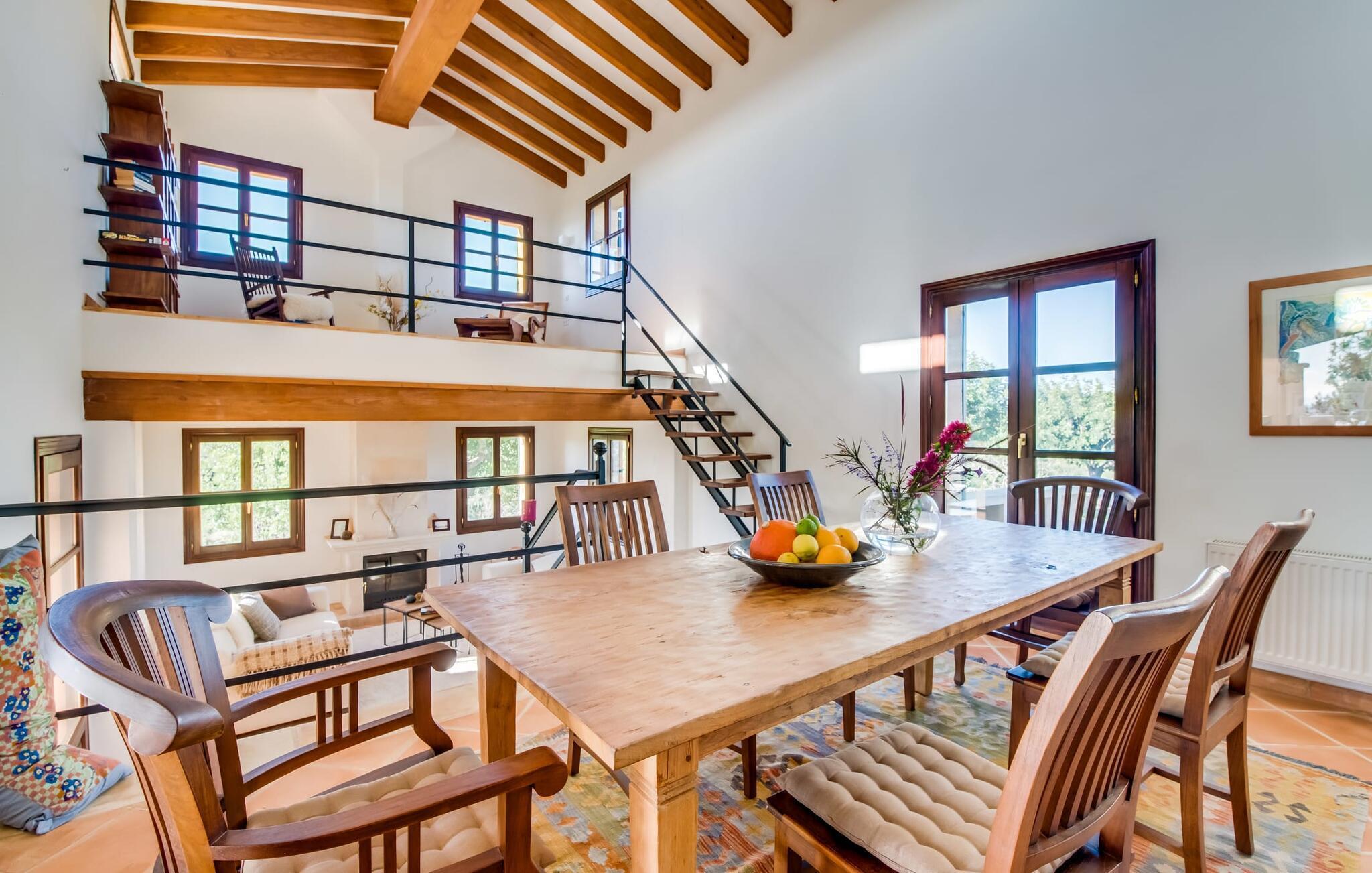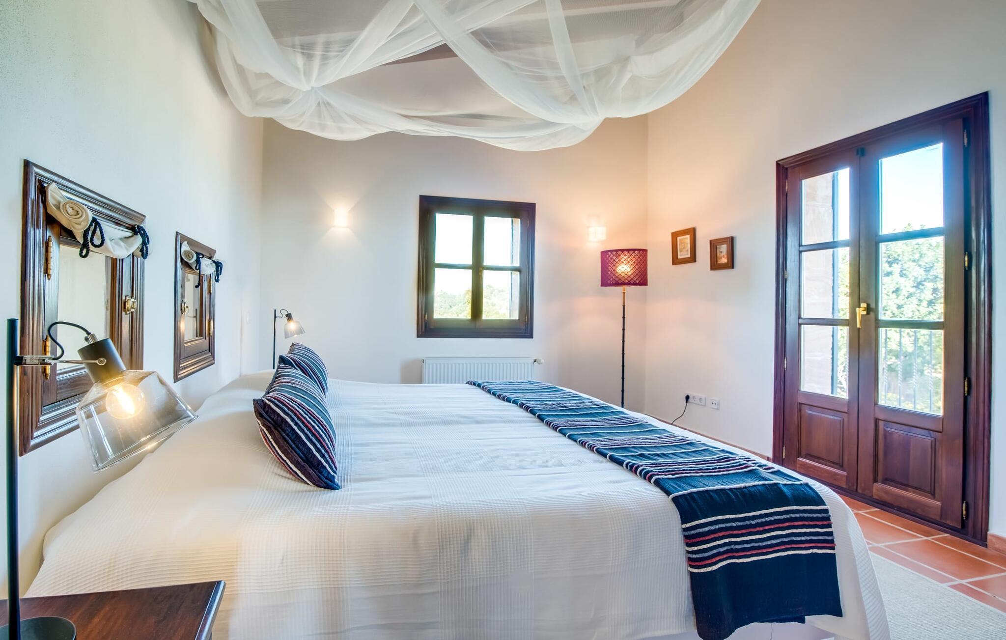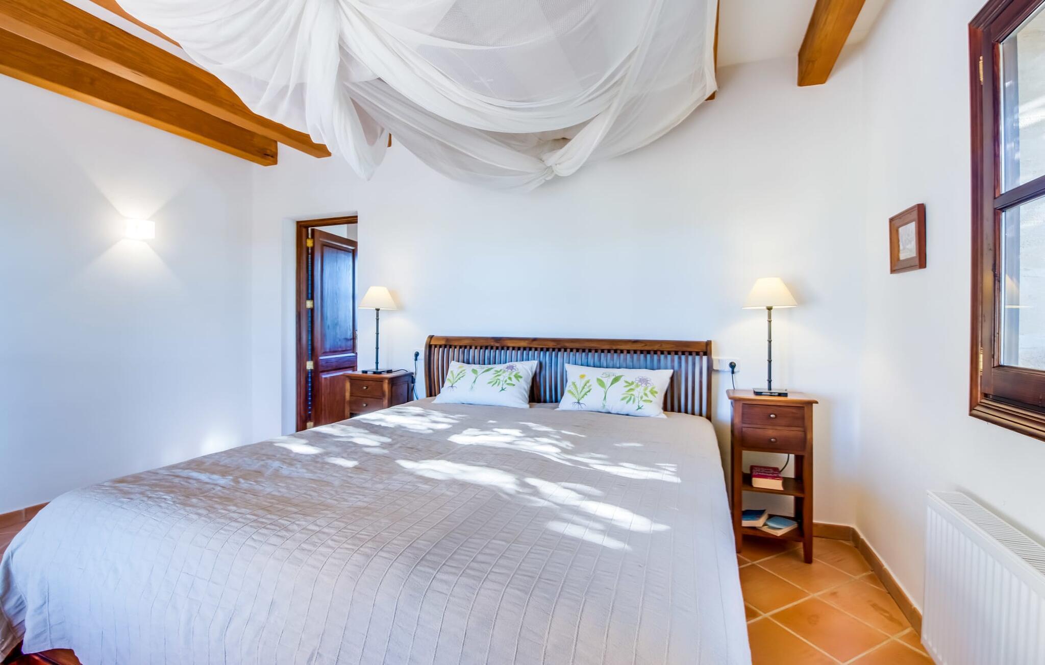 Invändigt imponerar "Son Net" med sin eleganta, högkvalitativa design och atmosfär. Terracottaplattor, synliga träbjälkar och ljusa, luftiga rum med högkvalitativa möbler skapar en harmonisk accent. Matplatsen leder direkt till ett galleri med ett mysigt bibliotek, som erbjuder en fantastisk utsikt över det omgivande området. Några steg leder ner till vardagsrummet med bekväma soffor och en öppen spis. Det moderna köket är fullt utrustat för självhushåll och har även ett filtersystem för dricksvatten. Ett dubbelrum med eget badrum med badkar ligger på bottenvåningen, medan ytterligare två dubbelrum med balkonger som delar badrum ligger på övervåningen. Båda badrummen har duschutrymmen med nivååtkomst. Alla sängar är försedda med toppers för extra komfort.