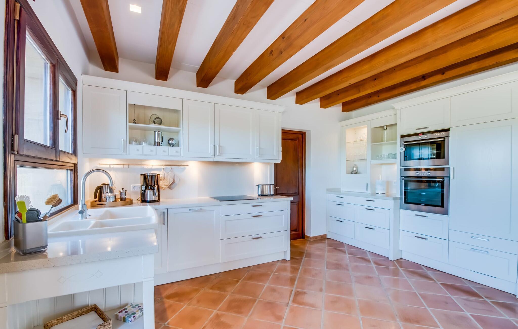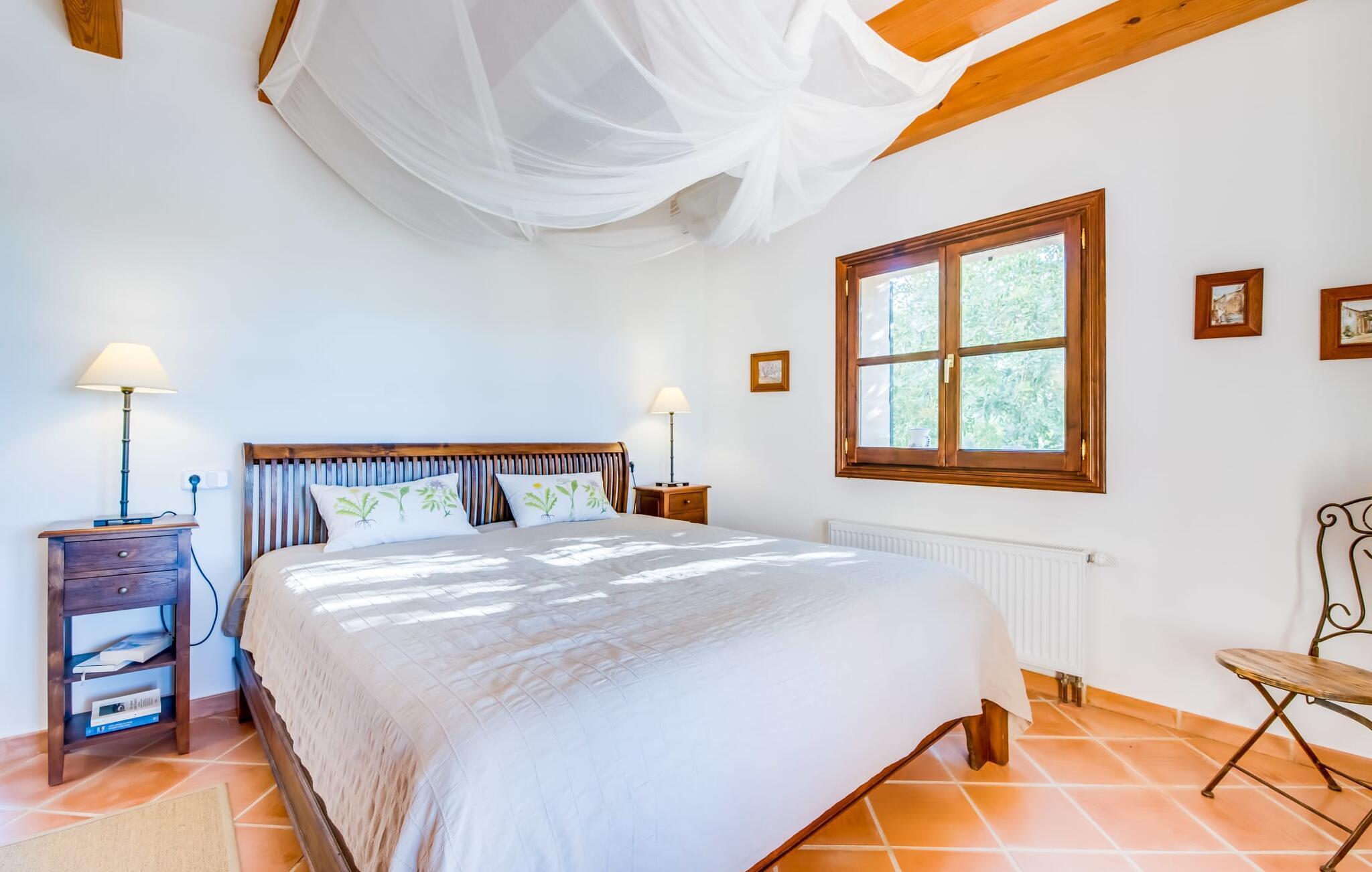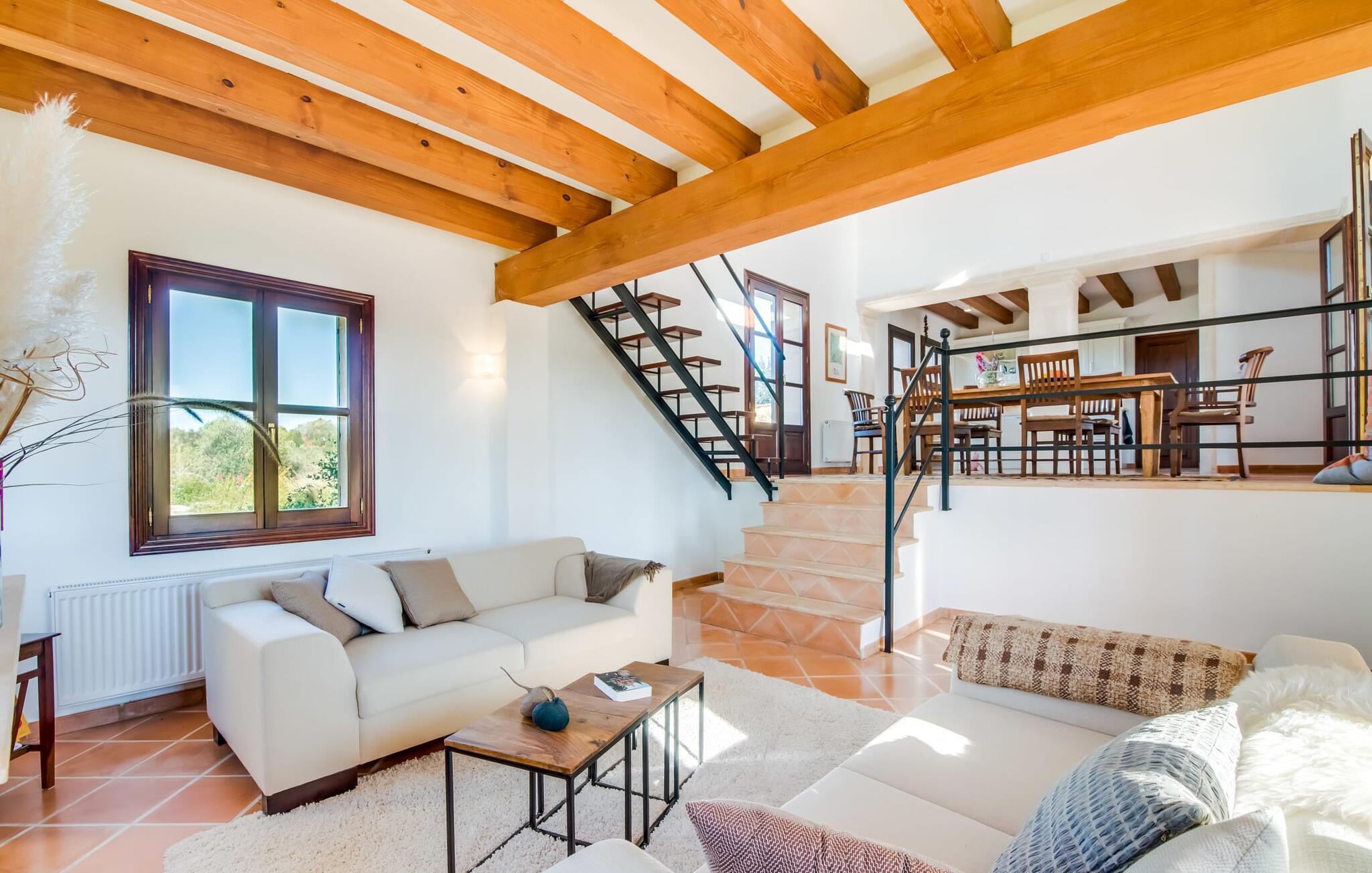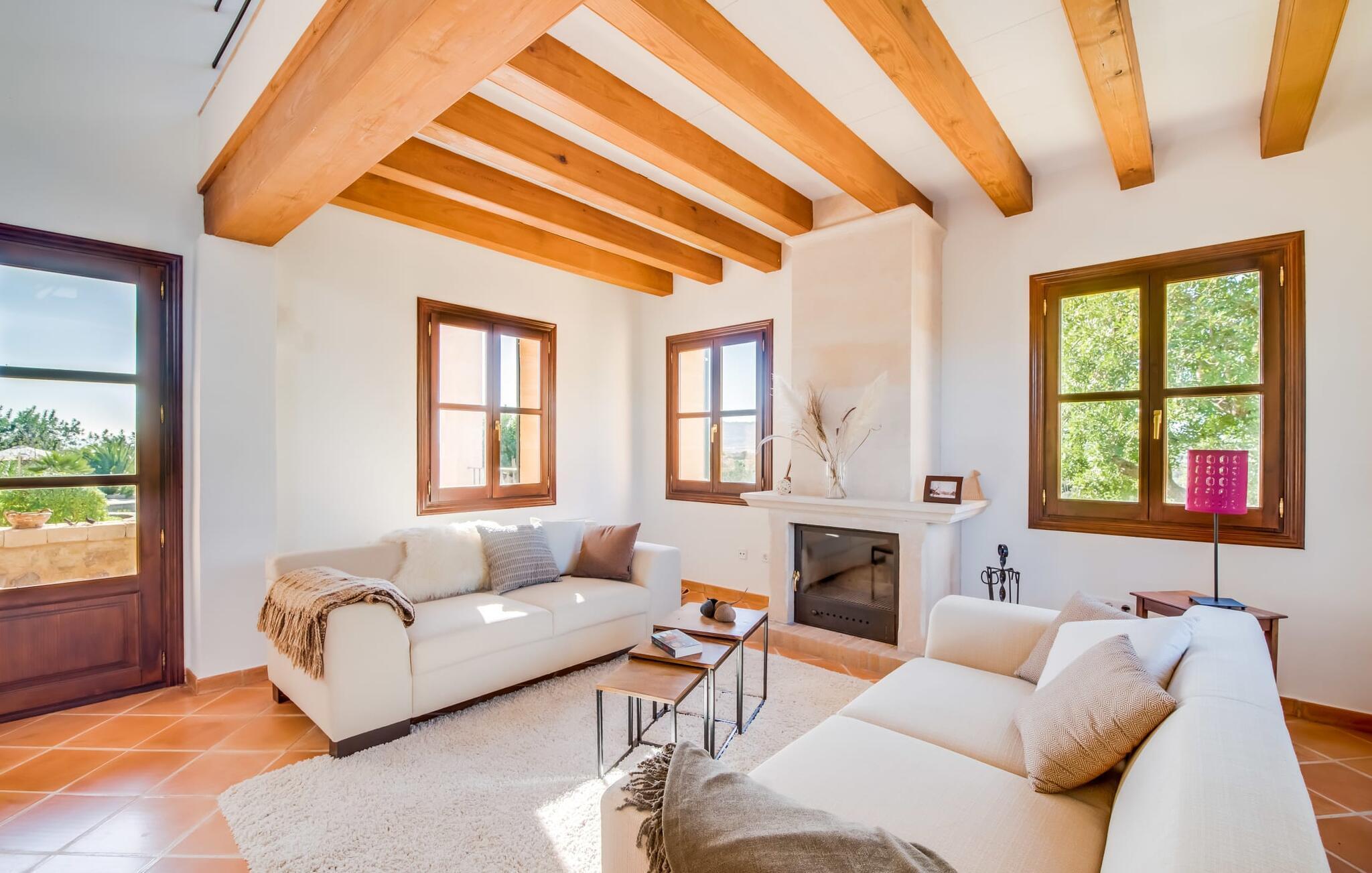 Invändigt imponerar "Son Net" med sin eleganta, högkvalitativa design och atmosfär. Terracottaplattor, synliga träbjälkar och ljusa, luftiga rum med högkvalitativa möbler skapar en harmonisk accent. Matplatsen leder direkt till ett galleri med ett mysigt bibliotek, som erbjuder en fantastisk utsikt över det omgivande området. Några steg leder ner till vardagsrummet med bekväma soffor och en öppen spis. Det moderna köket är fullt utrustat för självhushåll och har även ett filtersystem för dricksvatten. Ett dubbelrum med eget badrum med badkar ligger på bottenvåningen, medan ytterligare två dubbelrum med balkonger som delar badrum ligger på övervåningen. Båda badrummen har duschutrymmen med nivååtkomst. Alla sängar är försedda med toppers för extra komfort.
