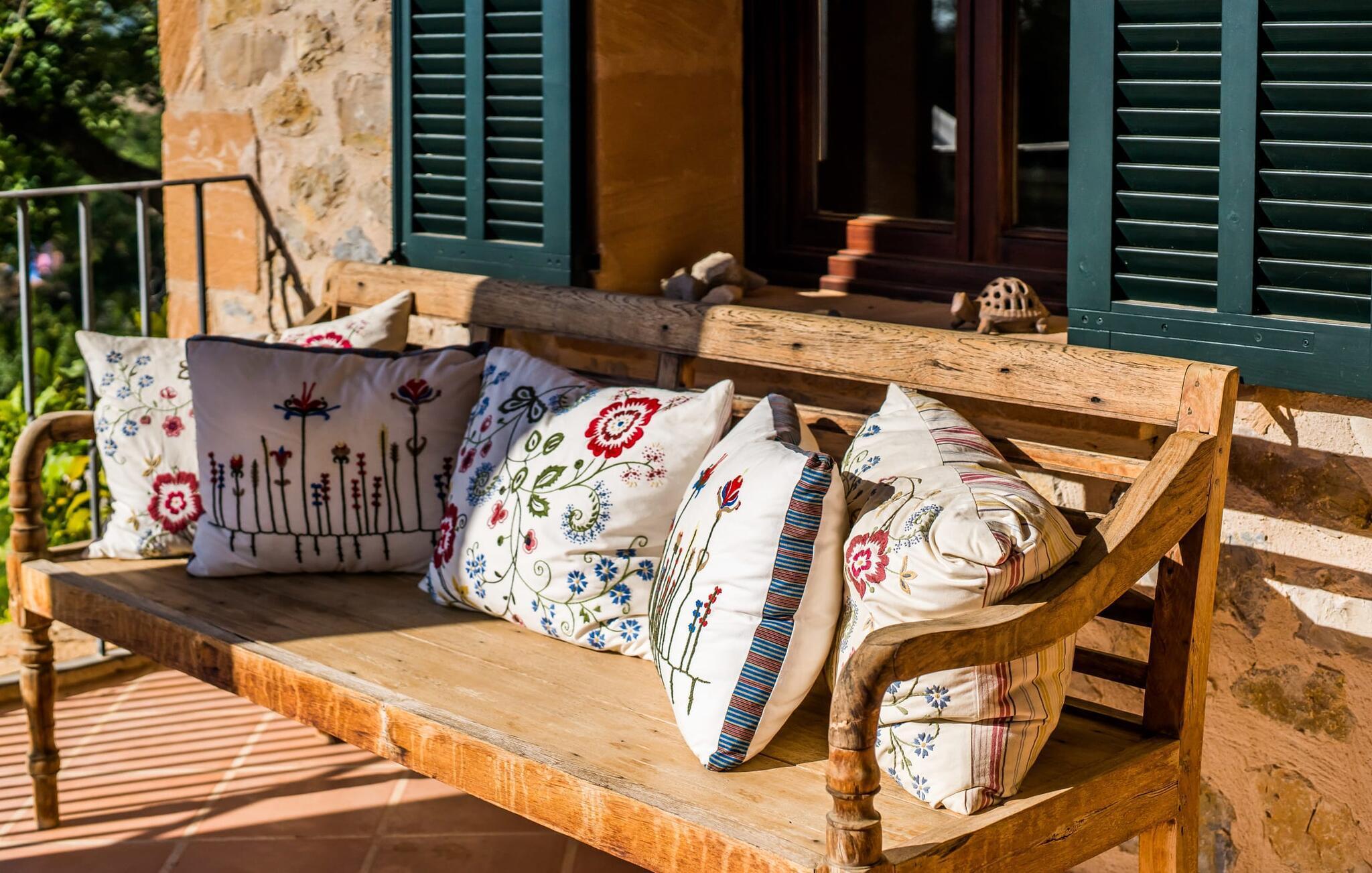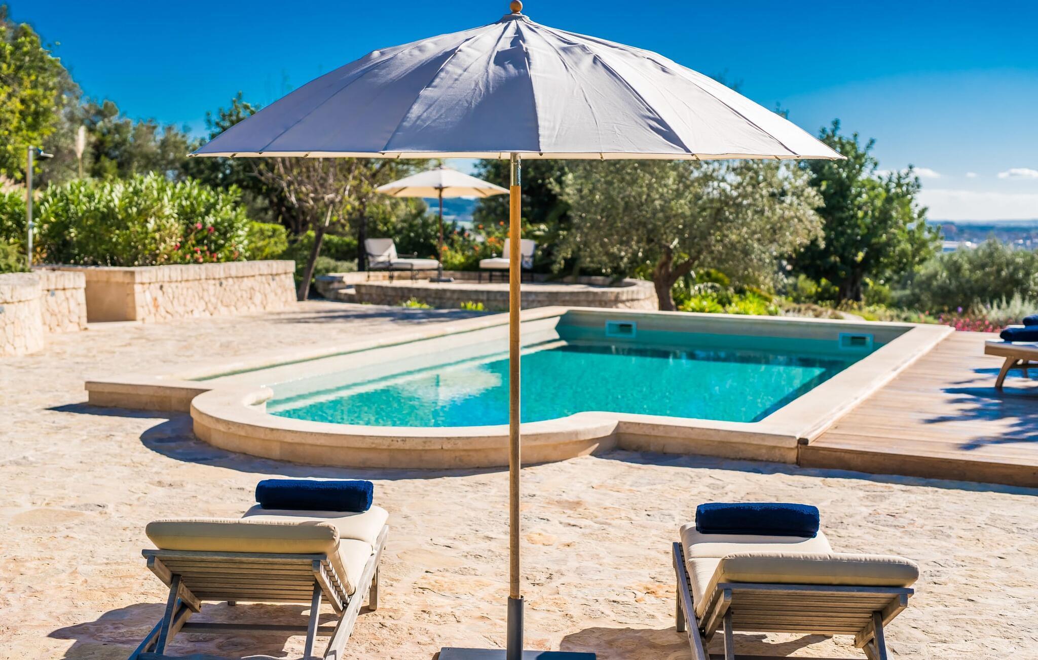 Den vidsträckta tomten har flera nivåer med öppna och täckta terrasser, perfekt för avkoppling. Njut av den vackert designade solplatsen i teak bredvid poolen eller ta en avkopplande promenad genom den rymliga trädgården, som inbjuder till att dröja sig kvar i olika sittgrupper. En stor, täckt balkong på första våningen erbjuder en fantastisk panoramautsikt över fastigheten och den omgivande landsbygden. Du hittar en skuggig plats för din bil i det befintliga garaget.