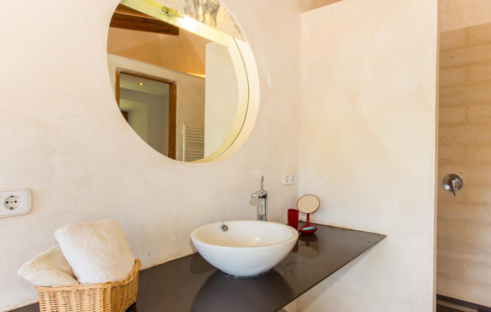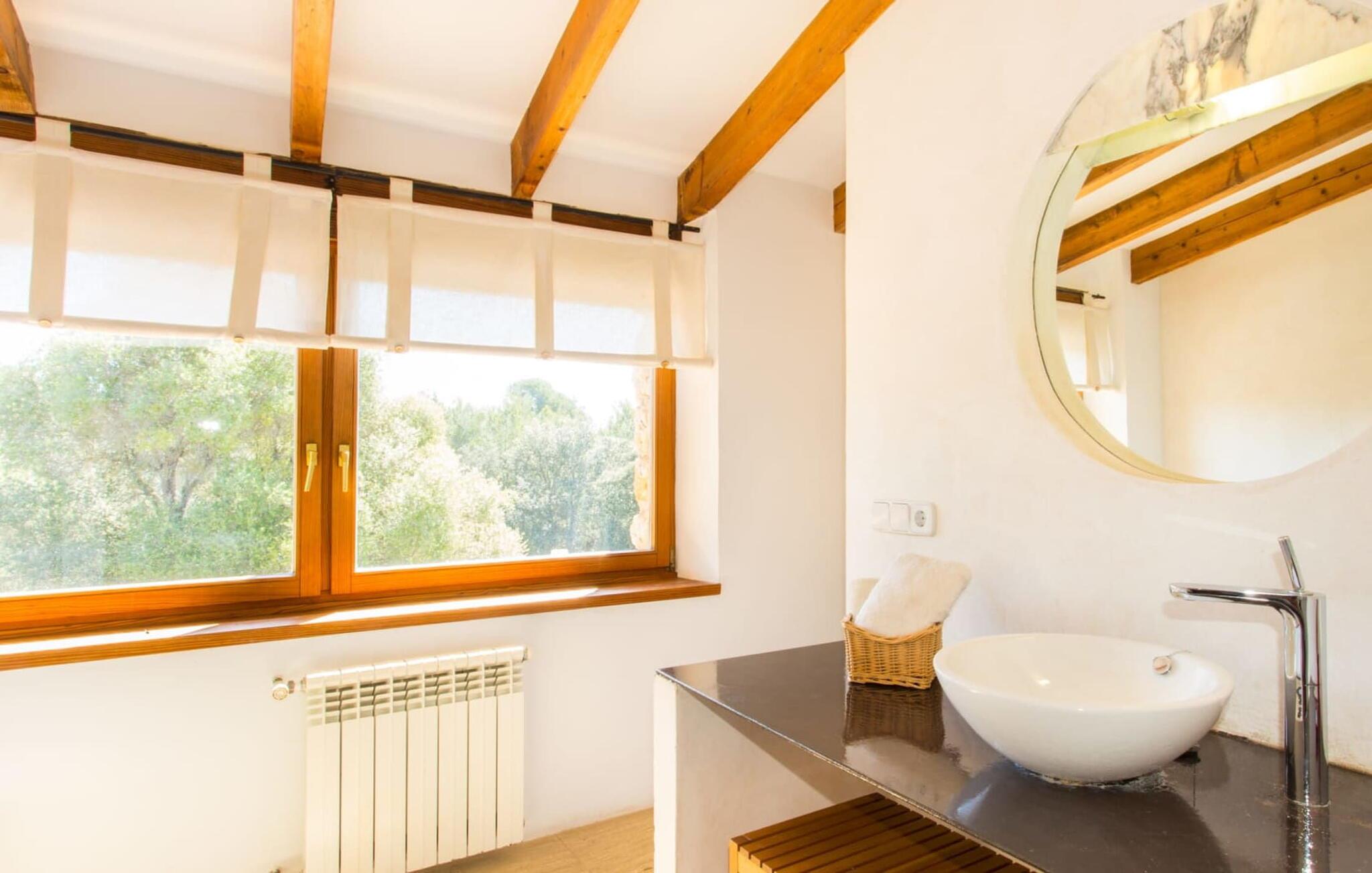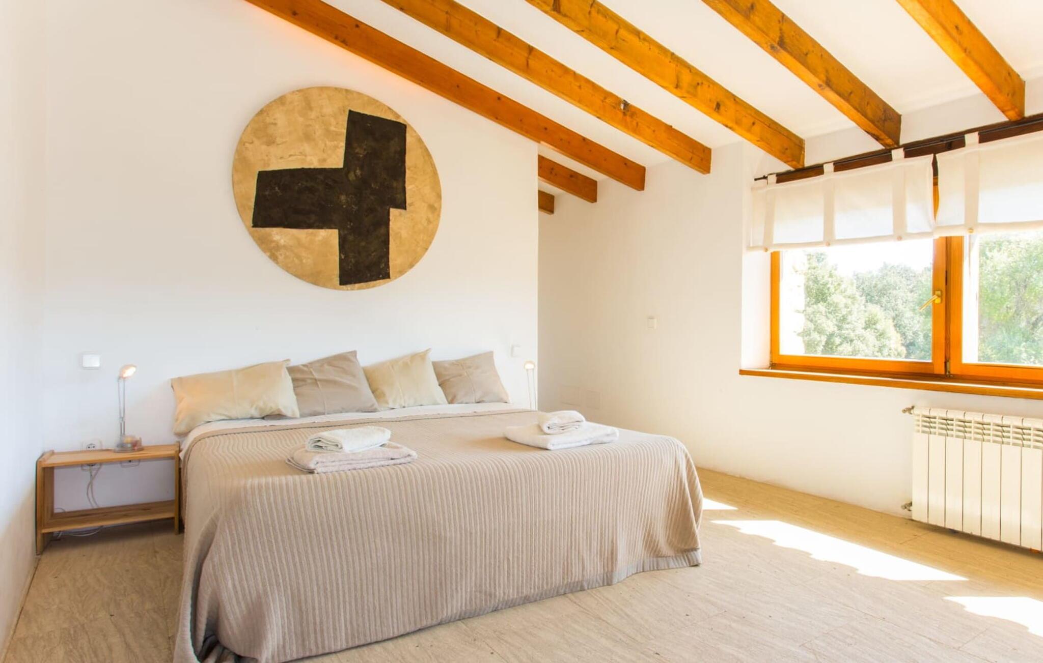 Minimalister och purister kommer att älska inredningen i Son Pastor, eftersom den fungerar som av sig själv; det finns inga onödiga möbler, mycket vitt, mycket trä, enstaka (grafisk) konst på väggarna eller utspridd i rummet. Kontrasten mot den frodiga växtligheten utanför skapar rymd och klarhet, samtidigt som stora fönster släpper in ljus och luft i hela huset. Det solgula högprestandaköket med side-by-side-kylskåp och biblioteket, som även fungerar som arbetsrum, ger färg och rörelse till hemmet. Den här typen av miljö uppmuntrar till kreativitet och inspiration. Runt köket finns ett vardagsrum med öppen planlösning, uppdelat i flera mindre rum, som gränsar till en separat tvättstuga med tvättmaskin. I denna del av huset finns ett stort matbord, en hörna med öppen spis, en TV-soffa och flera enkla sittgrupper, vilket gör det till ett utmärkt val för grupper. På första våningen delar fem sovrum med enkel- eller dubbelsängar och delvis tillgång till en liten, utsökt terrass tre ultramoderna badrum (två med dusch och badkar och ett på bottenvåningen). Kort sagt: här finns gott om plats för gäster som uppskattar det speciella i livet!