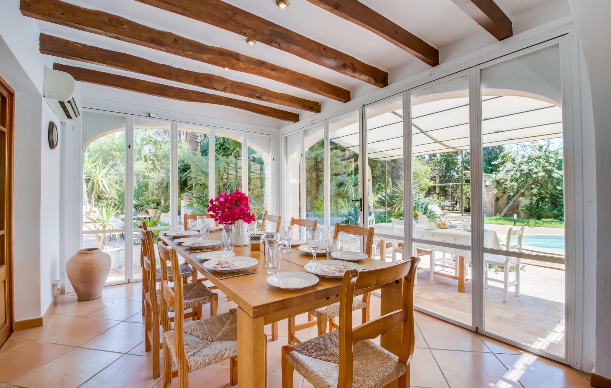 Vinterträdgården med sin ljusa glasfasad och öppna spis är också en underbart mysig plats för gemytliga stunder. Tillträde sker via det stora köket med matlagningsö, som uppfyller även de högsta kraven. Inspirerad av uppfinningsrikedomen i detta utrymme kommer du äntligen att hitta tid att prova några av de mer komplicerade rätterna! Villans vardagsrum har en rustik känsla med ett välvt tak som påminner om medeltida vintavernor. Om du vill avsluta dagen med att koppla av med ett glas vin finns det en gungstol och två bekväma vita soffor till ditt förfogande. Hallen med sina rustika träelement och typiska mallorkinska takbjälkar är också ett riktigt blickfång. Tre av sovrummen ligger också på bottenvåningen, varav ett har eget badrum, medan de andra två rummen delar badrum. De tre dubbelrummen på övervåningen har alla ett eget badrum. På denna våning finns också ett modernt vardagsrum med skinnsoffa och platt-TV, så här kan ni tillbringa en spännande filmkväll. Diskreta konstverk och dekorativa element som en åra understryker den maritima karaktären på boendet.