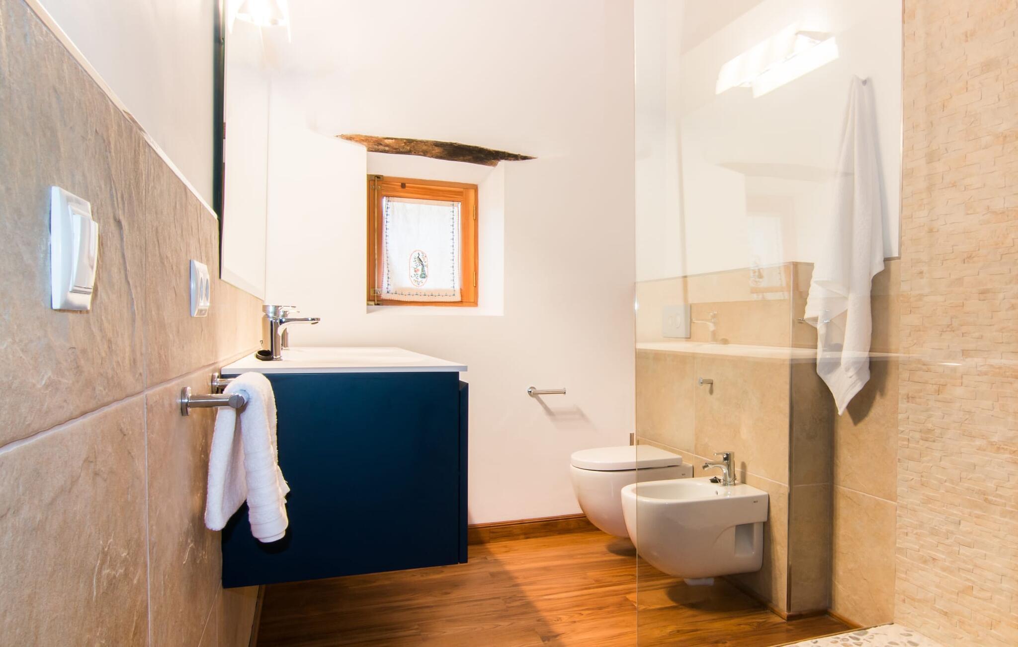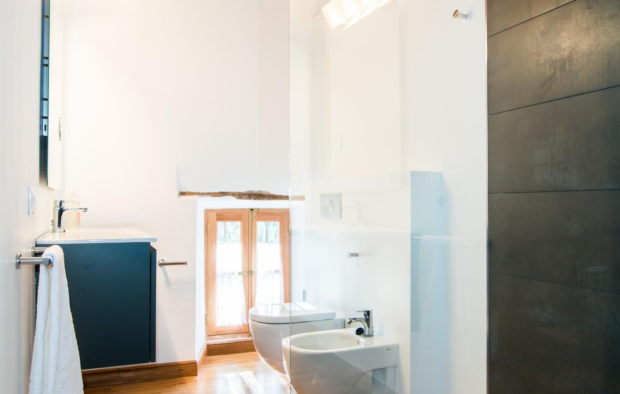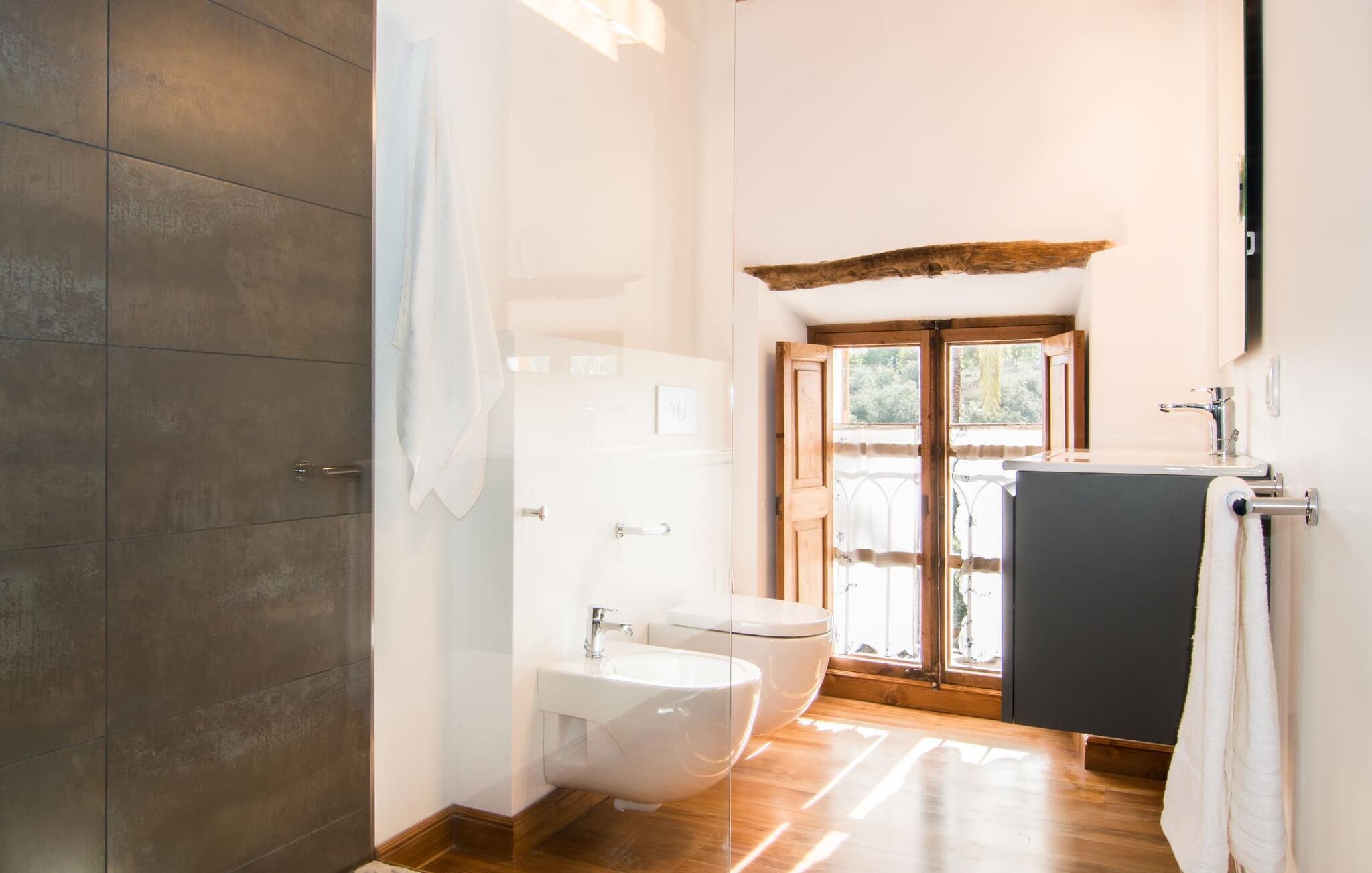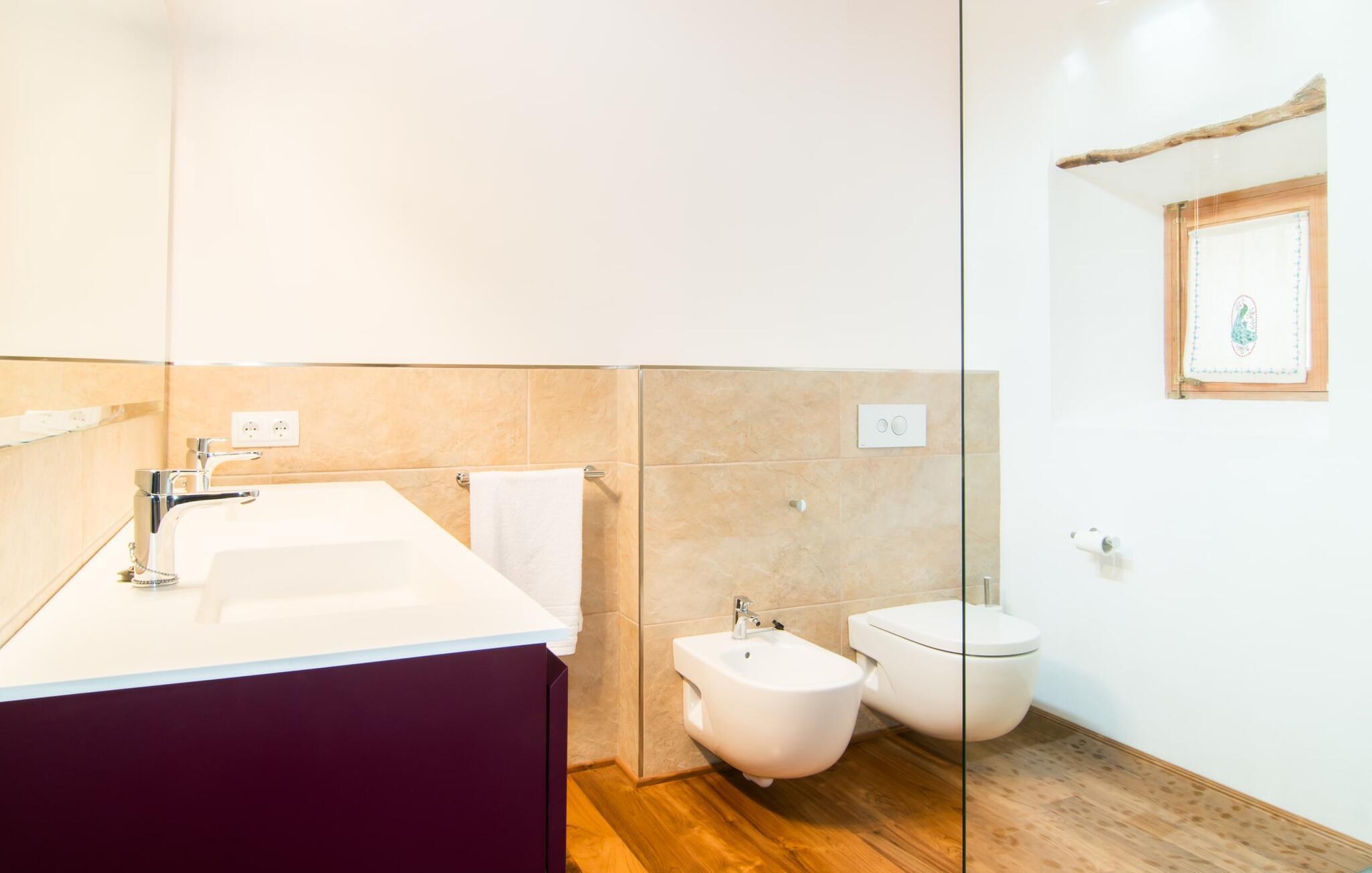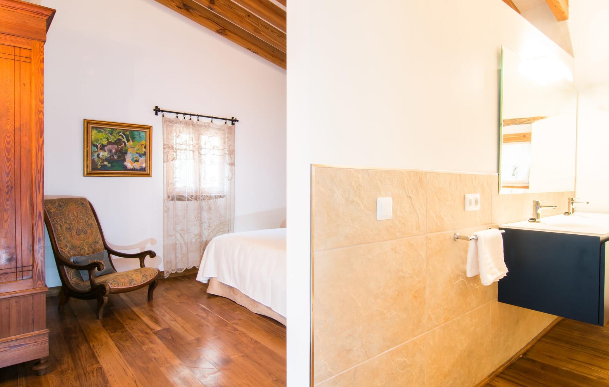 Husets interiör kommer att fängsla gästerna lika mycket som exteriören. Den omsorgsfullt utformade glasdörren leder in till kök, vardagsrum och matplats i öppen planlösning. Köket imponerar med sin ultramoderna design och exklusiva inredning. Den angränsande matplatsen erbjuder tillräckligt med utrymme för en sofistikerad middag för upp till 10 personer. En mysig soffgrupp bakom inbjuder dig att koppla av. Den mycket stora platt-TV:n har satellitanslutning så att du kan underhållas med en bra film när du känner för det. En annan rustik sittgrupp vid den öppna spisen erbjuder ytterligare möjligheter att tillbringa en mysig kväll med vänner. Den lyckade kombinationen av moderna och klassiska element samt naturstenselement och utvalda individuella dekorationer skapar en förtrollande atmosfär i dessa vardagsrum som inbjuder dig att dröja kvar. Sovrummen är, var och en på sitt sätt, små lyxiga oaser med individuella och särskilt estetiska accenter. Den imponerande golv-, vägg- och takdesignen är lika imponerande som de noggrant utvalda möblerna och det skickliga arrangemanget av de enskilda delarna. Nästan alla badrum har ett eget badkar, som alla tävlar om titeln som husets vackraste rum och samtidigt erbjuder toppmodern komfort. Här hittar du högkvalitativa armaturer i kombination med en mycket modern och extravagant design. Strykjärn och hårtorkar finns naturligtvis i huset, så du behöver inte ta med dig dem.