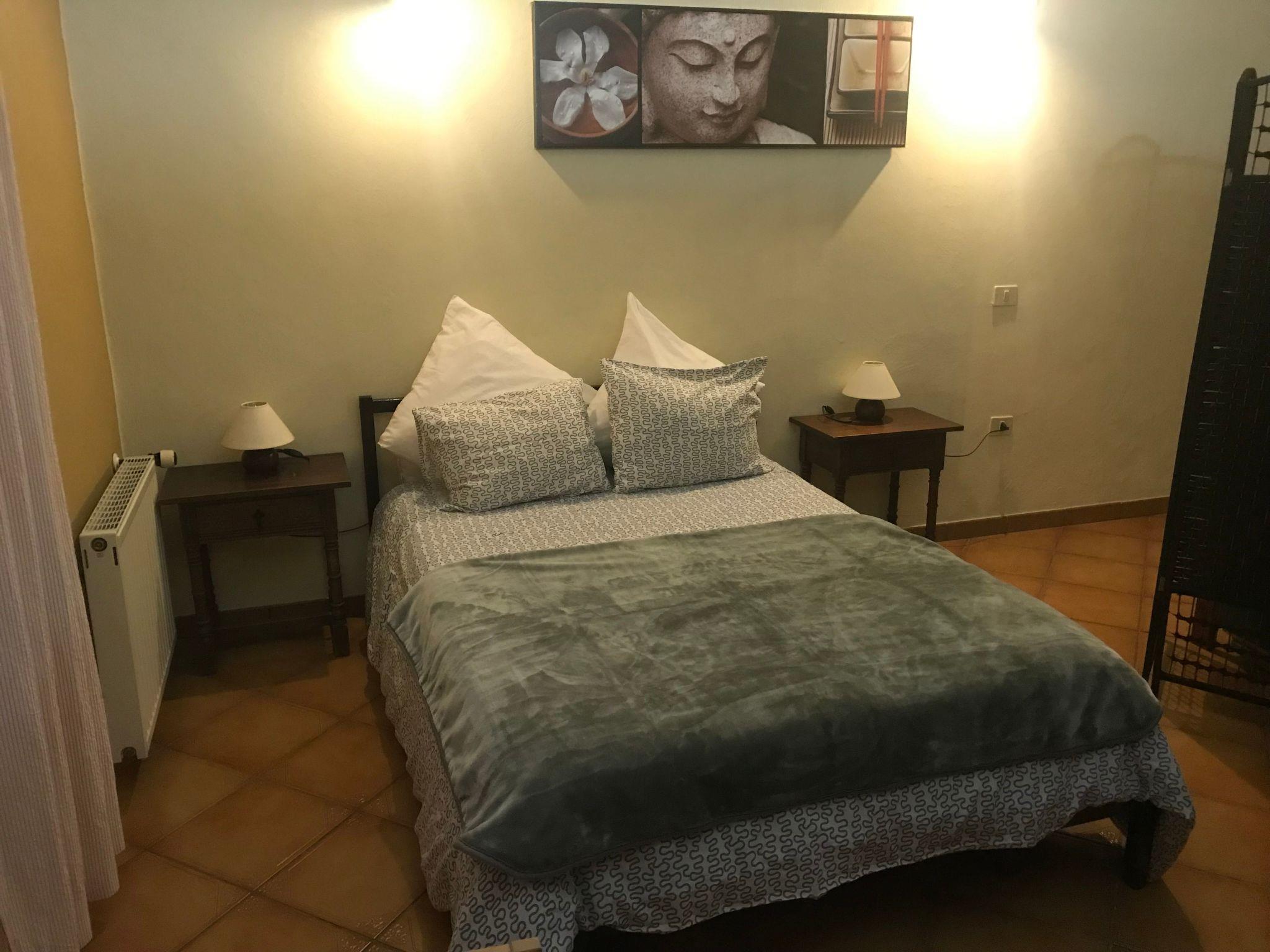 The 70 m² garden apartment is located next to the solar heated pool. It boasts a bedroom with two single beds. The large living/bedroom is furnished with a French bed and a sofa bed for two kids. The fully furnished kitchen unit is equipped with all necessary cooking utensils. There is a stove, a microwave, a coffee maker and a toaster. The dining table lets you enjoy meals together. The large bathroom offers a bathtub, a bidet, a toilet and a vanity.