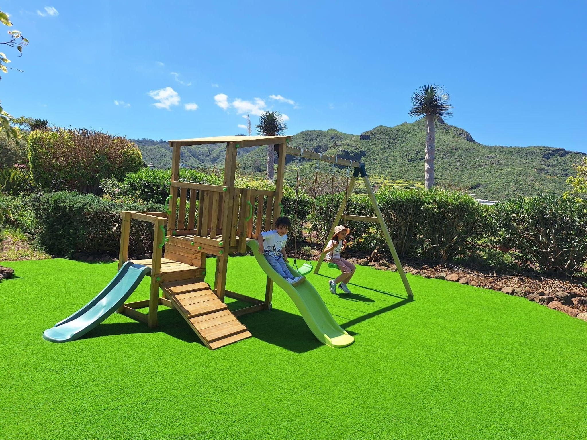 The exterior of the property is no less impressive, with a private path running through the interior to the top of the Picacho de Los Lázaros mountain where you will find its small chapel of Santiago carved into the rock and with spectacular views over the valley of Tegueste and the Anaga mountain range, a Biosphere reserve. This property offers a spacious fruit garden that invites you to spend relaxing afternoons in the open air. For guests who cannot leave their four-legged friends at home, pets are optionally welcome, as long as they are of medium size. In addition, outdoor facilities include a swimming pool and solarium, several terraces and porches with outdoor dining, several barbecues, a play area for the little ones, a communal meeting room and meeting point with satellite TV, ping-pong table, bookshop, kitchen and dining area equipped for large groups and a covered bicycle parking area, creating the perfect environment to enjoy recreational activities without having to go too far away.