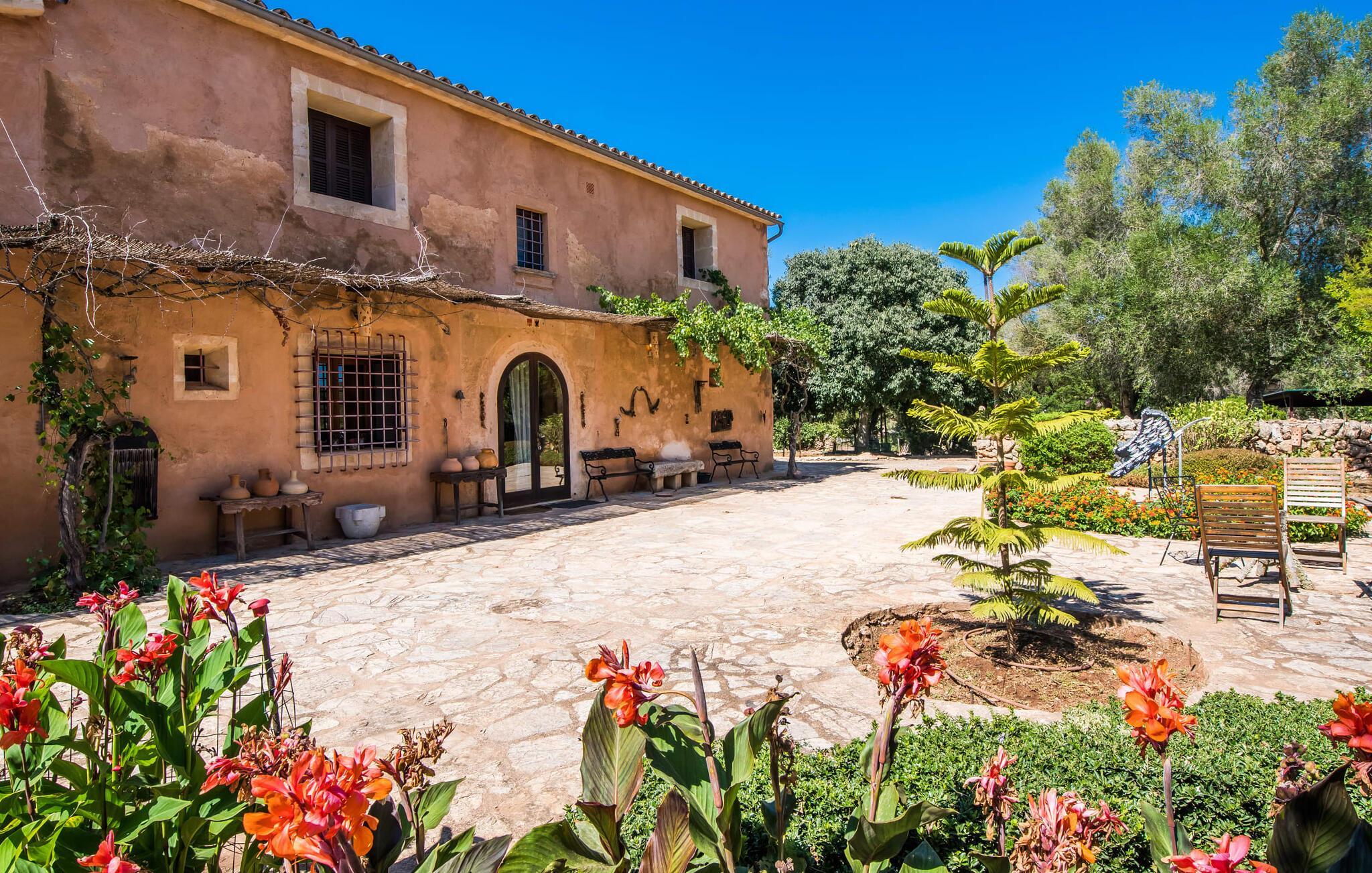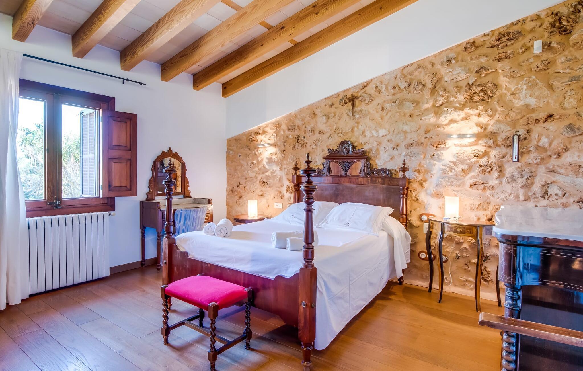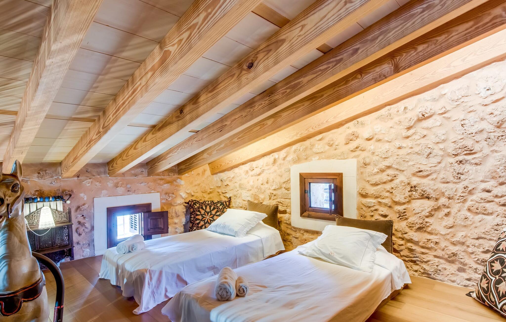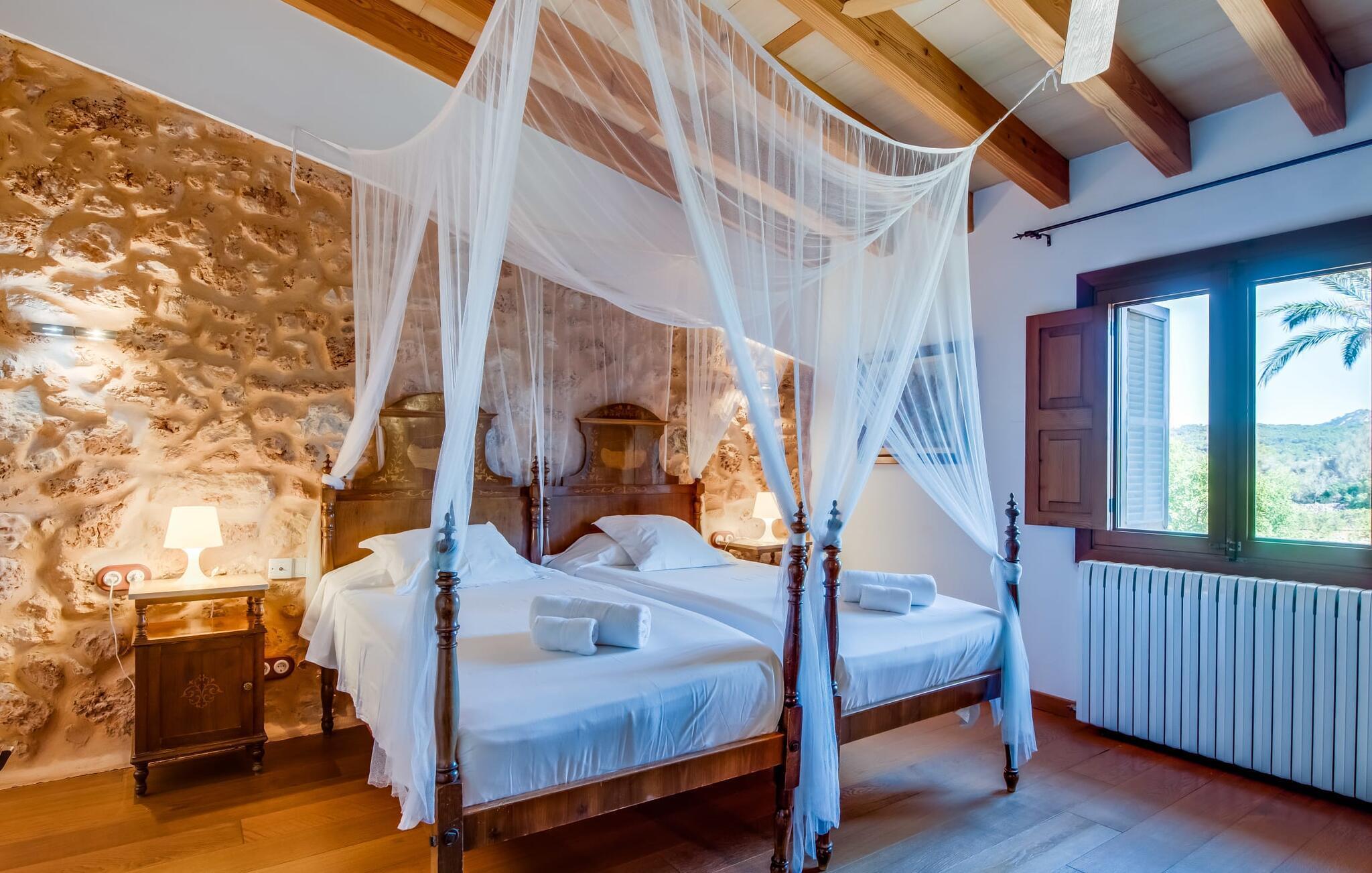 Om du vill ha mer än bara en semester på Mallorca, om du vill njuta av den typiska mallorkinska charmen, är Villa Torre d'en Huc rätt plats för dig. Både inifrån och ut har ägarna varit mycket noga med att se till att den ursprungliga karaktären av det lantliga livet på ön inte bara bevaras utan också blandas med moderna element. Och vad är slutresultatet? En stor fastighet vars uppmärksamhet på detaljer ständigt påminner dig om var du är. Här och var hittar du verktyg på väggarna som påminner dig om öbornas vardag innan Mallorca upptäcktes som turistmål, då jordbruket dominerade landskapet. Idag står dörrarna öppna för gäster som uppskattar autentisk stil. Allt här har restaurerats med stil; när du kommer in i fastigheten möts du av en stor innergård där du hittar det första valet av mysiga sittplatser bredvid en fontän. Nu är du bortskämd med valet om var du kan lata dig i solen, det finns så många att välja mellan. En täckt terrass, en terrass på första våningen, ett litet utrymme under svajande grenar, stenbänkar mot en vägg och poolområdet. Planteringarna är varierade utan att på något sätt verka konstgjorda eller planerade och designade. Tack vare denna lyckade balansgång kommer du garanterat att tillbringa många sköna timmar i friska luften och känna den avkoppling som bara är möjlig när det mest beprövade receptet för en lyckad semester sätts samman: Ta in en karaktärsfull fastighet på ett drömskt, idylliskt läge där du nästan kan läsa dina tankar och sedan stå till ditt förfogande för att uppfylla alla dina önskemål; Lägg till läckra specialiteter från grillen och stimulerande samtal. Toppa det hela med oändliga sommarkvällar som kyls av en mild bris.