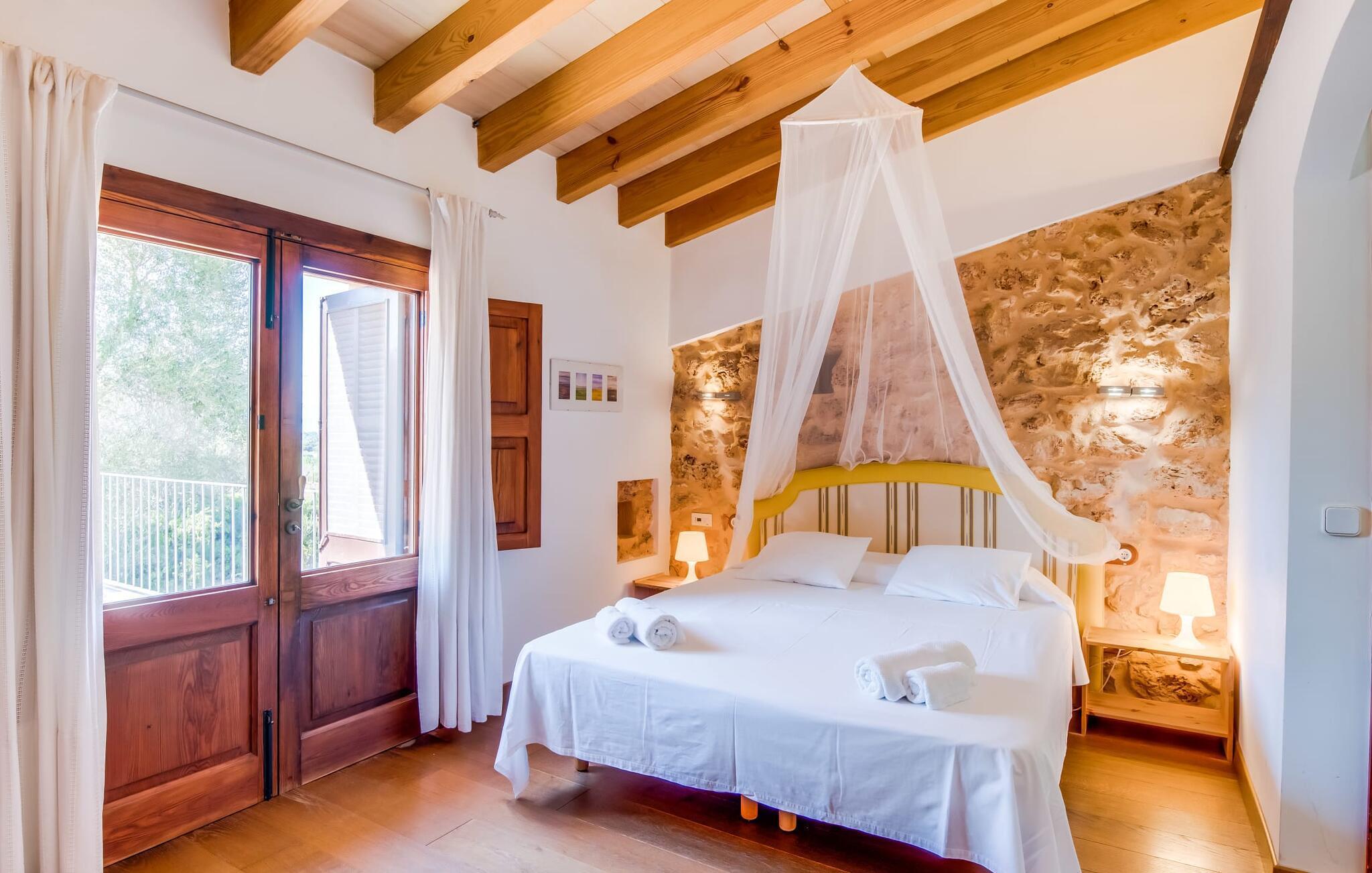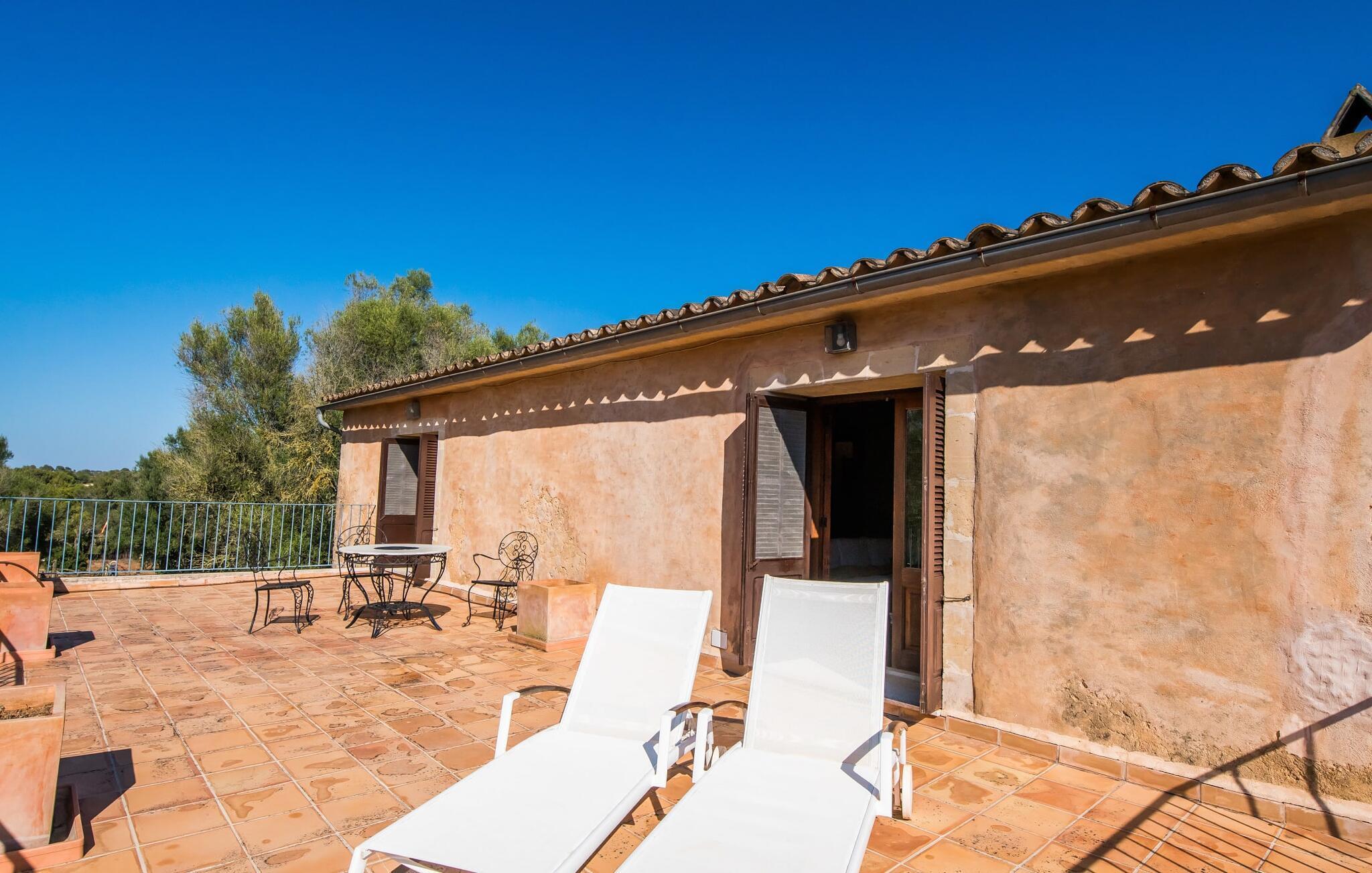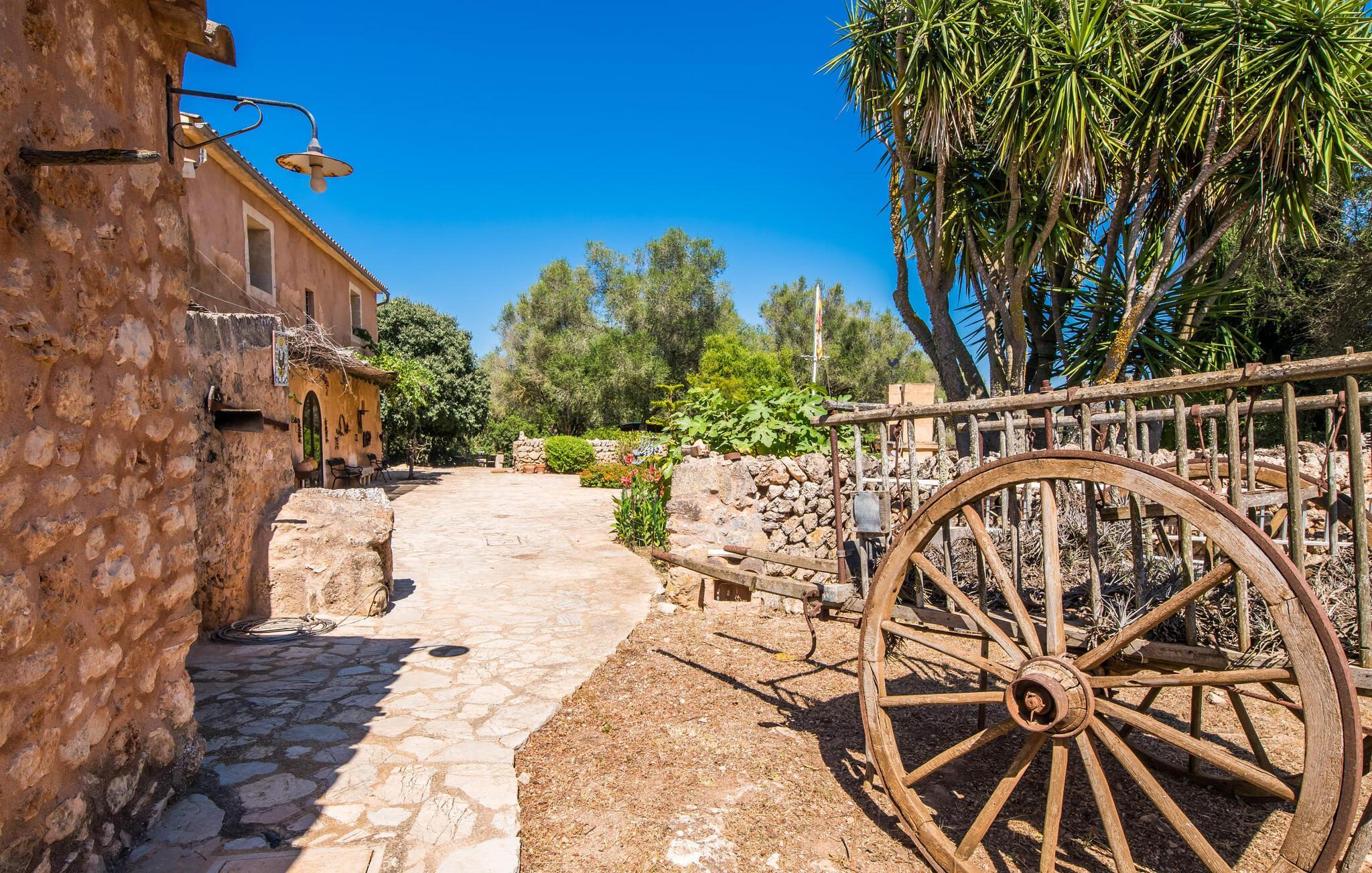 Om du vill ha mer än bara en semester på Mallorca, om du vill njuta av den typiska mallorkinska charmen, är Villa Torre d'en Huc rätt plats för dig. Både inifrån och ut har ägarna varit mycket noga med att se till att den ursprungliga karaktären av det lantliga livet på ön inte bara bevaras utan också blandas med moderna element. Och vad är slutresultatet? En stor fastighet vars uppmärksamhet på detaljer ständigt påminner dig om var du är. Här och var hittar du verktyg på väggarna som påminner dig om öbornas vardag innan Mallorca upptäcktes som turistmål, då jordbruket dominerade landskapet. Idag står dörrarna öppna för gäster som uppskattar autentisk stil. Allt här har restaurerats med stil; när du kommer in i fastigheten möts du av en stor innergård där du hittar det första valet av mysiga sittplatser bredvid en fontän. Nu är du bortskämd med valet om var du kan lata dig i solen, det finns så många att välja mellan. En täckt terrass, en terrass på första våningen, ett litet utrymme under svajande grenar, stenbänkar mot en vägg och poolområdet. Planteringarna är varierade utan att på något sätt verka konstgjorda eller planerade och designade. Tack vare denna lyckade balansgång kommer du garanterat att tillbringa många sköna timmar i friska luften och känna den avkoppling som bara är möjlig när det mest beprövade receptet för en lyckad semester sätts samman: Ta in en karaktärsfull fastighet på ett drömskt, idylliskt läge där du nästan kan läsa dina tankar och sedan stå till ditt förfogande för att uppfylla alla dina önskemål; Lägg till läckra specialiteter från grillen och stimulerande samtal. Toppa det hela med oändliga sommarkvällar som kyls av en mild bris.