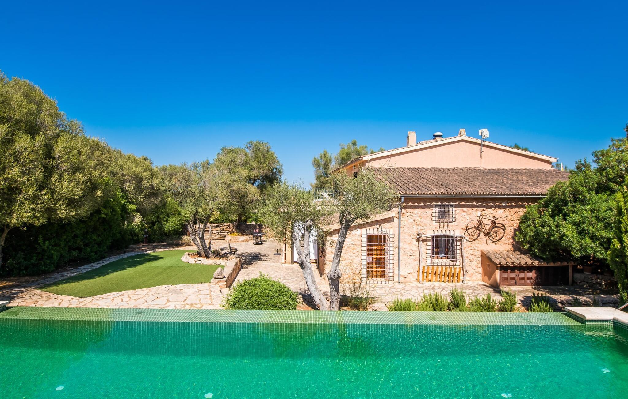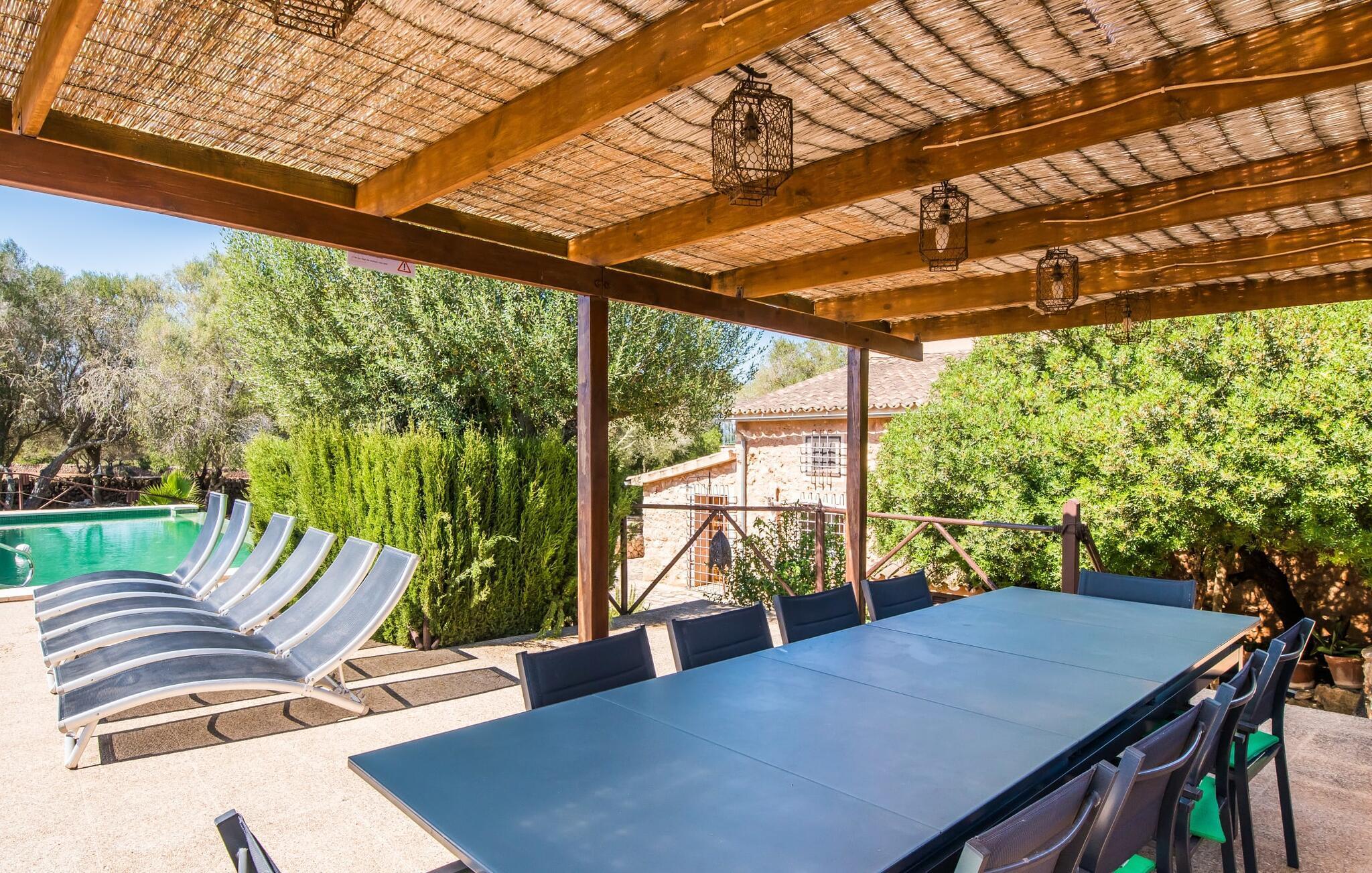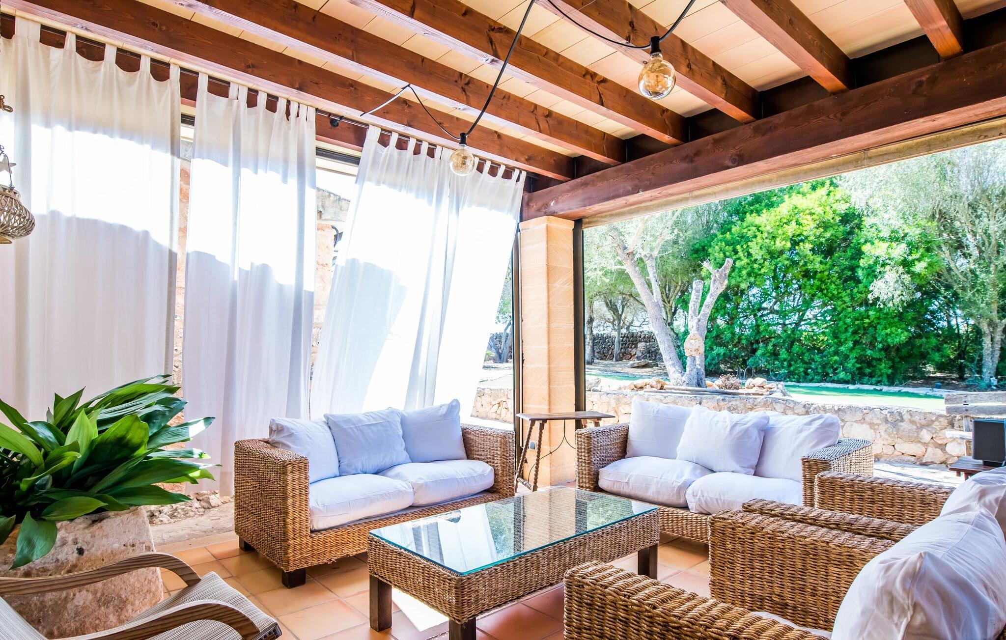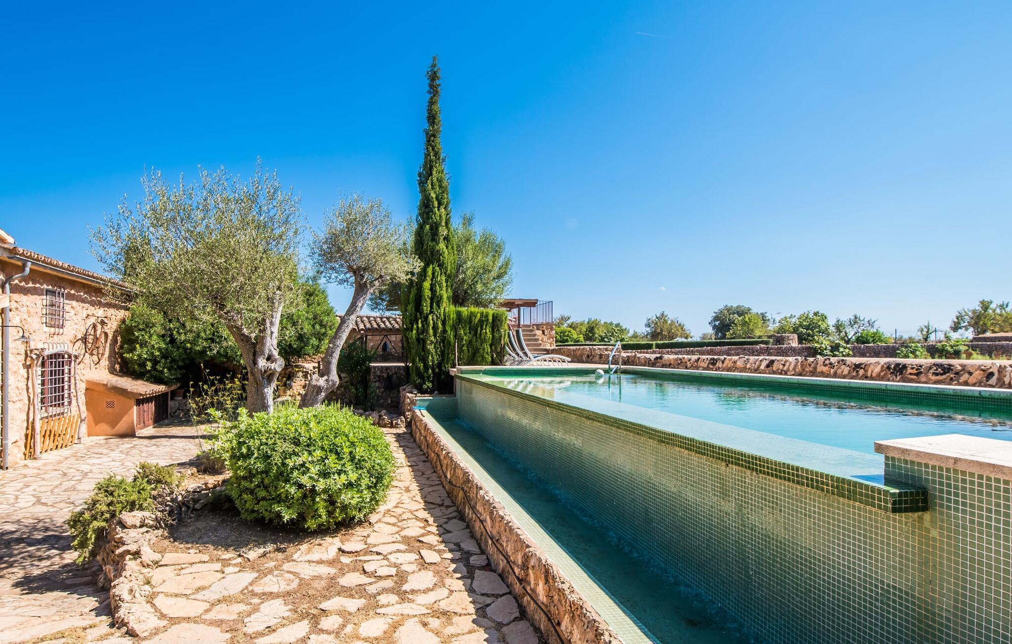 Om du vill ha mer än bara en semester på Mallorca, om du vill njuta av den typiska mallorkinska charmen, är Villa Torre d'en Huc rätt plats för dig. Både inifrån och ut har ägarna varit mycket noga med att se till att den ursprungliga karaktären av det lantliga livet på ön inte bara bevaras utan också blandas med moderna element. Och vad är slutresultatet? En stor fastighet vars uppmärksamhet på detaljer ständigt påminner dig om var du är. Här och var hittar du verktyg på väggarna som påminner dig om öbornas vardag innan Mallorca upptäcktes som turistmål, då jordbruket dominerade landskapet. Idag står dörrarna öppna för gäster som uppskattar autentisk stil. Allt här har restaurerats med stil; när du kommer in i fastigheten möts du av en stor innergård där du hittar det första valet av mysiga sittplatser bredvid en fontän. Nu är du bortskämd med valet om var du kan lata dig i solen, det finns så många att välja mellan. En täckt terrass, en terrass på första våningen, ett litet utrymme under svajande grenar, stenbänkar mot en vägg och poolområdet. Planteringarna är varierade utan att på något sätt verka konstgjorda eller planerade och designade. Tack vare denna lyckade balansgång kommer du garanterat att tillbringa många sköna timmar i friska luften och känna den avkoppling som bara är möjlig när det mest beprövade receptet för en lyckad semester sätts samman: Ta in en karaktärsfull fastighet på ett drömskt, idylliskt läge där du nästan kan läsa dina tankar och sedan stå till ditt förfogande för att uppfylla alla dina önskemål; Lägg till läckra specialiteter från grillen och stimulerande samtal. Toppa det hela med oändliga sommarkvällar som kyls av en mild bris.