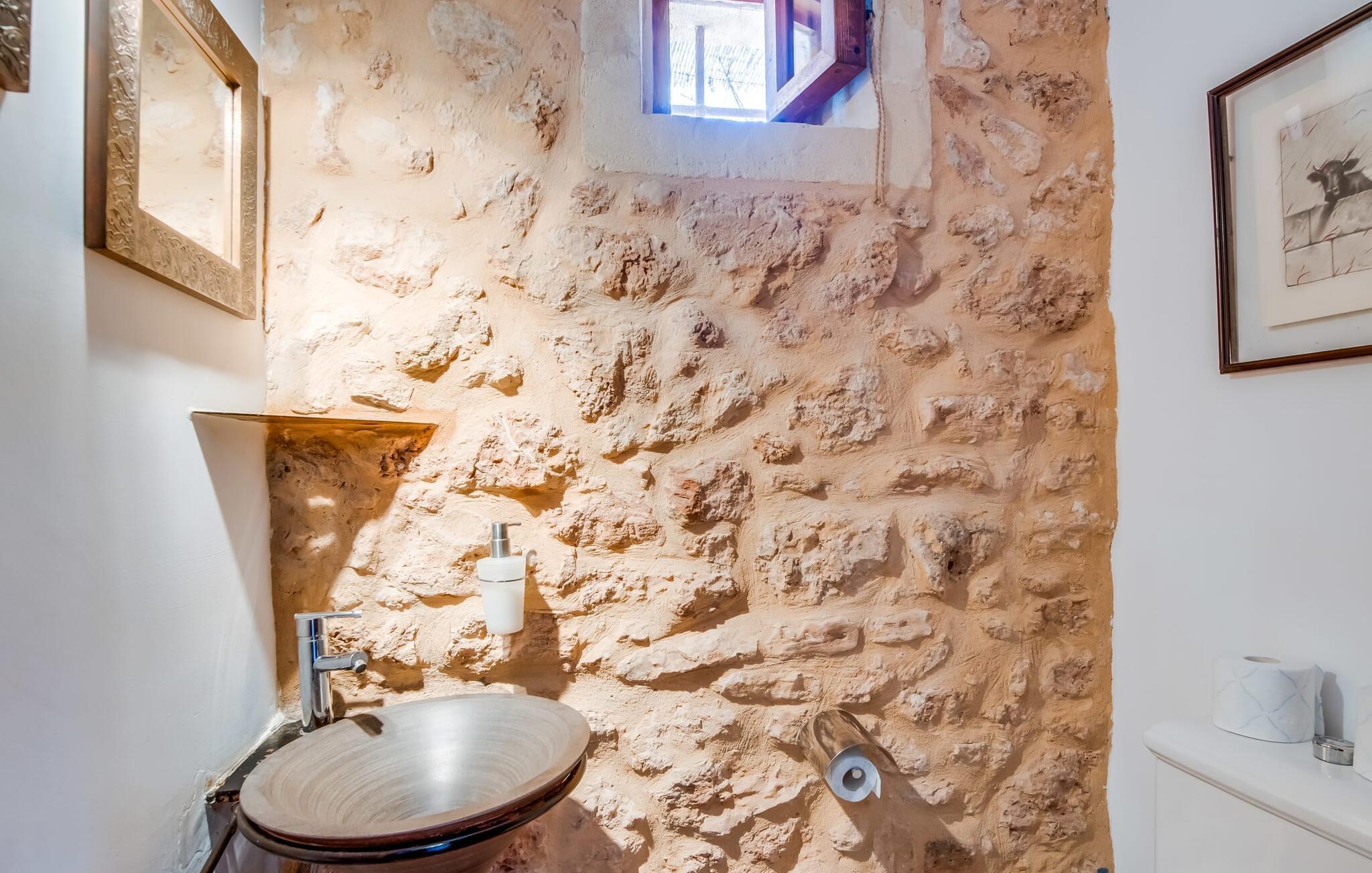 Så småningom kommer du att dra dig tillbaka till villan och då har du desto större anledning att andas en suck av lättnad. För inredningen är inte annorlunda: omsorg om detaljer, utsökta möbler, autentiska föremål från villans händelserika förflutna och modern konst är en så utmärkt blandning att du definitivt kommer att vilja tillbringa lite mer tid i ett av de två mysiga vardagsrummen eller vid den rustika öppna spisen i entrén innan du verkligen måste kalla det en dag. Det här huset är perfekt utrustat för större grupper, särskilt som alla utom ett av de fem dubbelrummen (varav fyra har egen luftkonditionering) har eget badrum. Ett av dem har till och med poolens lillebror, ett härligt badkar (om du vill ha saltvatten här också måste du hämta det från havet själv). Från vardagsrummet tar en trappa dig till en mezzaninvåning där det finns lite fitnessutrustning för att hålla dig i form under din vistelse. De yngre gästerna kommer att bli förtjusta i den leksakshäst i nästan naturlig storlek som står här och stoltserar. Det finns också två enkelsängar här; den grottliknande karaktären på denna öppna planlösning gör den särskilt lämplig för äldre barn för vilka integritet inte är lika viktigt. På övervåningen finns ytterligare tre sovrum, varav ett har utgång till den tidigare nämnda terrassen på första våningen med solstolar, sittmöbler och växter. Detta är den perfekta platsen för din morgonkaffe!