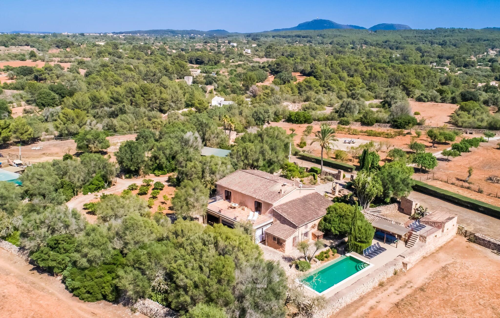 Och kanske för att planera vad du ska utforska och upptäcka idag. Villans gynnsamma läge erbjuder många möjligheter till detta. Trots sin avskildhet, som är en njutning för öronen och nervsystemet, ligger Algaida bara 10 minuter bort för att köpa dina dagliga förnödenheter. På fredagar är det värt att besöka den färgstarka veckomarknaden på Sa Plaza och njuta av en promenad följt av en utsökt café cortado. Om du vill ha kultur, strand och shopping kan du åka till Palma med sin vackra katedral, som ligger bara 30 minuter bort. Den solkyssta bukten Cala Pi på södra delen av ön kan nås på 40 minuter. Golfentusiaster är i goda händer på Son Gual, bara 15 km bort, där de kan arbeta på sitt handikapp och se fram emot att åka hem i slutet av dagen - trots allt är du boende i en verkligt magnifik villa under hela din semester. Villa Torre den Huc är en stor egendom där man även håller hästar. Massor av rustik charm, en traditionell touch och moderna accenter samlas i en vacker, lantlig, avskild plats nära staden Algaida och gör en mycket speciell semesterupplevelse. Algaida ligger bara 10 minuter bort för daglig shopping. Öns huvudstad Palma, med sina många shopping- och fritidsanläggningar och tillgång till havet, ligger bara 30 minuter bort med bil.