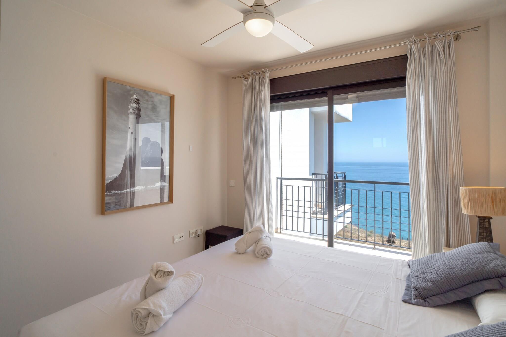 Denna moderna lägenhet med hisnande havsutsikt rymmer upp till fem gäster fördelade på tre sovrum – ett med dubbelsäng och eget badrum, ett med två enkelsängar och ett annat med en enkelsäng. Husdjur är inte tillåtna och erbjuder central luftkonditionering för extra komfort. Gästerna kan njuta av en stor möblerad terrass med panoramautsikt, och extrafunktioner som spjälsäng, barnstol och ett välkomstpaket kan ordnas. Vardagsrummet är möblerat med bekväma sittplatser och öppnar upp mot terrassen, perfekt för avkoppling eller middag med havsutsikt. Lägenheten har ett idealiskt läge i Calaceite-urbanisationen mellan Torrox Costa och Nerja, och erbjuder snabb tillgång till lokala stränder bara 500 meter bort. I närheten hittar gästerna strandklubbar, restauranger och solstolar. Området nås av en lokal busshållplats med förbindelser till Torrox och Nerja, men det rekommenderas att ha bil för fullständig bekvämlighet. Allmän parkering finns vid byggnadens entré, och även under högsäsong är parkering vanligtvis lätt att hitta. Lägenheten har ett fullt utrustat modernt kök med avancerade apparater, perfekt för att laga mat under din vistelse. Den har två badrum, varav ett har eget badrum. Vardagsrummet och två sovrum vetter mot havet och erbjuder fridfull utsikt hela dagen. Ytterligare bekvämligheter inkluderar privat täckt parkering, höghastighetsinternet och tillgång till två stora gemensamma pooler omgivna av anlagda trädgårdar för ultimat avkoppling.