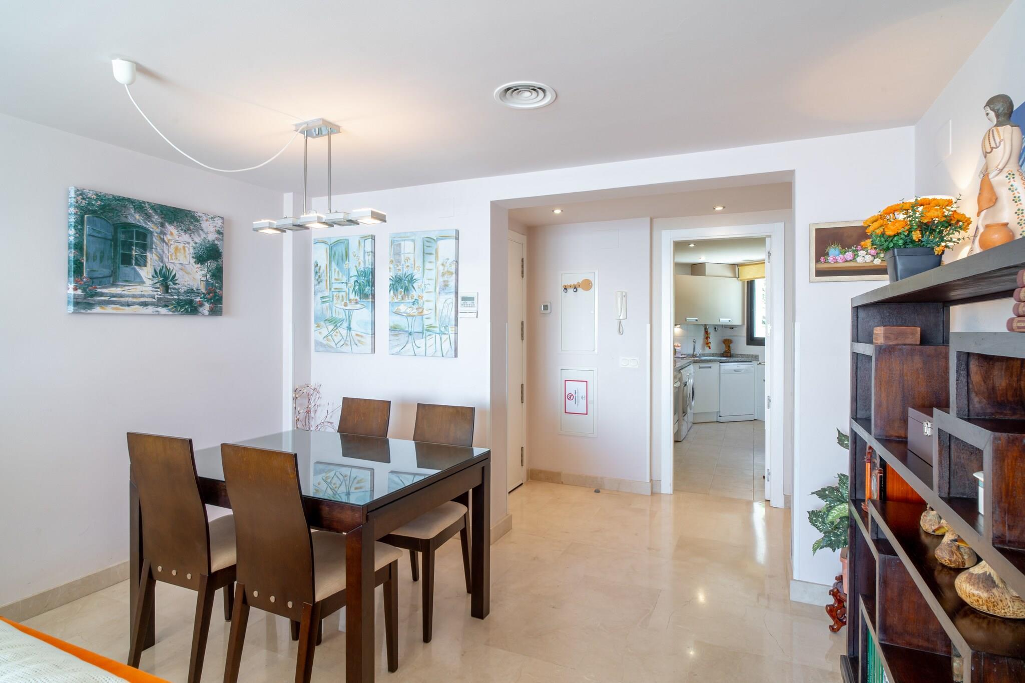 Denna moderna lägenhet med fängslande havsutsikt har två sovrum – ett med dubbelsäng och eget badrum, det andra med två enkelsängar – och rymmer upp till fyra gäster. Husdjur är inte tillåtna och har ett rymligt vardagsrum som öppnar upp mot en privat terrass som erbjuder en avkopplande plats att varva ner. Lägenheten är utrustad med central luftkonditionering för att garantera komfort under hela din vistelse. Även om det inte ingår några gratis gruppaktiviteter, finns valfria tjänster som spjälsäng, barnstol och välkomstpaket tillgängliga för en förbättrad upplevelse. Lägenheten är idealiskt belägen i Calaceite-urbanisationen mellan Torrox Costa och Nerja, och erbjuder närhet till stranden, bara 500 meter bort. Gästerna kan njuta av närliggande strandklubbar, restauranger och solstolar, perfekt för en kustsemester. Området har goda förbindelser via en lokal busslinje till båda städerna, men det rekommenderas att ha bil för extra bekvämlighet. Fastigheten inkluderar en privat parkeringsplats, och ytterligare allmän parkering finns i närheten, även under högsäsong. Inuti erbjuder lägenheten ett modernt kök utrustat med toppmoderna apparater, lämpliga för att laga kompletta måltider under din vistelse. Förutom det egna badrummet finns ett andra badrum tillgängligt för gästernas bekvämlighet. Vardagsrummet och sovrummet vetter båda mot havet, vilket ger en lugn havsutsikt vid soluppgången. Gästerna har också tillgång till två gemensamma pooler med anlagda grönområden, samt höghastighetsinternet och internationella TV-kanaler.