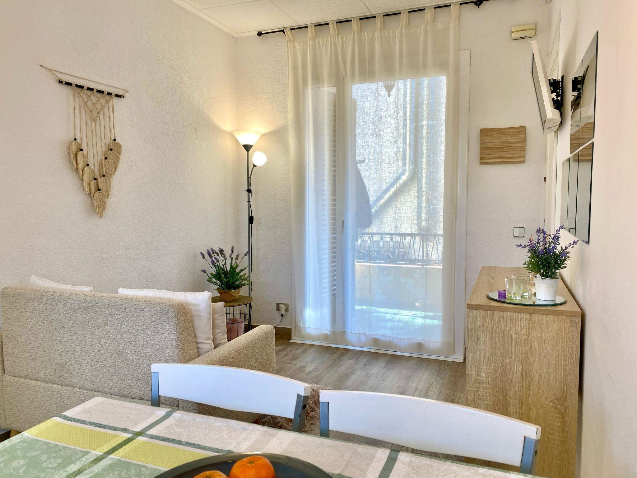 "Aquarius", 3-room apartment 58 m2 on 1st floor. Object suitable for. Bright, partly renovated in 2025, simple and practical furnishings: living/dining room with dining nook, kitchen corner, digital TV and air conditioning. Exit to the balcony. 1 double bedroom with 1 french bed (140 cm, length 190 cm), fan. 1 double bedroom with 2 beds (90 cm, length 190 cm). Kitchen (2 hot plates, dishwasher, microwave, freezer). Bath/WC. No heating option. Small balcony. Balcony furniture, box-room. View of the garden and the resort. Facilities: washing machine, iron, hair dryer. Internet (WiFi, free). Parking space n 41 (5 minuts) (roofed) at 500 m. Please note: maximum 1 small pet/ dog allowed. TV only ES. No lift. HUTG-001729 // Reg. Nr.: ESFCTU00001702100043269100000000000000000HUTG-0017292