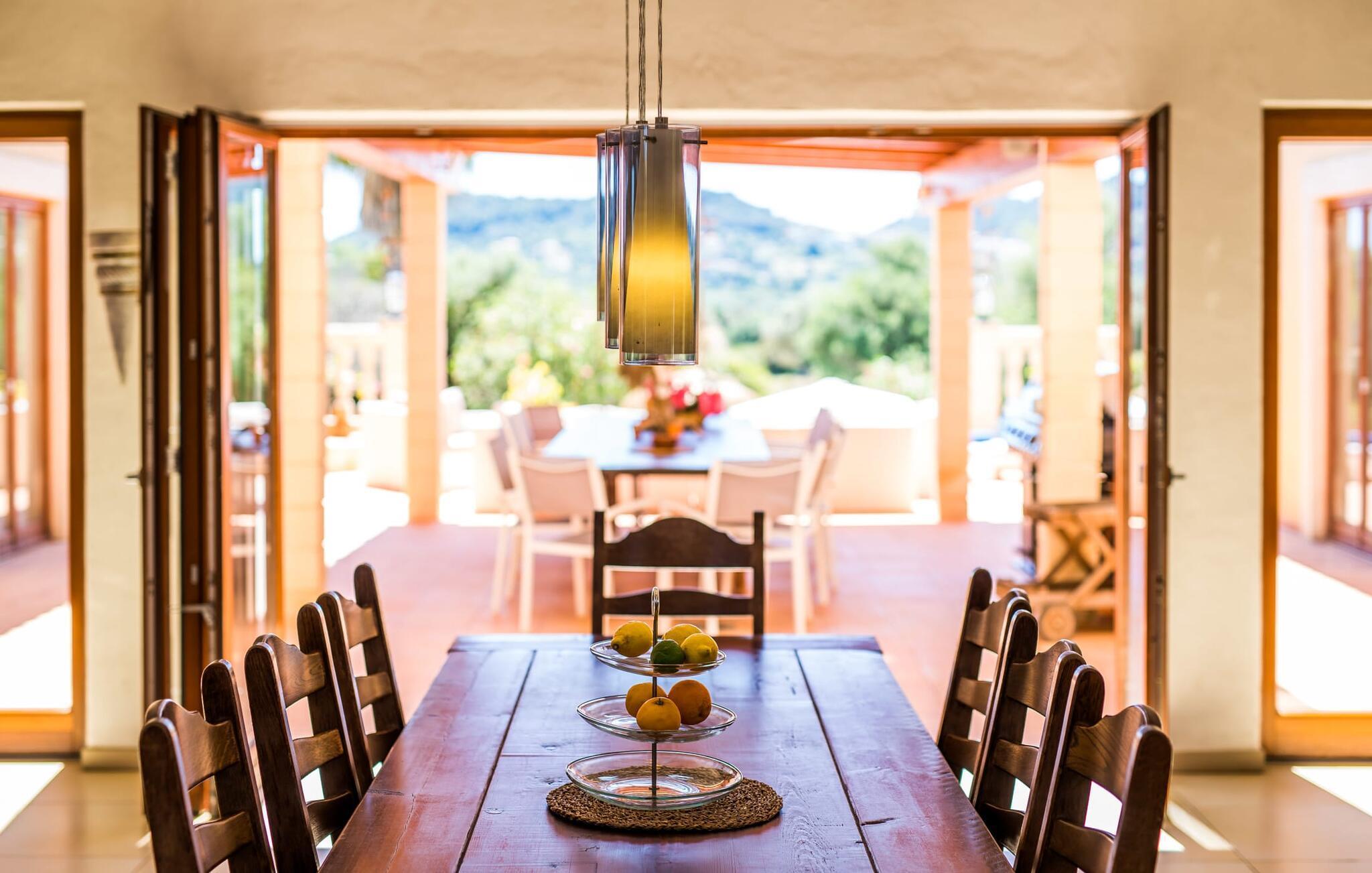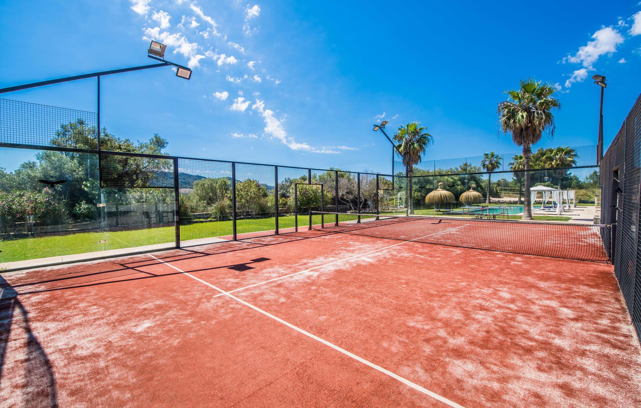 Nej, det här lanthuset på Mallorca är inte vanligt. Inte enkel. Inte trivialt. Det är en allkonstnär. Dess överdådighet är inte bara otroligt förtrollande, utan också något av en konflikt, för här vet du helt enkelt inte var du ska börja med en presentation som är lämplig för fastighetens kvalitet. Låt oss börja med den fantastiska exteriören av denna drömlika bostad, pittoreskt inbäddad i de gröna kullarna mellan Cala Ratjada och Cala Mesquida. Husets ursprungliga design dikterar terrassens layout, som smälter in särskilt harmoniskt med både byggnaden och utomhusområdet. En slags uteplats, mestadels täckt, är upphöjd på första våningen och rymmer ett stort matbord samt en grill och en super trevlig lounge med en unik utsikt över trädgården, särskilt över den enorma poolen kantad av gräsmattor och palmer, som kan nås via en nästan ståtlig bred trappa. Bekväma solstolar och balinesiska sängar ser till att timmarna utomhus blir ett rent nöje. Låter allt detta extremt bekvämt? Men det är inte allt! Som du kan se på bilderna finns det en volleybollplan och en padelplan (den senare med strålkastare!) Lagsporter är mycket viktiga här. Ett biljardbord och ett bordtennisbord avrundar det breda utbudet av utomhusaktiviteter som erbjuds.
