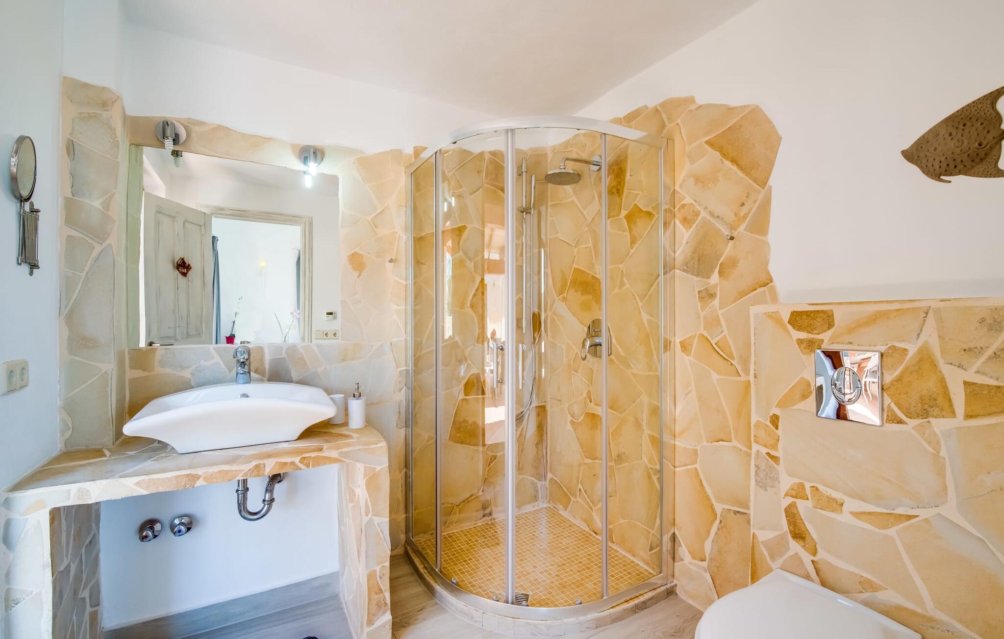 Man kan tro att den här fastigheten redan har använt allt sitt krut i utomhusområdet, men långt ifrån! Ett rymligt vardagsrum/matsal med angränsande kök i öppen planlösning ligger direkt på den övre terrassen och inbjuder dig att umgås inomhus. Oavsett om du kopplar av i soffan, sitter tillsammans vid bordet eller hackar ingredienser till en rejäl middag i det välutrustade köket, är det här en plats där gemenskapen är mycket viktig. Fönstren som delvis går från golv till tak och den öppna arkitekturen med generös rumshöjd och synliga träbjälkar, i kombination med eleganta möbler av hög kvalitet, naturstenselement och harmonisk färgsättning, skapar en estetisk boendemiljö. Bottenvåningen och övervåningen är uppdelade i särskilt smakfulla sovrum, varav några endast är tillgängliga från utsidan och några är tillgängliga från utsidan, så att varje gäst kan njuta av en speciell nivå av integritet, vilket ytterligare betonas av det rymliga vardagsrummet och några av dem har egna terrasser. Totalt sex badrum garanterar maximal komfort även när huset är fullbelagt. Ett stort yoga- eller konferensområde på övervåningen utökar underhållnings- och sportfaciliteterna i detta exceptionella semesterhus på Mallorca. Vi ger drömgården Son Terrassa vår oreserverade rekommendation, särskilt för dem som vill komma till ön med en sportorienterad semesterfamilj eller grupp. Platsen är också perfekt för bröllop, födelsedagar, seminarier, företags- och affärsevenemang. Mellan Cala Ratjada och Cala Mesquida ligger drömgården Son Terrassa, som imponerar med sina helt enastående inomhus- och utomhusområden. Detta speciella, underbart idylliska och lugna läge är perfekt för både sportentusiaster och dem som söker avkoppling. Capdepera med sitt goda utbud av stormarknader, restauranger etc. ligger bara några kilometer bort, liksom olika vackra stränder som Platja Son Moll, Cala Agulla eller Cala Mesquida.