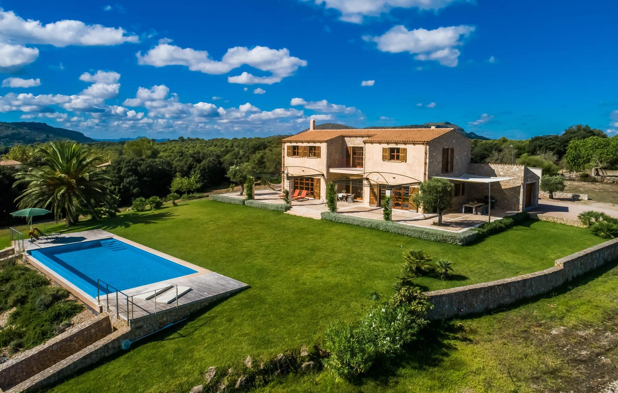 Fincan "Vent", med sin egen 4000 m² stora vingård, ligger något upphöjd över resten av landskapet och erbjuder en unik utsikt över östra Mallorca. Det avskilda, lugna och lantliga läget erbjuder idealiska förutsättningar för en avkopplande semester. En välskött gräsmatta leder till ett imponerande poolområde. Det ligger några steg lägre än husets terrass och kan nås via en rymlig trappa. Poolen har stora träterrasser i båda ändar, där solstolarna också är placerade. När du har simmat några varv och kopplat av på solstolarna medan du njuter av den fantastiska utsikten över det lätt kuperade landskapet hela vägen till Medelhavet, har du kommit på semester. Eftersom fastigheten ligger i en svag sluttning var det möjligt att installera en bekväm bastu i det ihåliga utrymme som uppstod vid sidan av poolen. Speciellt under övergångssäsongen eller till och med på vintern kan du njuta av trevliga timmar här. Utomhusduschen kan ge ett trevligt sätt att svalka sig. Fincaen är omgiven på nästan alla sidor av en stor terrass. Här finns gott om möjligheter att koppla av i solen eller skuggan, beroende på humör. Det finns gott om plats för att sätta upp en hängmatta. Den täckta terrassen är en central punkt. Här kan du sitta vid det stora bordet och njuta av en måltid eller bara låta tankarna vandra med en drink i handen. Det finns ytterligare två små sittplatser, varav den ena är idealiskt belägen på framsidan av huset under en annan baldakin. En modern mobil gasgrill finns tillgänglig för en rustik grillfest eller en mer detaljerad måltid utomhus.