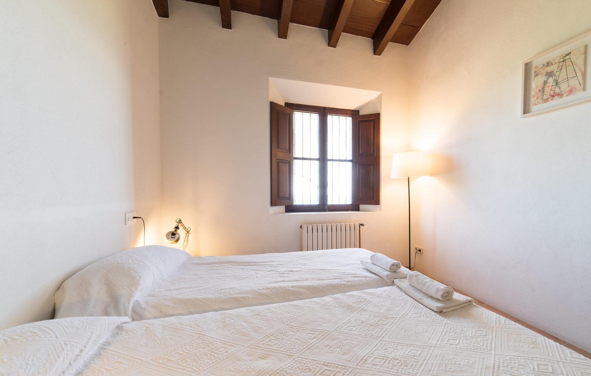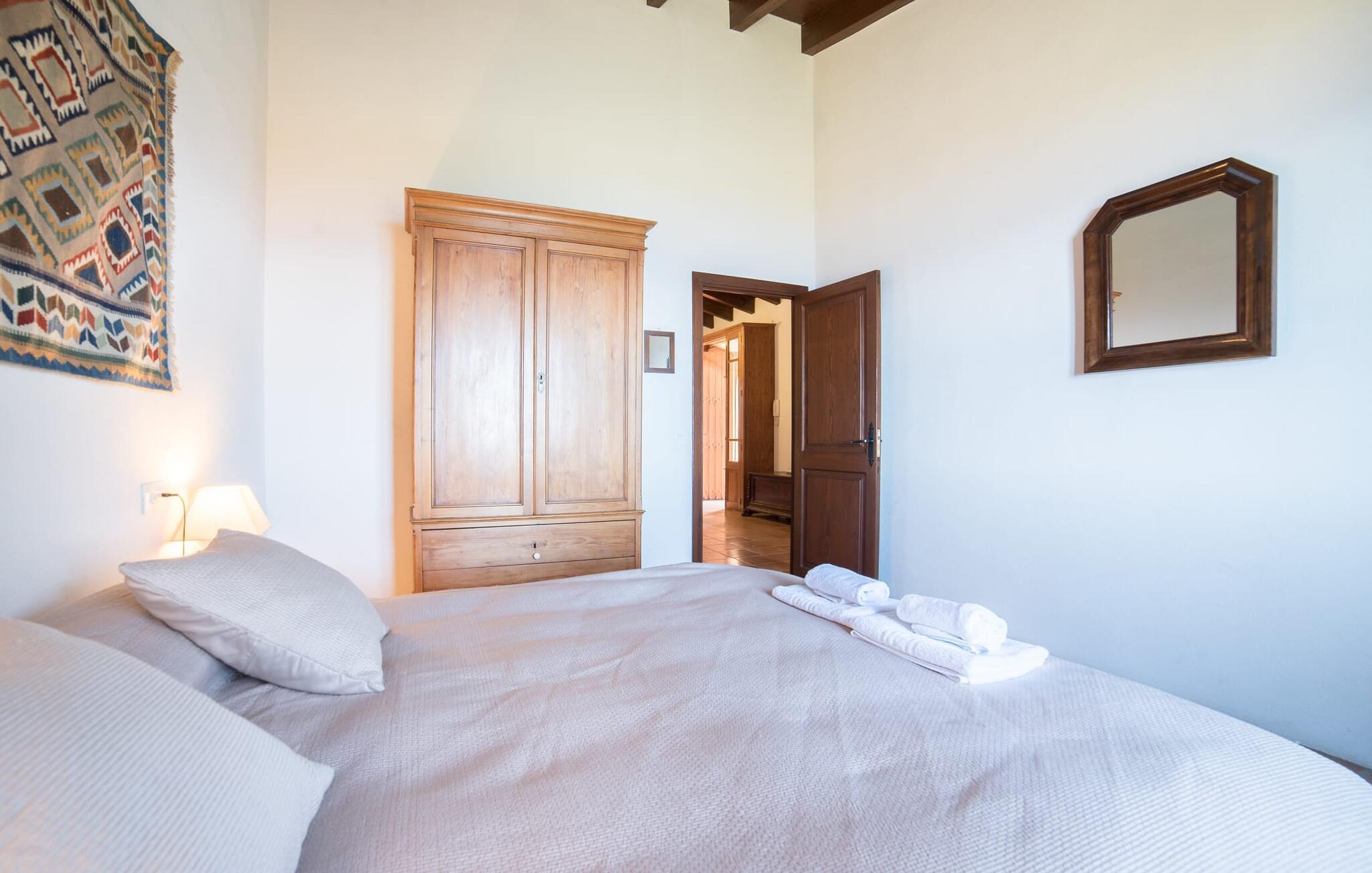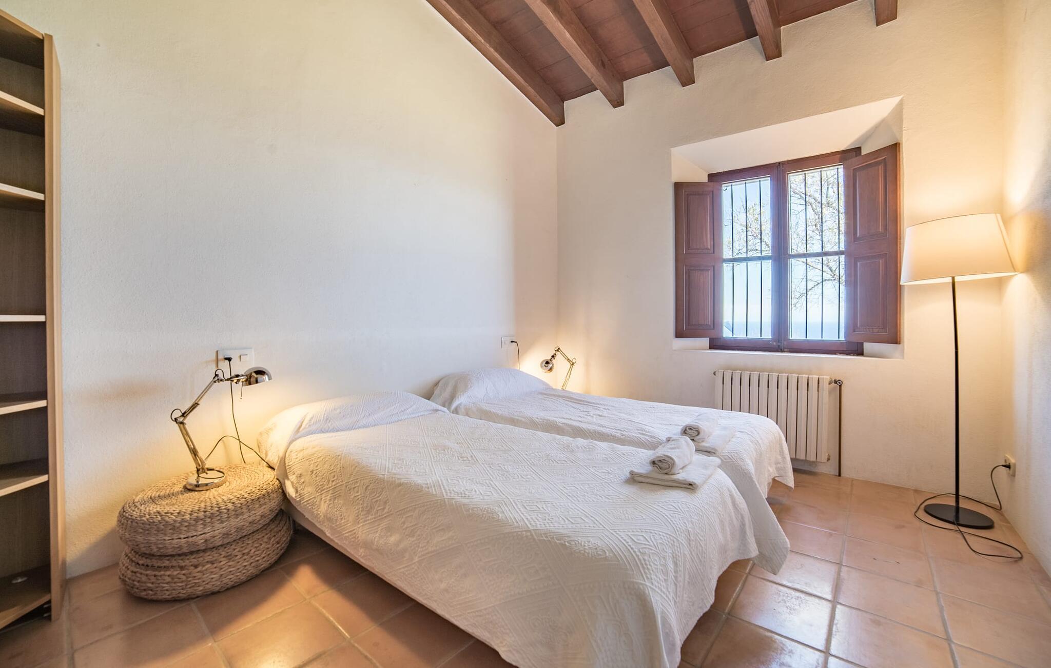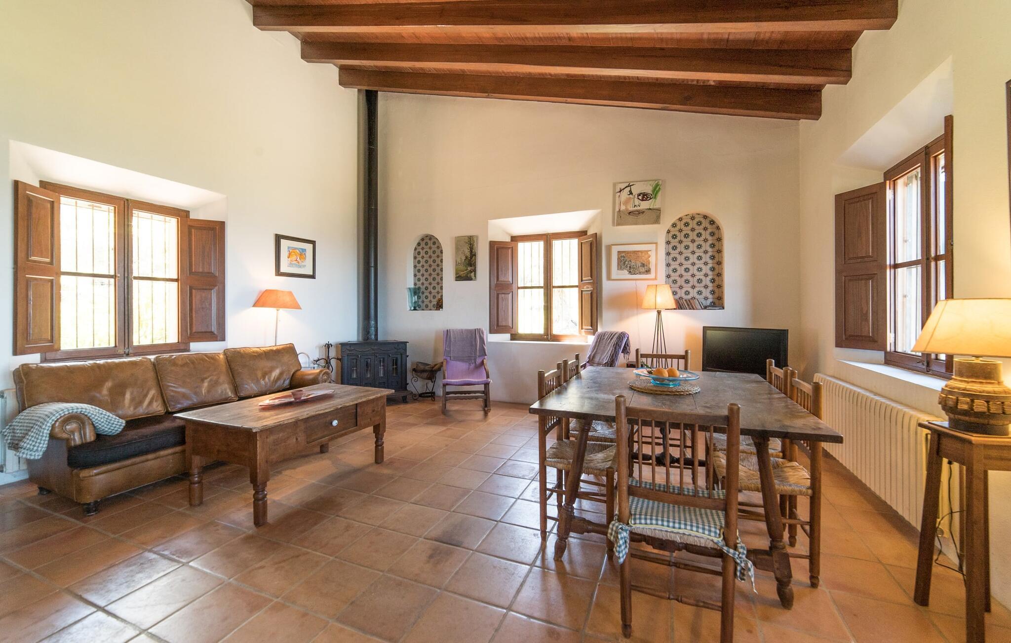 Inredningen i huset är bekväm och har en personlig touch. Högkvalitativa möbler och snygga detaljer väntar på dig i hallen. Det ljusa vardagsrummet/matsalen med högt i tak kombinerar smakfullt funktionalitet med komfort och charm. Här finns en TV med DVD- och CD-spelare, bekväma soffor, gungstolar och ett matbord. Några utvalda föremål som den klassiska ugnen, det värdiga vardagsrumsbordet eller träpianot förstärker trivselfaktorn i detta centrala rum. De massiva träbjälkarna i taket avrundar den mysiga atmosfären. Köket är rymligt och fullt utrustat. Förutom basutrustning som ugn och keramikhäll finns här även kaffebryggare, vattenkokare och brödrost. En speciell egenskap hos huset är det mysiga lilla biblioteket, där du hittar bokhyllor. I de smakfullt inredda sovrummen kan ni finna lugn och ro i detta lilla hörn av världen. I ett av de tre sovrummen har man från sängen utsikt över en naturstensvägg, som är imponerande upplyst och har en särskilt behaglig effekt. Det finns totalt fyra sängar som mäter 0,90 x 1,90 meter och en som mäter 1,50 x 1,90 meter. Badrummen är enkla och funktionella.