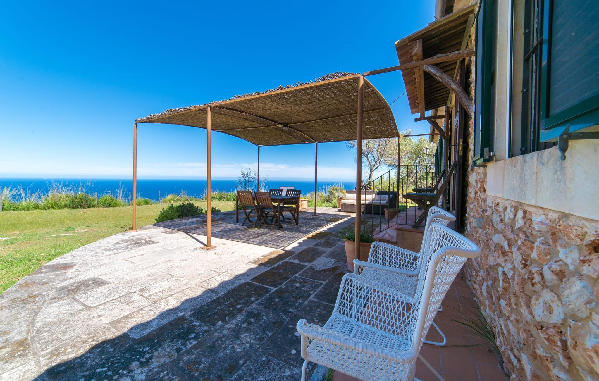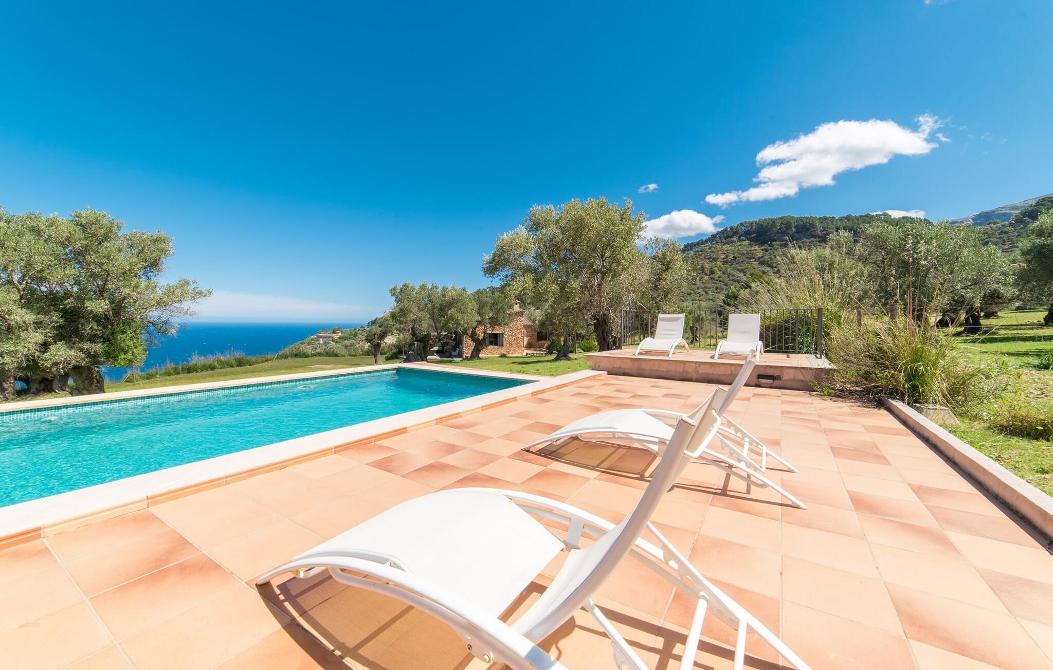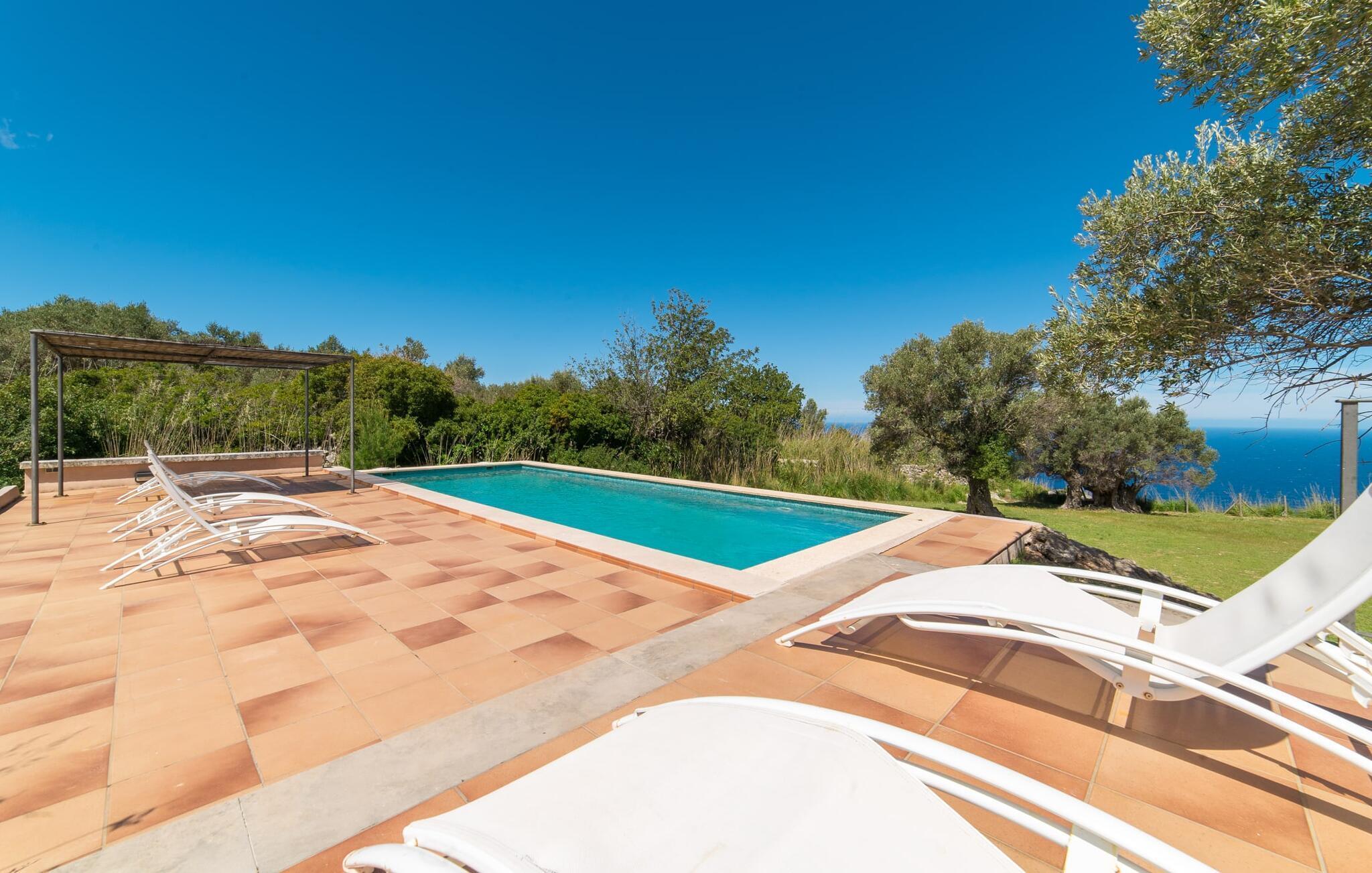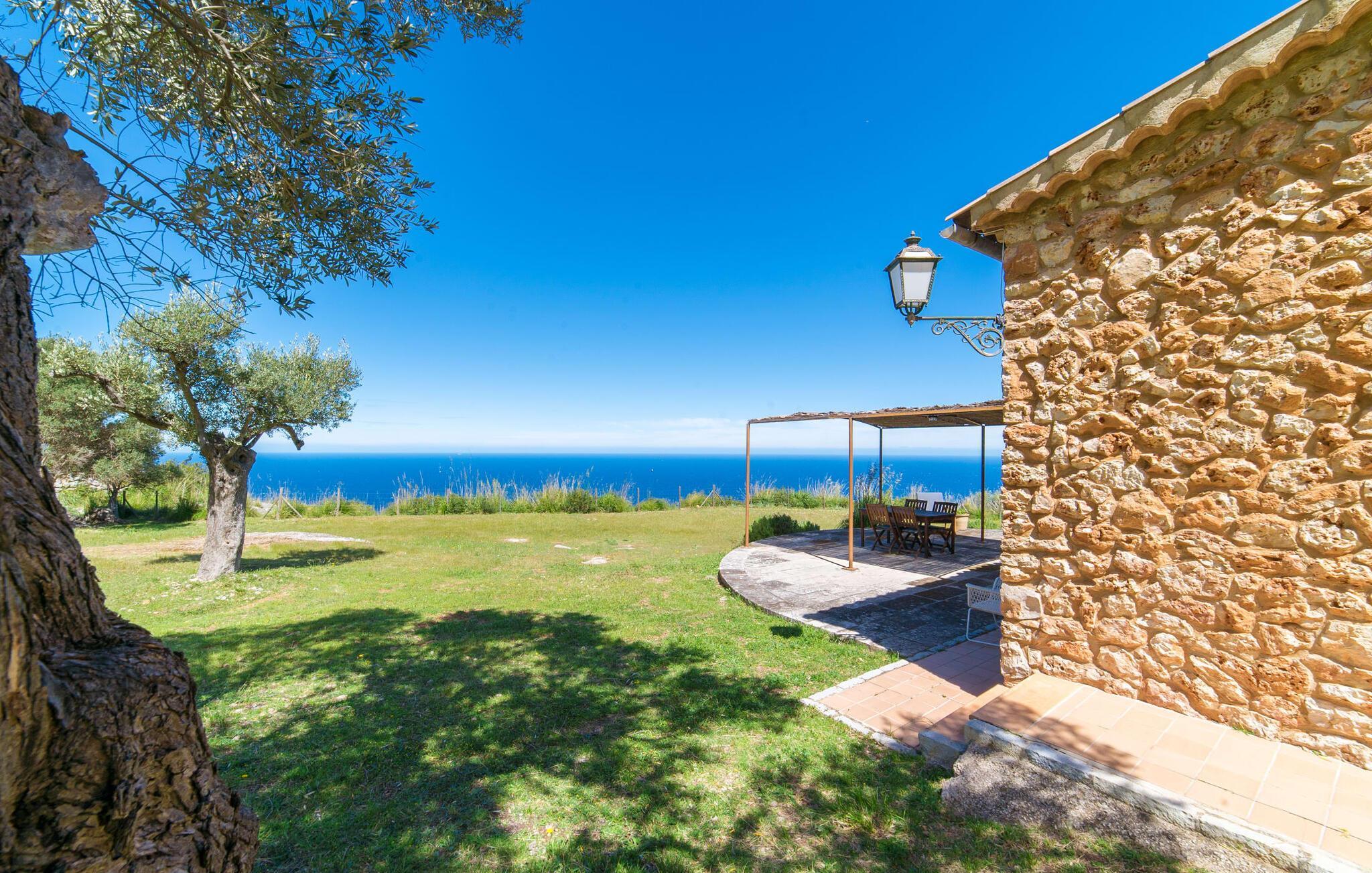 När du kommer in på Villa Vidals egendom känner du omedelbart den ursprungliga känslan som omger denna fastighet. Gamla olivträd vilar mot huset, som delvis är byggt av natursten, och förmedlar omedelbart en mysig atmosfär. Den rustika karaktären bekräftas på en rundtur i den labyrintiska villan. Olika delvis täckta terrassområden inbjuder dig att koppla av och njuta av den underbara utsikten. Det finns också olika bekväma sittmöbler och ett gediget matbord, där du också kan sitta vid frukosten utomhus om du vill. Bara några steg bort från huset, något upphöjt, finns en rektangulär pool med angränsande, delvis täckt, kaklad terrass med solstolar. Härifrån kan din blick glida långt ut över det djupblå havet eller i en annan riktning till de omgivande, imponerande, mestadels trädbevuxna bergen. Eftersom det inte finns någon utsikt över fastigheten från utsidan kan du faktiskt röra dig helt ostört och njuta av den bästa tiden på året som du vill.