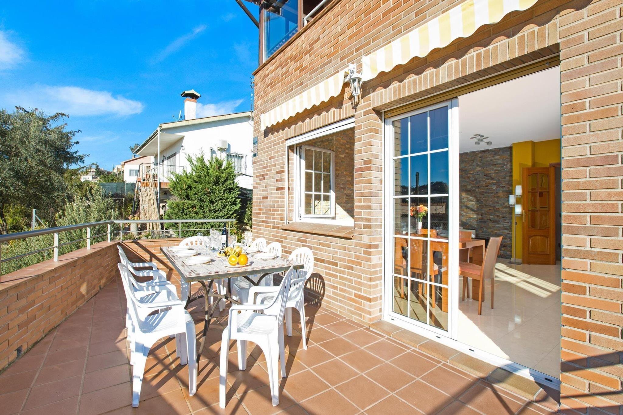 Denna charmiga villa ligger i det lugna området Aiguaviva Park, bara 9 km från de livliga stränderna och centrum av Lloret de Mar. Huset är fördelat på två våningar och erbjuder gott om plats för upp till 8 gäster. På bottenvåningen hittar du ett mysigt vardagsrum-matsal med direkt tillgång till en solig terrass, perfekt för att njuta av måltider utomhus. Det fullt utrustade köket har kylskåp, ugn, mikrovågsugn, diskmaskin och tvättmaskin. Entréplanet har också två dubbelrum med bekväma sängar och ett komplett badrum med badkar. Den första våningen har ytterligare ett dubbelrum med en utfällbar säng, ett extra badrum med dusch och ett öppet område med en utfällbar säng för ytterligare två gäster. En stängd terrass erbjuder vacker utsikt över de omgivande bergen. Uteområdet är designat för avkoppling, med en privat pool (7x4m), en chill-out terrass med trädgårdsmöbler och en grillplats med matbord och stolar - perfekt för måltider utomhus. Det finns också ett kylskåp för extra bekvämlighet, vilket gör detta område perfekt för att varva ner efter en dag av att utforska området. Gratis Wi-Fi finns tillgängligt i hela fastigheten. Utomhusparkering finns, vilket säkerställer enkel åtkomst för gäster med fordon. Denna villa hyrs exklusivt ut till familjer och bokningar för grupper av ungdomar under 35 år är inte tillåtna. Husdjur kan tillåtas på begäran i förväg och mot en extra avgift. Villans lugna läge och närhet till lokala attraktioner gör den till ett idealiskt val för familjer som söker en avkopplande semester.