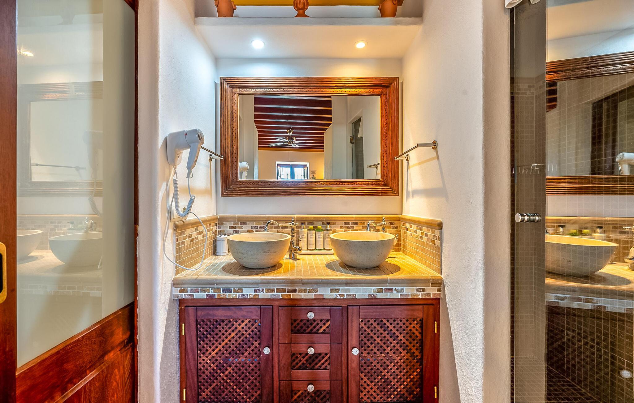 Invändigt har villan en matplats med luftkonditionering och plats för åtta personer, som vetter mot ett mysigt vardagsrum med öppen spis och satellit-TV. Det fullt utrustade köket, komplett med Nespressomaskin och moderna apparater, ansluter enkelt till utomhusområdena, inklusive uteserveringar, en grill och lugna loungehörnor.