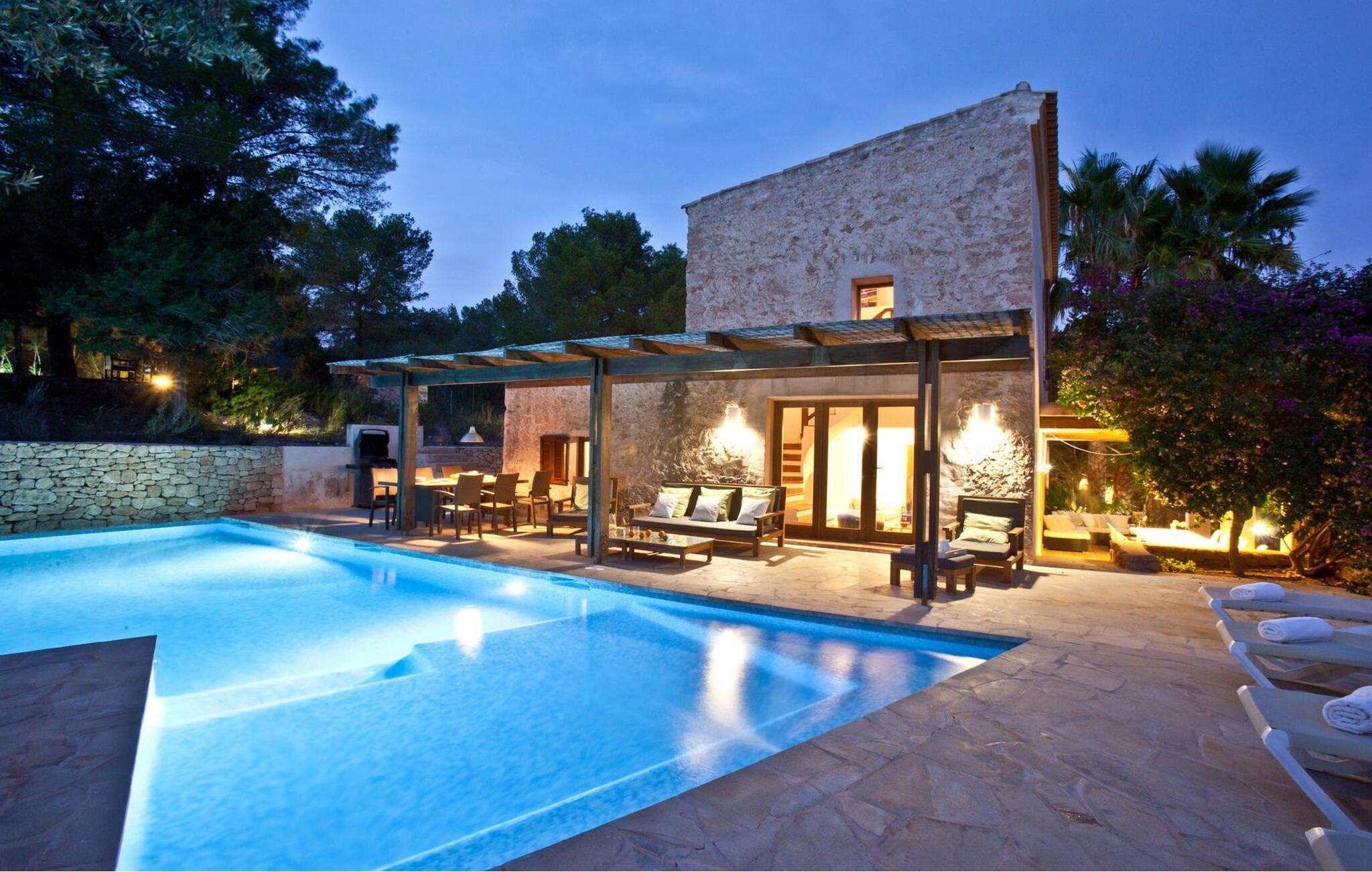 Vacker 430 m2 helt inhägnad villa byggd på en 10.000 m2 stor tomt i renaste Ibizastil, bara några kilometer från stranden Cala Bassa och nära stränderna Cala Conta, Cala Tarida och Port des Torrent.
