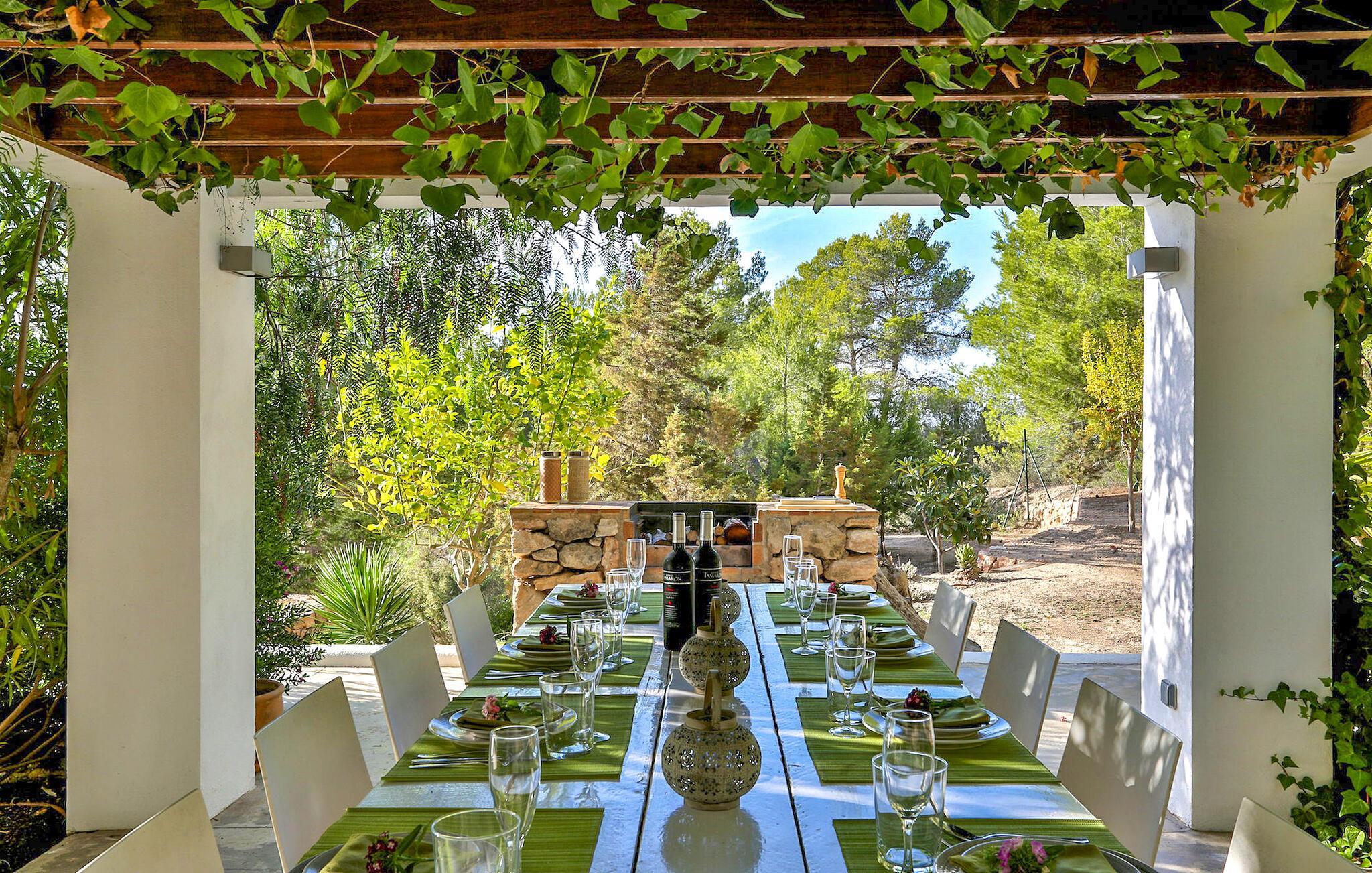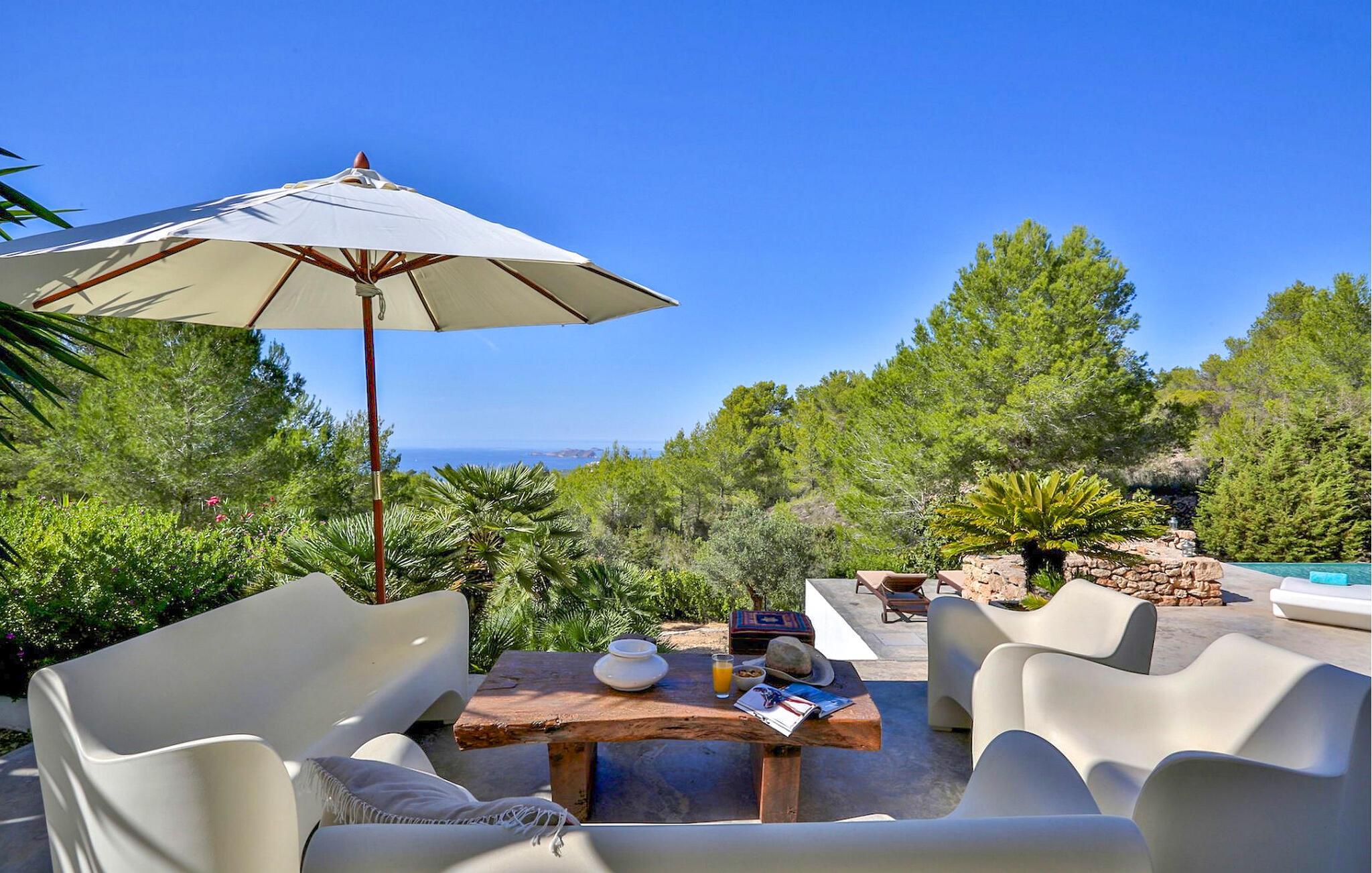 Med pinjeskogarna i bakgrunden och den fantastiska utsikten över Medelhavet är denna villa en perfekt plats att njuta av de varma kvällarna i autentisk Ibiza-stil.