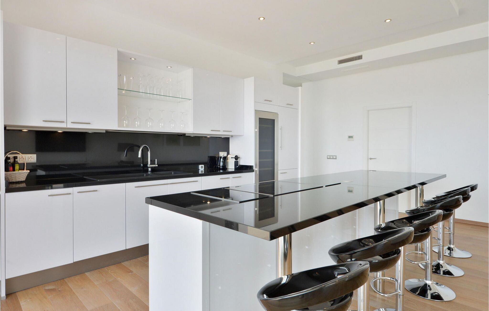Villan är fördelad på tre våningar, omsorgsfullt utformade för komfort och bekvämlighet. Den rymliga loungen på bottenvåningen har en stor TV, en bekväm soffa, luftkonditionering och stora fönster med fantastisk havsutsikt. Loungen leder till en stor veranda med ett matbord, perfekt för middagar utomhus. Köket i öppen planlösning med stor matlagningsö och matplats är fullt utrustat för alla dina kulinariska behov, inklusive en vinkällare. På denna våning finns också ett sovrum med två enkelsängar, ett annat med en dubbelsäng (1,80x2 m) och ett badrum.