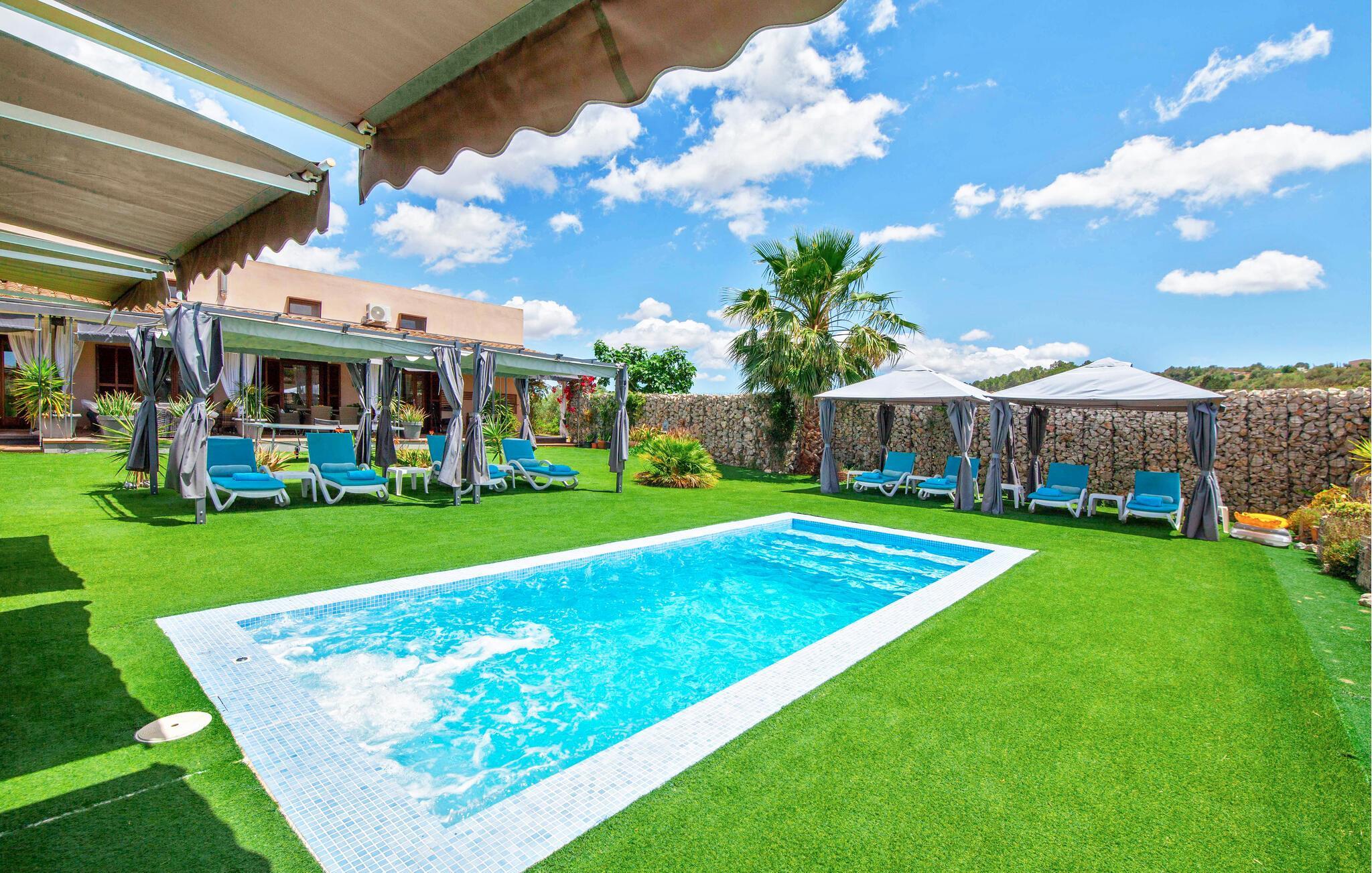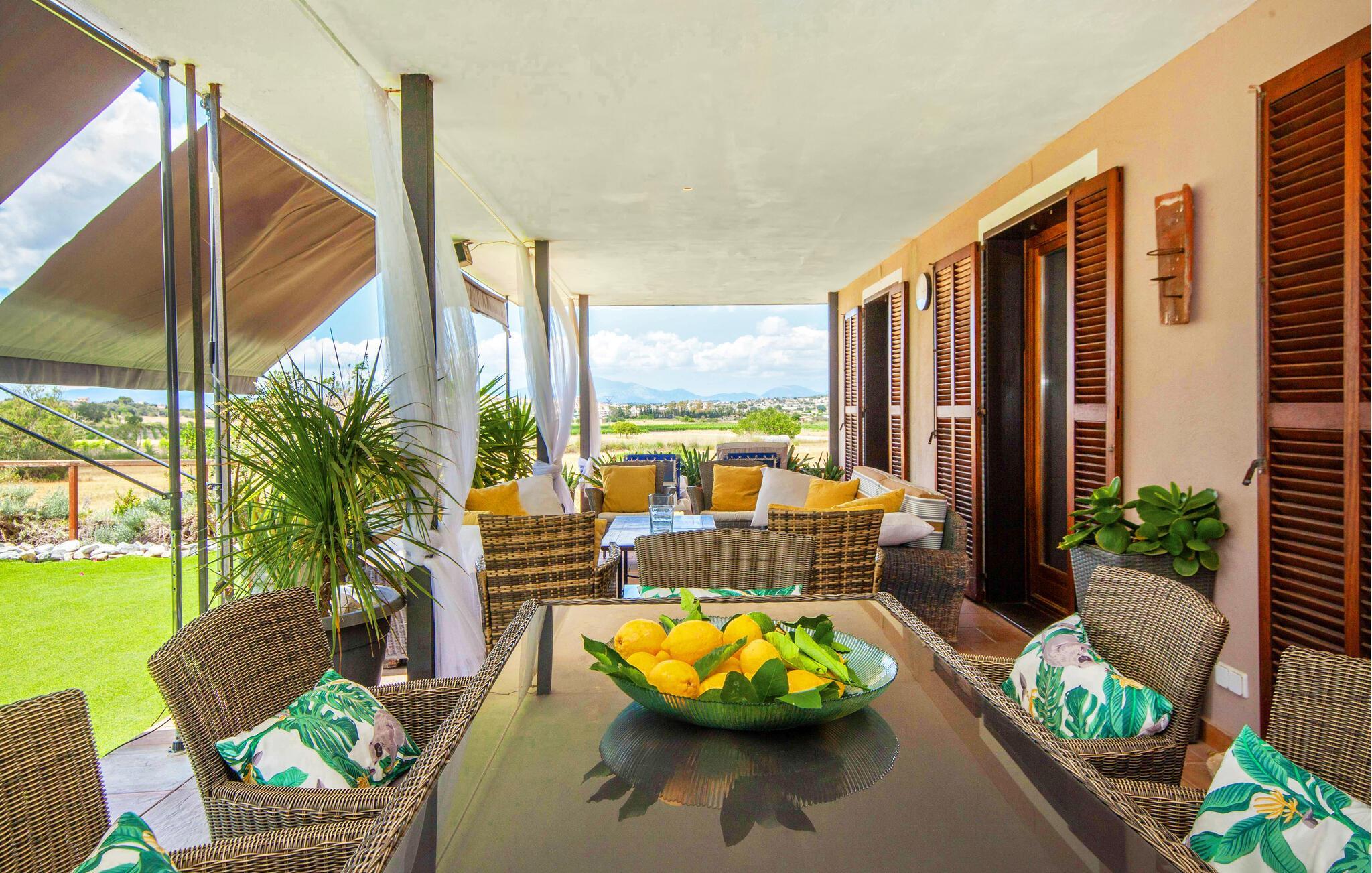 Den ultramoderna Villa Son Gat de Mallorca, idealisk för familjer och familjegrupper, imponerar över hela linjen. Här finns en oas av konstgräs, en uppfriskande saltvattenpool och vackert utformade hörn i trädgården som ger en ny dimension till begreppet avkoppling. Du kan koppla av på solstolarna eller i skuggan av den maritima markisen eller de extra parasollerna. Bredvid poolen ligger det täckta utomhusköket med sina doftande dukar, som, precis som på verandan bredvid huset, erbjuder skydd mot sol och vind och ser helt enkelt vackert ut. I utomhusköket hittar du en fantastisk matplats för ett mellanmål vid poolen eller en uppfriskande glass i baren. Detta område konkurrerar med den skuggiga verandan eftersom det också finns en mysig matplats och lounge, vilket ger dig en avskild plats och en avkopplande tillflyktsort sent på kvällen.