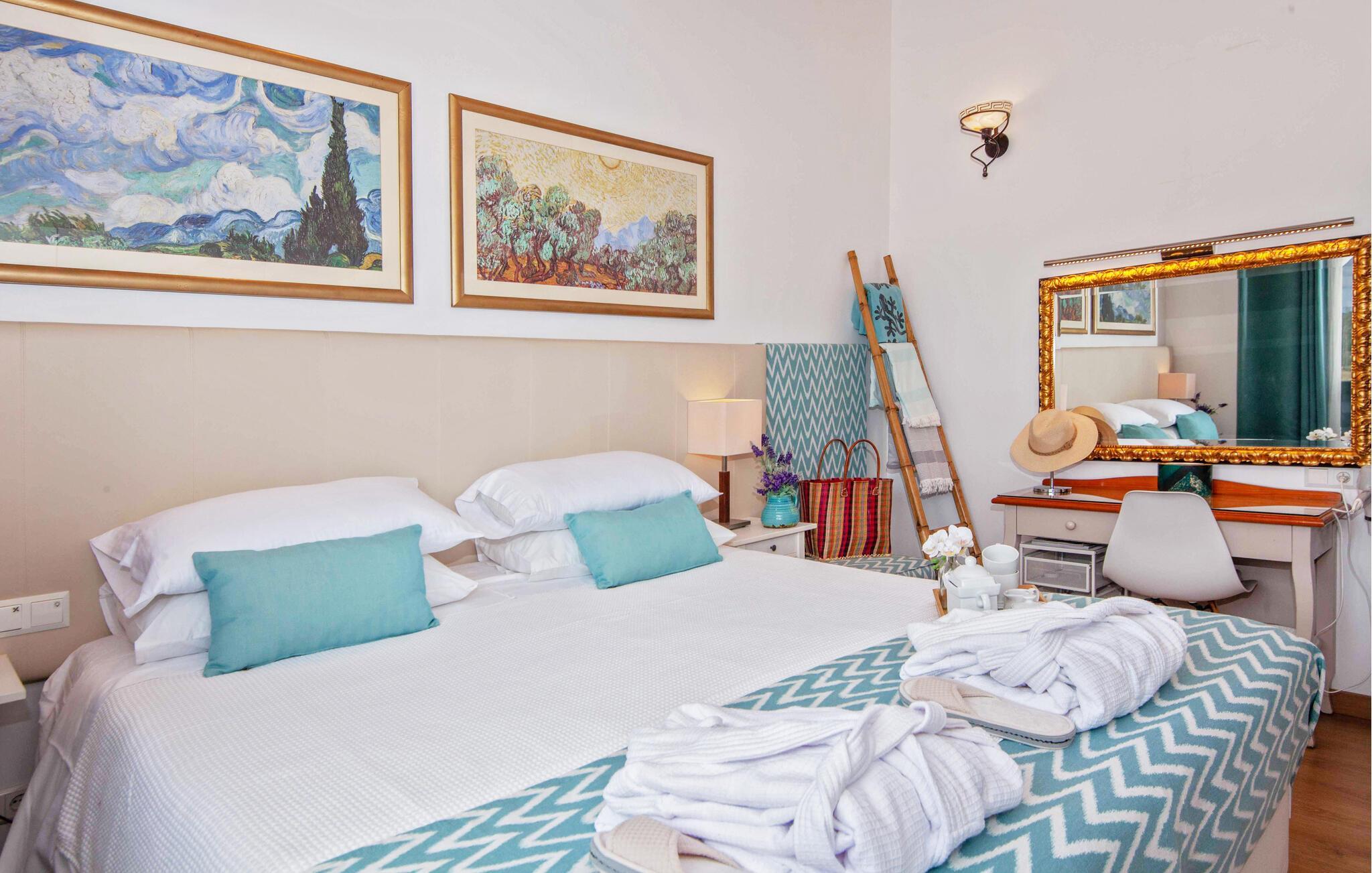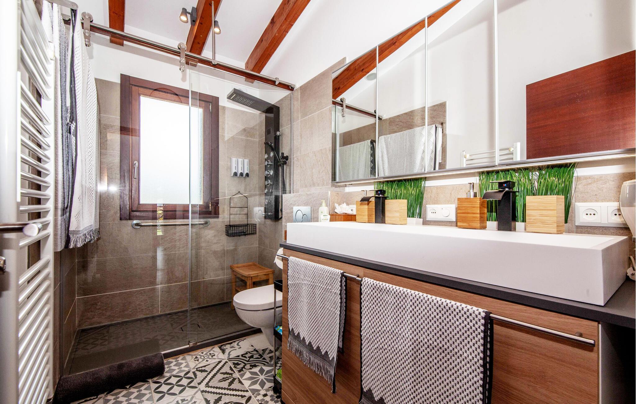 Spänningen kan bara öka när man kommer in i det spännande gårdshuset. Här finns en öppen planlösning med ljusinsläpp från de många fönstren och en luftig takhöjd. Här finns köket, matsalen och vardagsrummet. En absolut dröm för två familjer. Förutom den behagligt generösa känslan av utrymme kan du också förvänta dig tekniskt innovativ utrustning med ett bekvämt utrustat kök, en pelletskamin, en LCD-TV och en Bluetooth-högtalare. Komforten kombineras med en elegant, tidlös inredningsstil som ligger någonstans mellan design och bohemisk. Atmosfären är avslappnad och alla möbler är funktionella. Men det är de små detaljerna som gör stor skillnad i de fyra mysiga sovrummen med dubbelsängar eller två enkelsängar vardera för upp till åtta personer. De feodala badrummen med duschkabiner i cool design är pricken över i:et på Villa Son Gat Mallorca, som kommer att uppfylla dina förväntningar på alla områden.