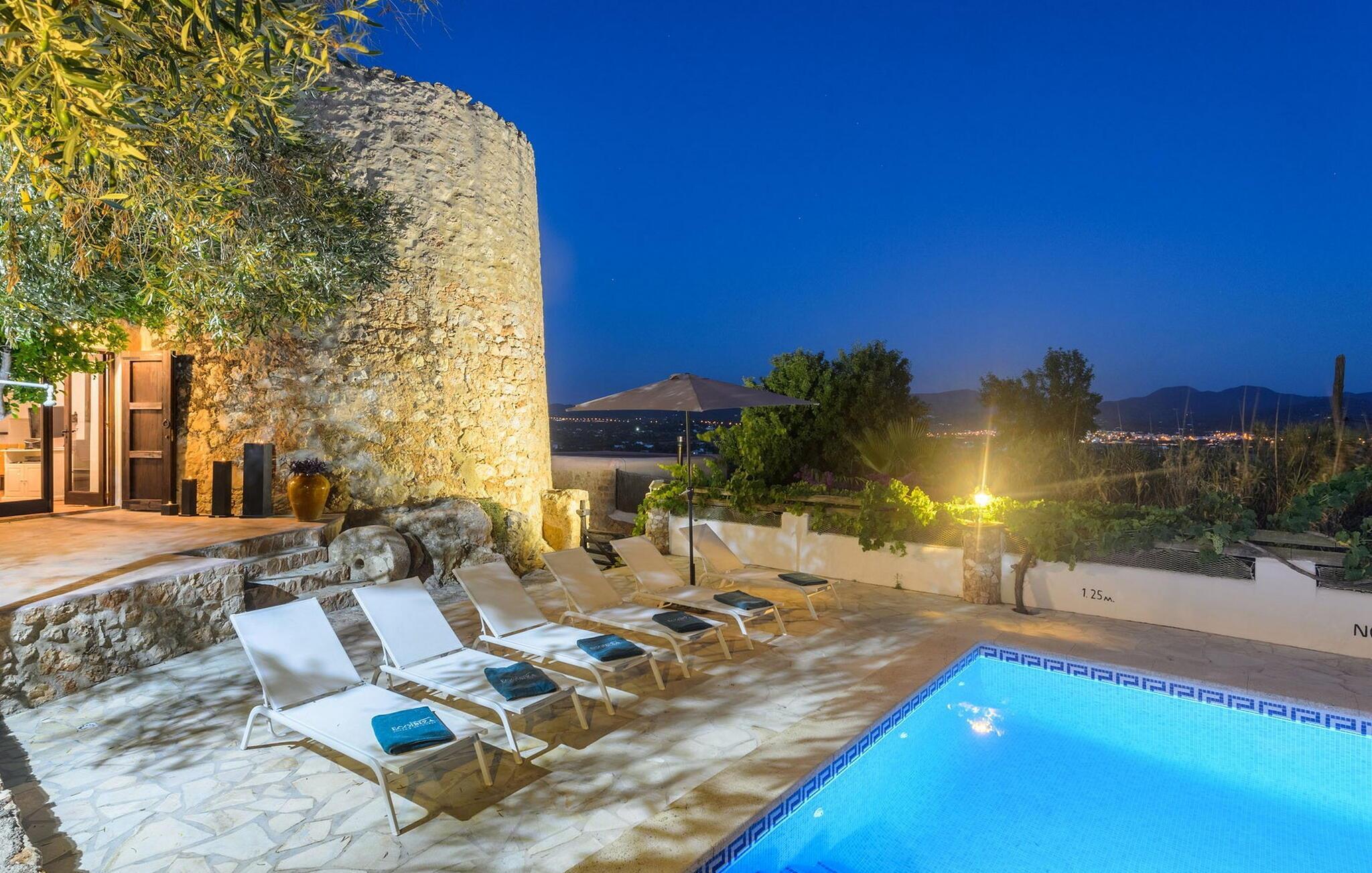 Denna fantastiska, traditionella Ibiza-gård med ett försvarstorn från 1600-talet är ett vackert exempel på autentisk ö-arkitektur. Tjocka vita väggar och högt i tak av enbärsträ från Ibizas skapar en sval och rymlig atmosfär.