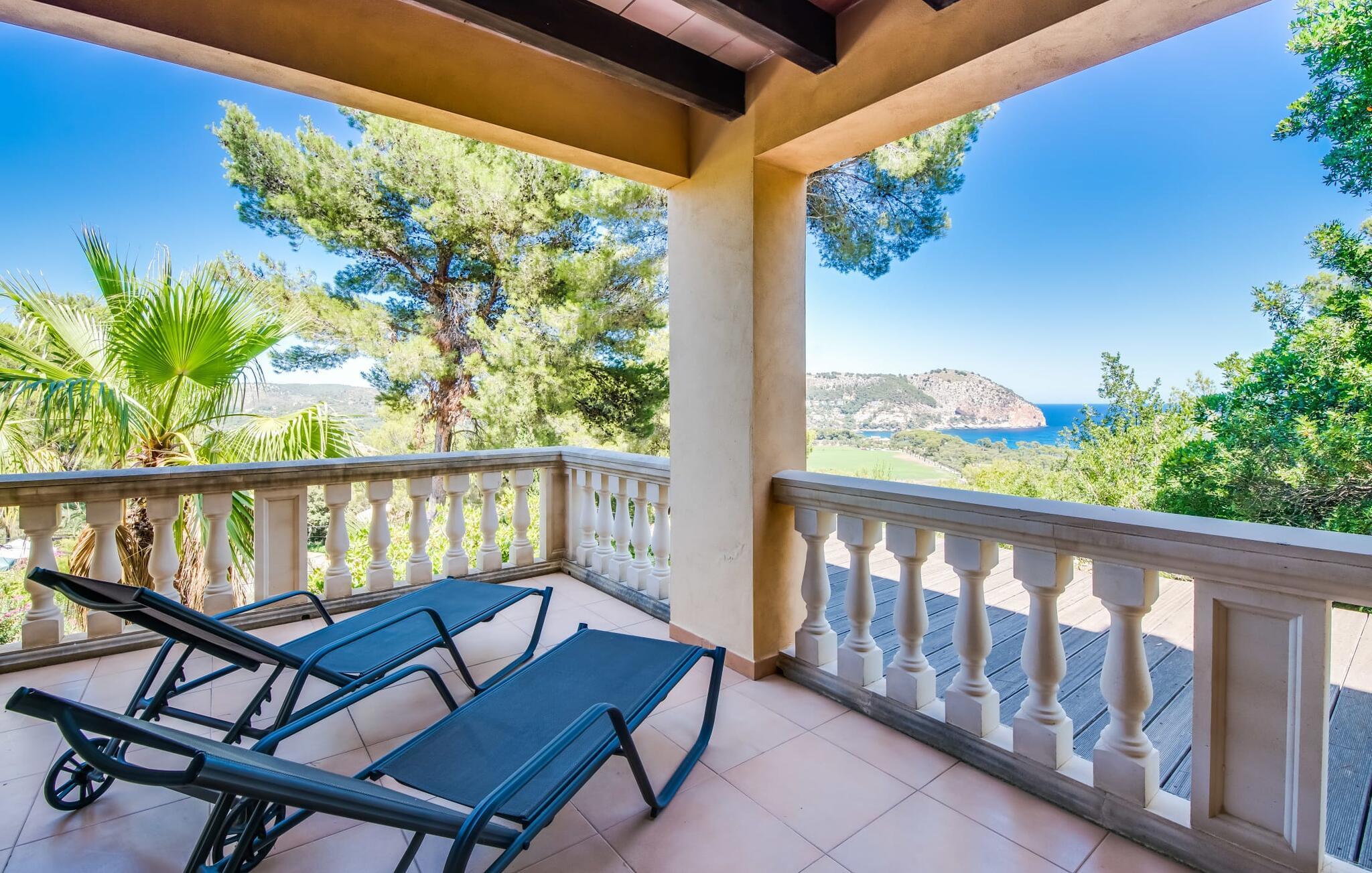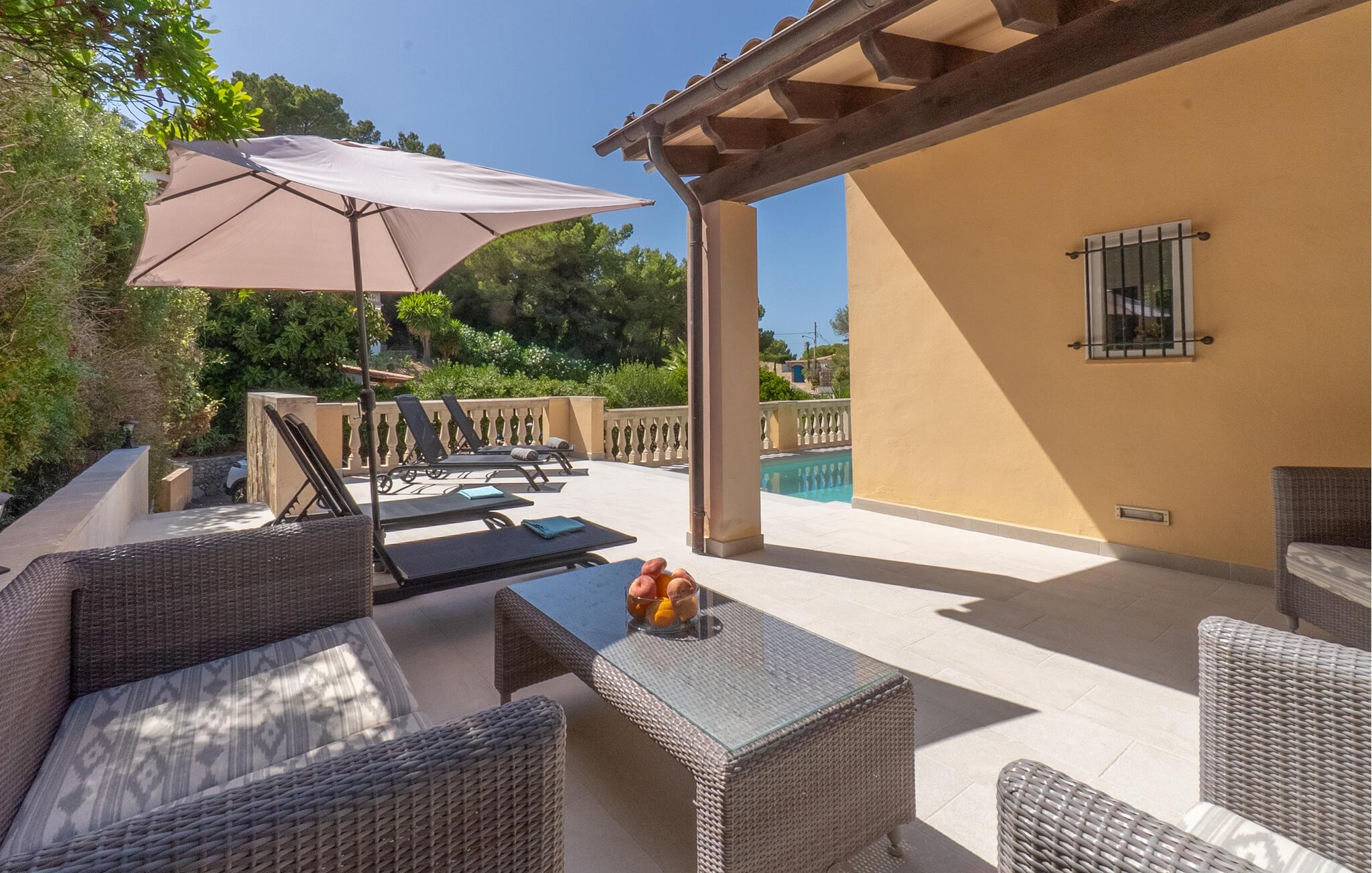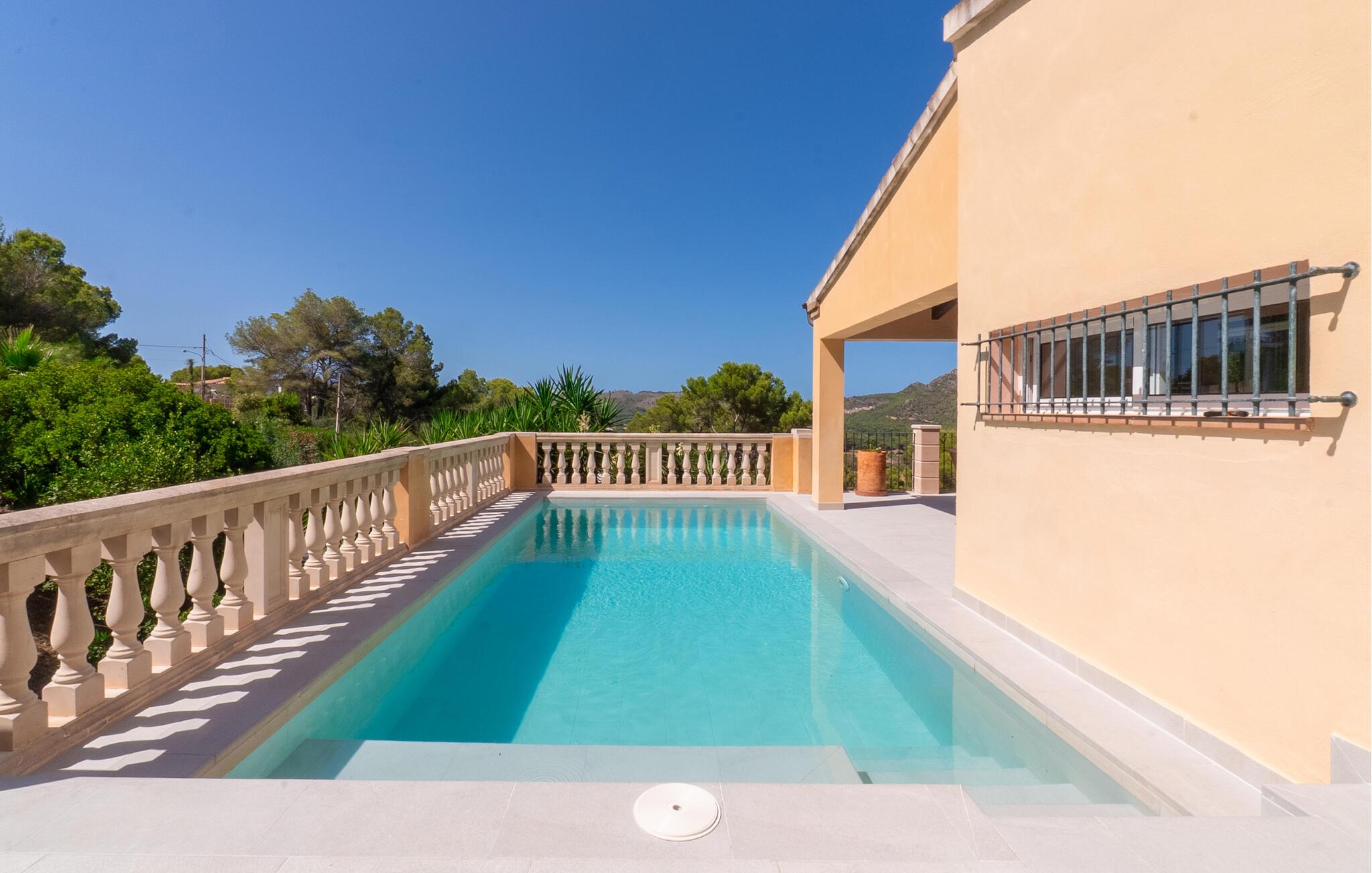 Med ett underbart läge på en sluttning och kärleksfullt inredd är Voltor 3 på Costa Canyamel som hämtad ur en bilderbok: havsutsikt, komfort, pool precis intill huset. Med sina många uteserveringar och magnifika utsikt kommer denna villa på Mallorca gradvis att krypa in i varje soligt semesterhjärta. Byggd på två våningar i klassisk medelhavsstil, presenterar den sig som en allround när det gäller semesteratmosfär, omgiven av frodig grönska. En täckt terrass med matbord, plus en chill-out lounge med konstrottingmöbler och parasoll vid den 7 meter långa poolen, den bästa tiden på året börjar så snart du anländer. Senare kanske du vill gå ut på någon av de många andra balkongerna. Det finns gott om platser att dra sig tillbaka till och den rätta stämningen för en sängfösare ändå. Även de varmaste dagarna är inga problem: det utmärkta läget och de många stora dörrarna och fönstren garanterar ett perfekt inomhusklimat! Förresten: Villan har en asfalterad parkeringsplats, så du kan parkera din hyrbil direkt framför huset.