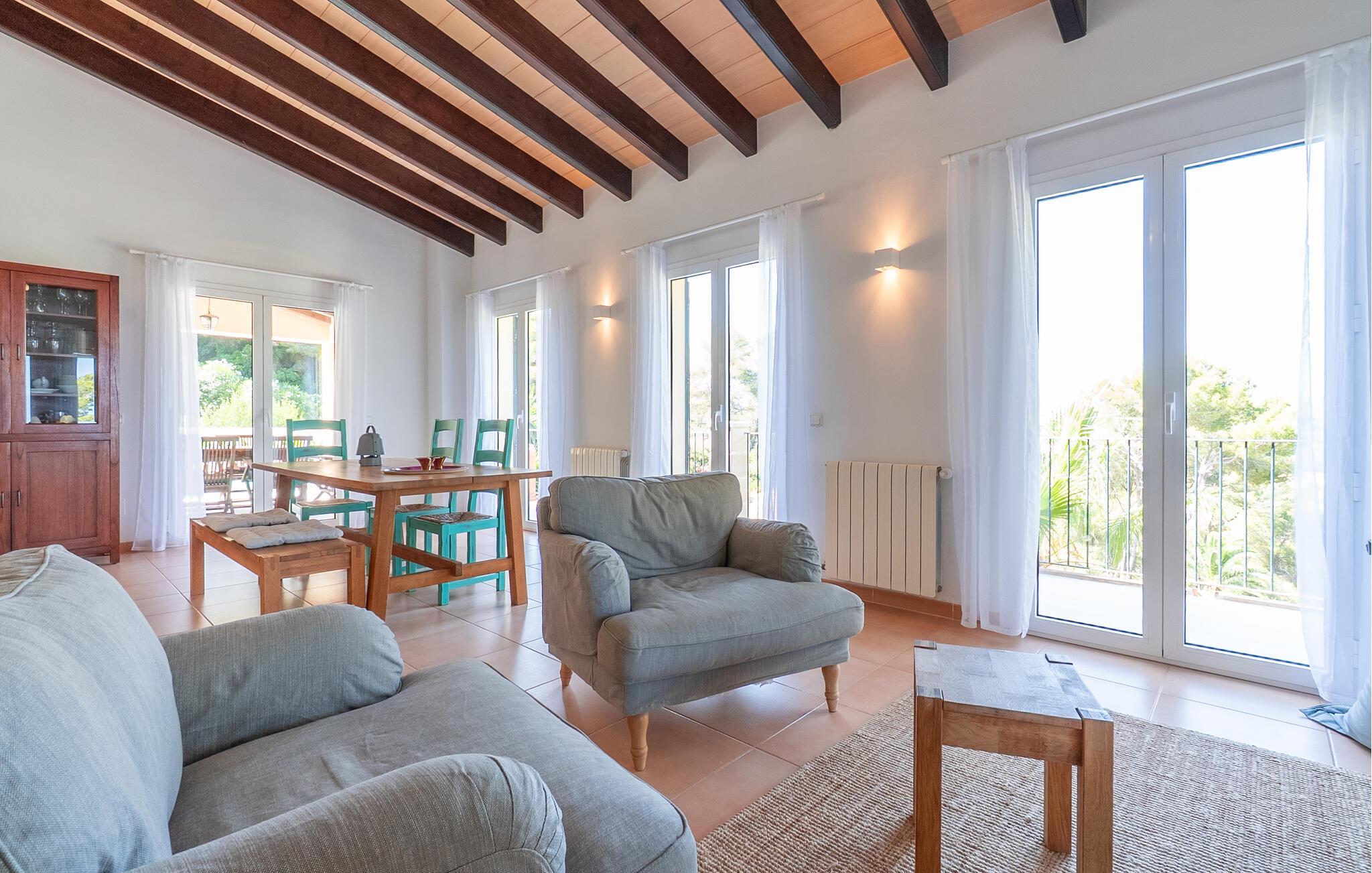 Naturfärger, ljushet och en touch av nordisk stil skapar en somrig fräschör och avslappnad mysighet i denna villa på Mallorca. Mittpunkten på övervåningen är vardagsrummet med öppen spis: harmoniska accenter möter massivt trä och originalmöbler som det gyllene soffbordet i bikakedesign. Matbordet med bänk och stolar ligger också i samma rum, liksom passagen till det angränsande köket. Här kan du inte bara njuta av nybryggt kaffe, utan också hitta nödvändig utrustning för självhushåll. I hela huset hittar du fönster och dörrar från golv till tak - en feelgood-faktor i alla fall. Tydlig separation: De tre kärleksfullt designade sovrummen ligger i villans källare. Alla har eget badrum och inbyggda garderober. Villa Voltor 3 ligger i den varierade östra delen av Mallorca, ca 1,5 km sydväst om Canyamels centrum med sina butiker, restauranger och den vackra, orörda sandstranden. Här kan ni bo lugnt och fridfullt mitt bland frodig växtlighet och höga träd. Besök de vackra vikarna under dagen och njut av Medelhavet från terrassen på kvällen: Inget kan vara bättre.
