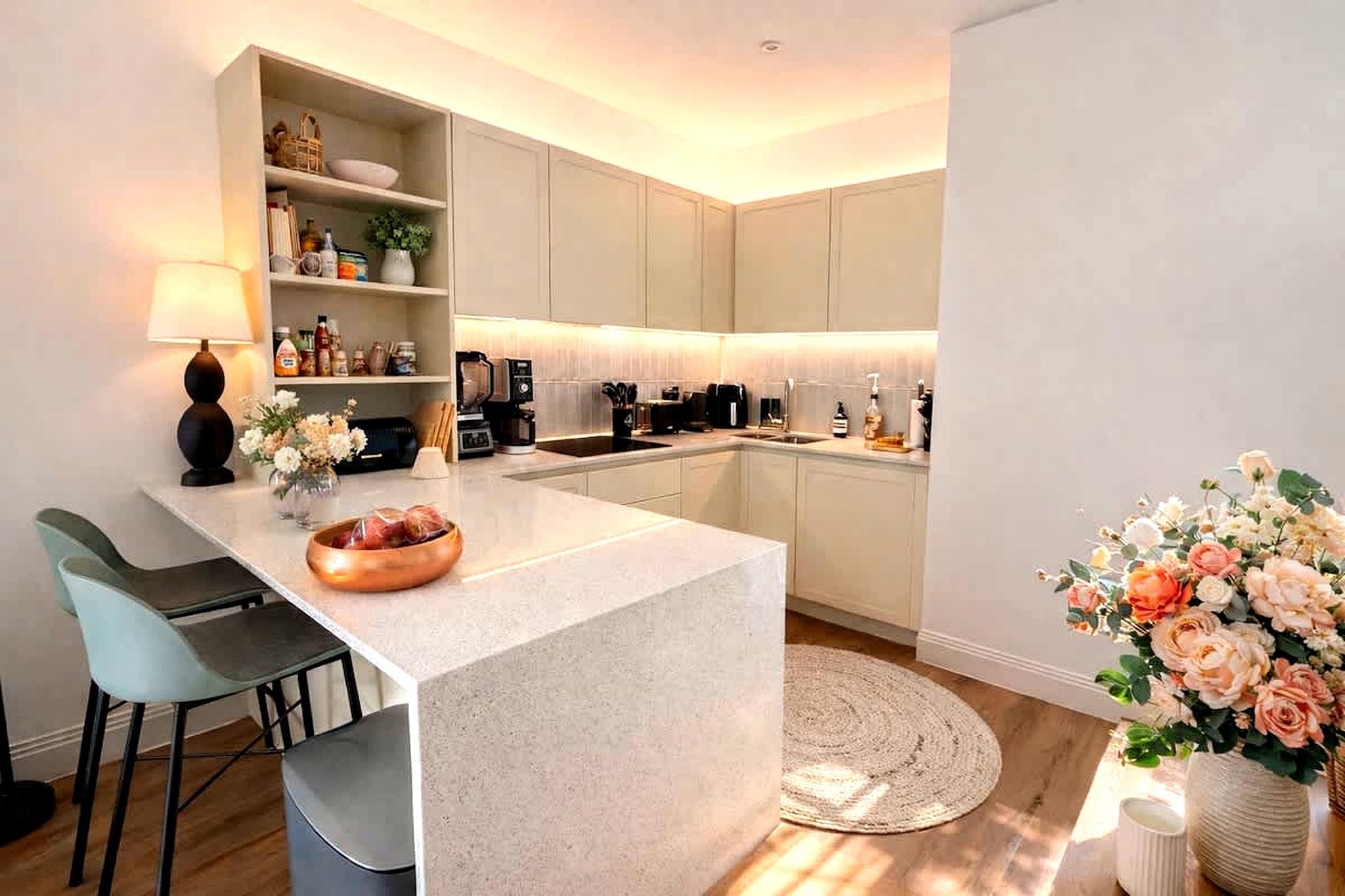 Med utsikt över Chiswicks lummiga omgivningar erbjuder denna välutrustade lägenhet i Renaissance Square-området en lugn och elegant vistelse i London. Belägen alldeles intill Chiswick House & Gardens kombinerar den gröna öppna ytor med enkel tillgång till kaféer, restauranger och transportförbindelser till centrala London. Inuti har lägenheten två sovrum, båda med en dubbelsäng, samt två badrum utrustade med badkar, toalett och hårtork, vilket ger extra komfort för grupper eller familjer. Vardagsrummet är utformat som en välkomnande samlingsplats med mysiga sittplatser, en dedikerad arbetsyta och utrymme att koppla av eller arbeta med lätthet. Ett fullt utrustat kök inkluderar spis, ugn, mikrovågsugn och diskmaskin, vilket gör det lämpligt för både korta och längre vistelser. Ytterligare bekvämligheter som tvättmaskin, torktumlare, värme och viktiga bekvämligheter säkerställer en smidig och bekväm upplevelse. Lägenheten sträcker sig utomhus med en privat uteplats och tillgång till ett trädgårdsområde, vilket erbjuder en lugn miljö som sällan finns i stadsvistelser. Uteservering möjliggör lugna morgnar eller avkopplande kvällar, medan den omgivande grönskan förstärker den övergripande känslan av rymd och lugn. Lägenheten ligger i ett tryggt område med goda transportförbindelser, inom gångavstånd från lokala kaféer, butiker och natursköna vandringsleder genom Chiswick House & Gardens. Utmärkta transportförbindelser ger enkel tillgång till centrala London, vilket gör den till en bekväm bas för både fritids- och affärsresor. Med sin balanserade blandning av komfort, grönska och läge är denna lägenhet idealisk för en avkopplande stadsflykt.