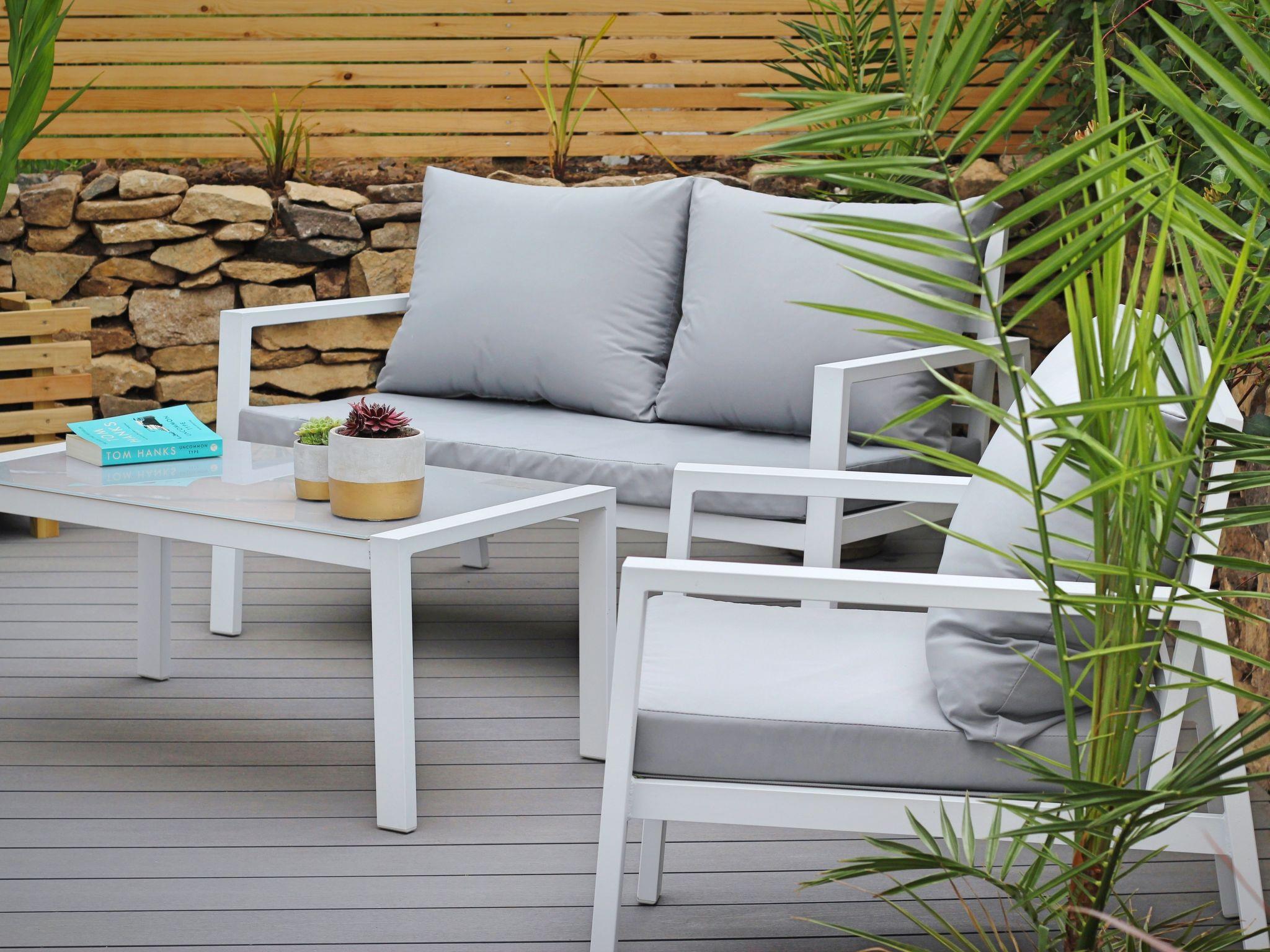Decking with hand built Cornish granite walls and designer outdoor furniture. This area is situated behind Willow Green Cabin and features uniquely spectacular panoramic views across Cornwall.