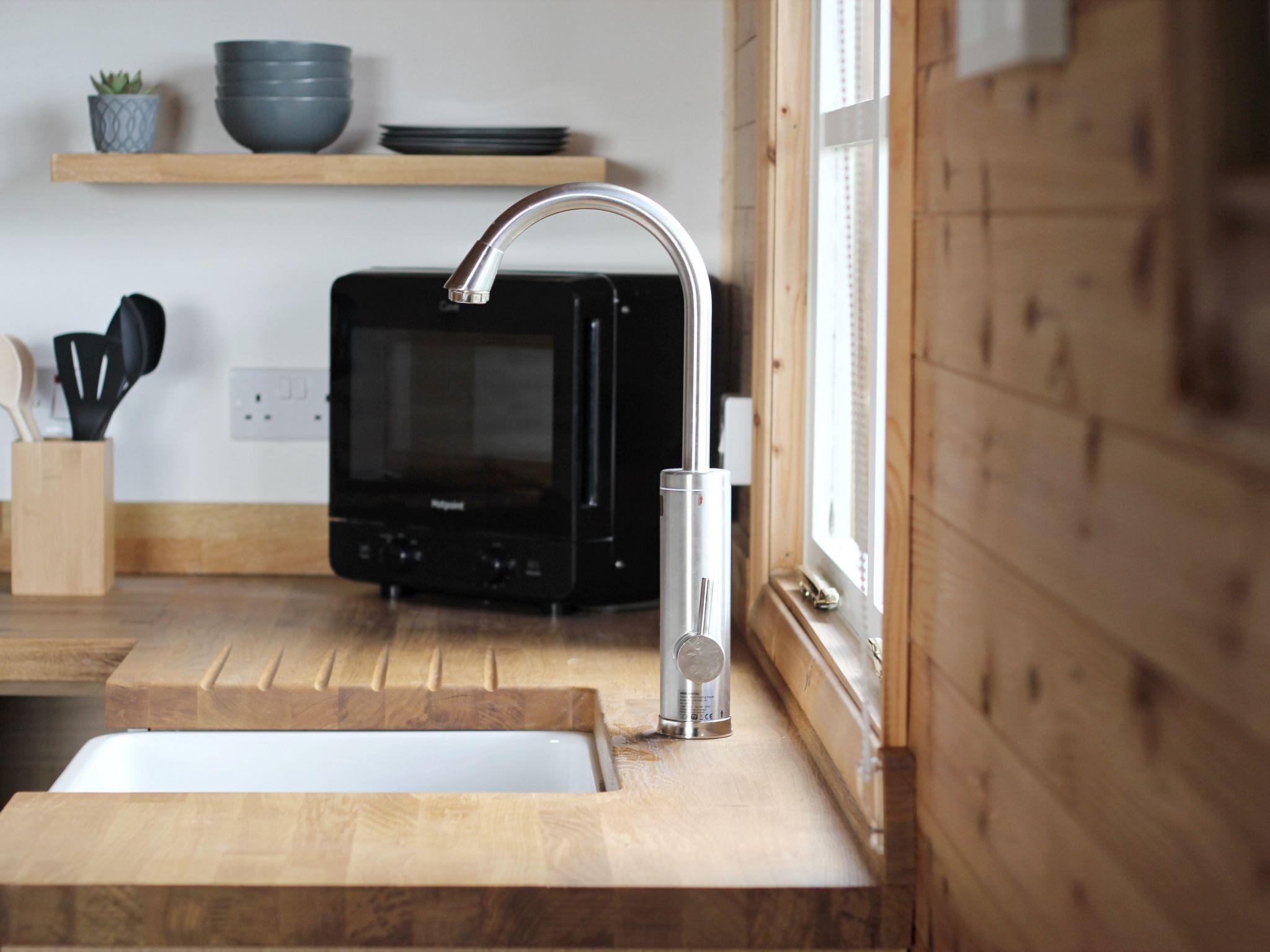Open Plan Living Area: Positioned in front of the kitchen area, there is a solid oak dining table to seat four, a Scandi styled clic-clac sofa-bed, a LED television with integrated Bluetooth speaker for music playback, and a modern Dimplex Opti-myst electric faux woodburner stove with lifelike smoke & flame effect. The whole space is centrally heated with a modern Smart enabled wall panel heater placed in the open plan hallway.
