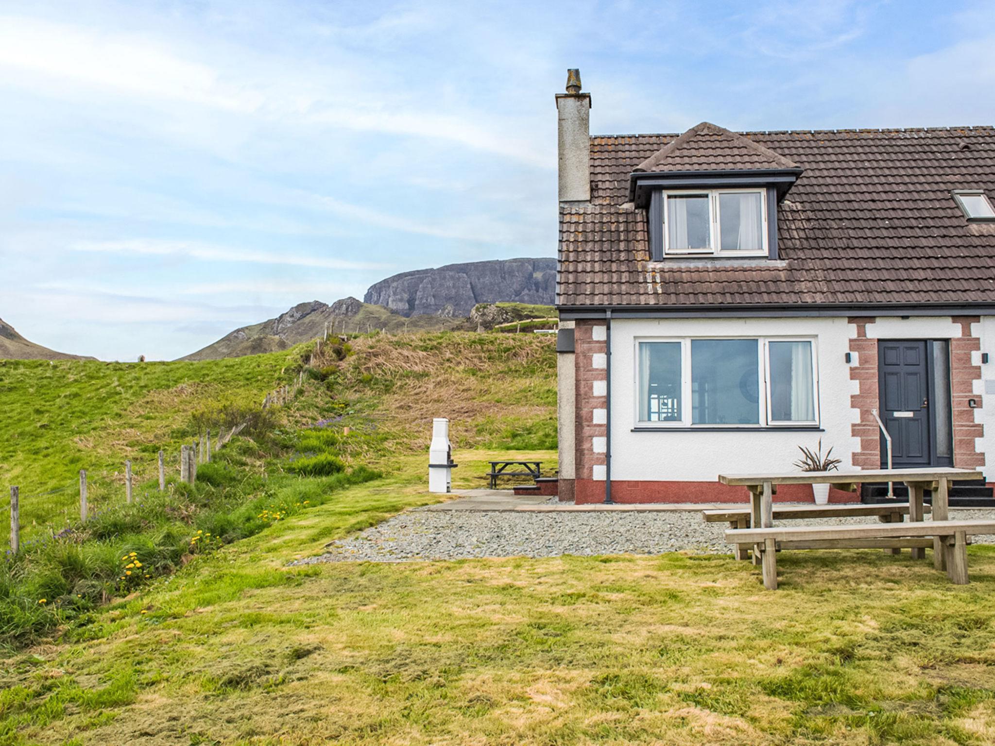 Cosy, comfortable house "Quiraing Cottage", detached. In the district Staffin, 2 m from the sea. Private: large garden. In the house: WiFi, central heating system, laundry. Parking (for 2 cars) at the house. Shop 2 m, grocery 2 km, restaurant 16 km, bar 15 km, bus stop "road end" 500 m. Nearby attractions: The Quiraing, 5 km, Old man of Storr 22 km, Lealt Falls 12 km. Please note: car recommended. Baby equipment on request.