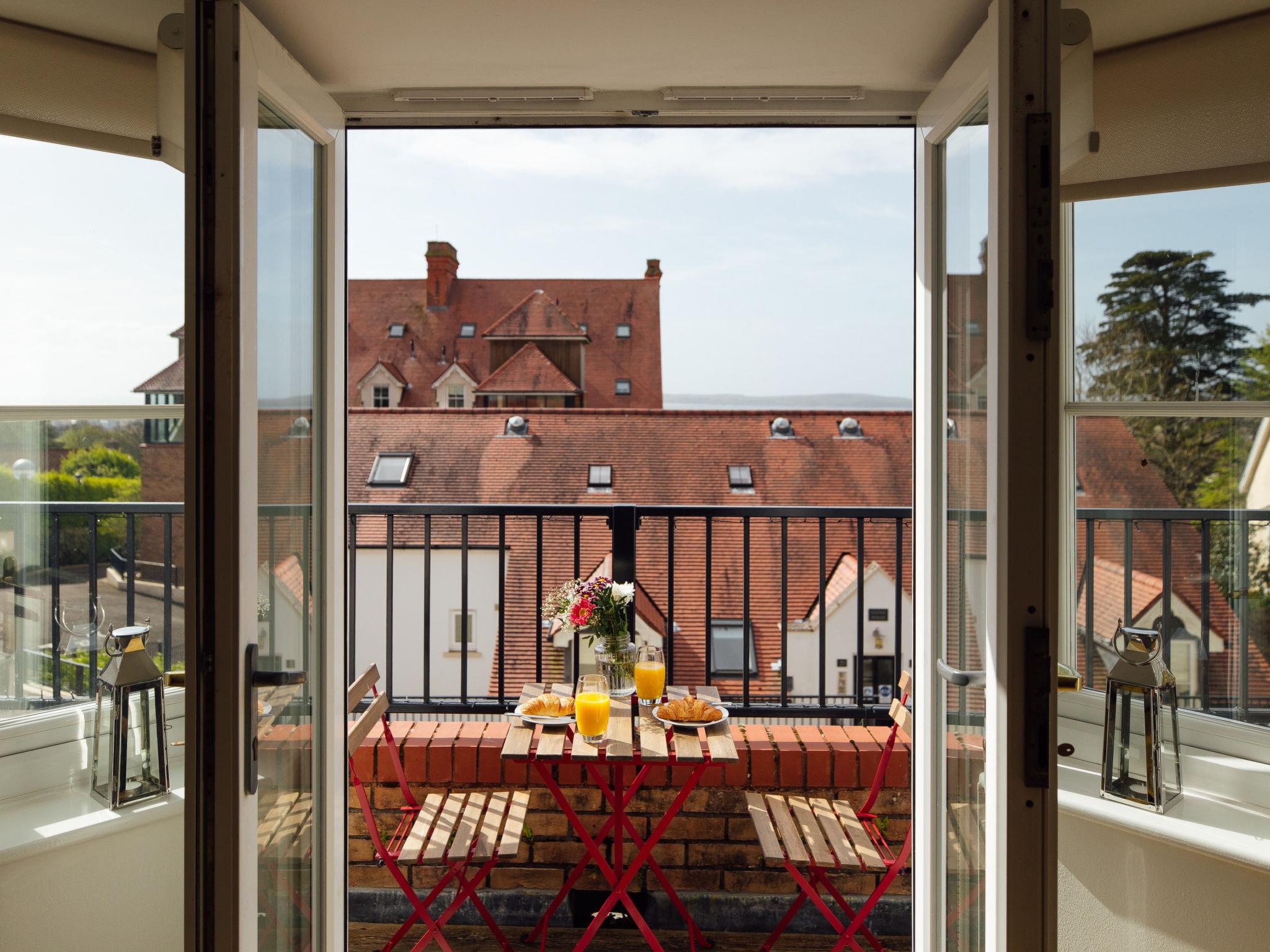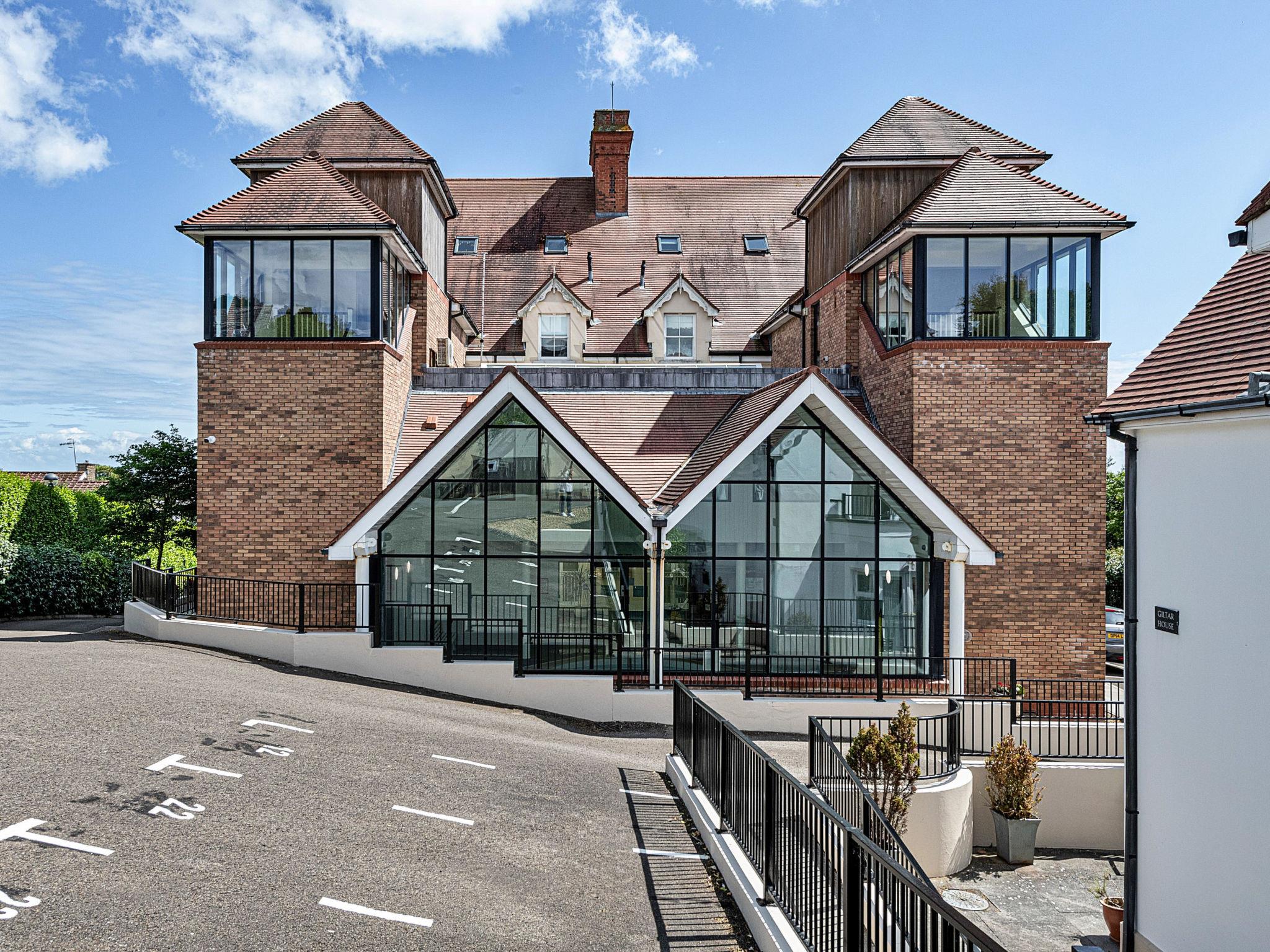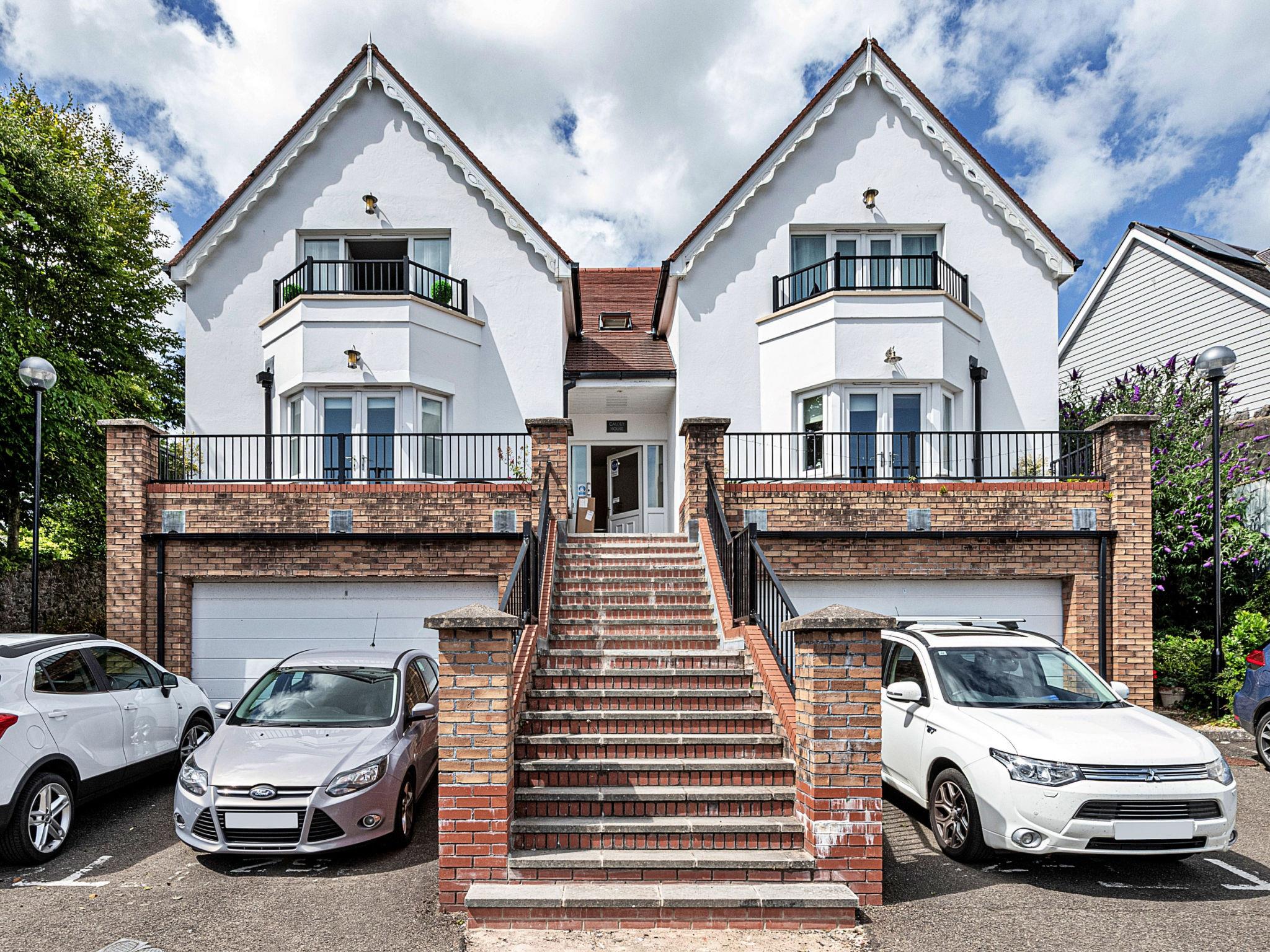 Tenby: Apartment block. For shared use: swimming pool heated (seasonal availability: 01.Jan. - 31.Dec.). Private: garden. Supermarket 700 m, railway station 600 m, sandy beach 800 m. Golf course 1 km.