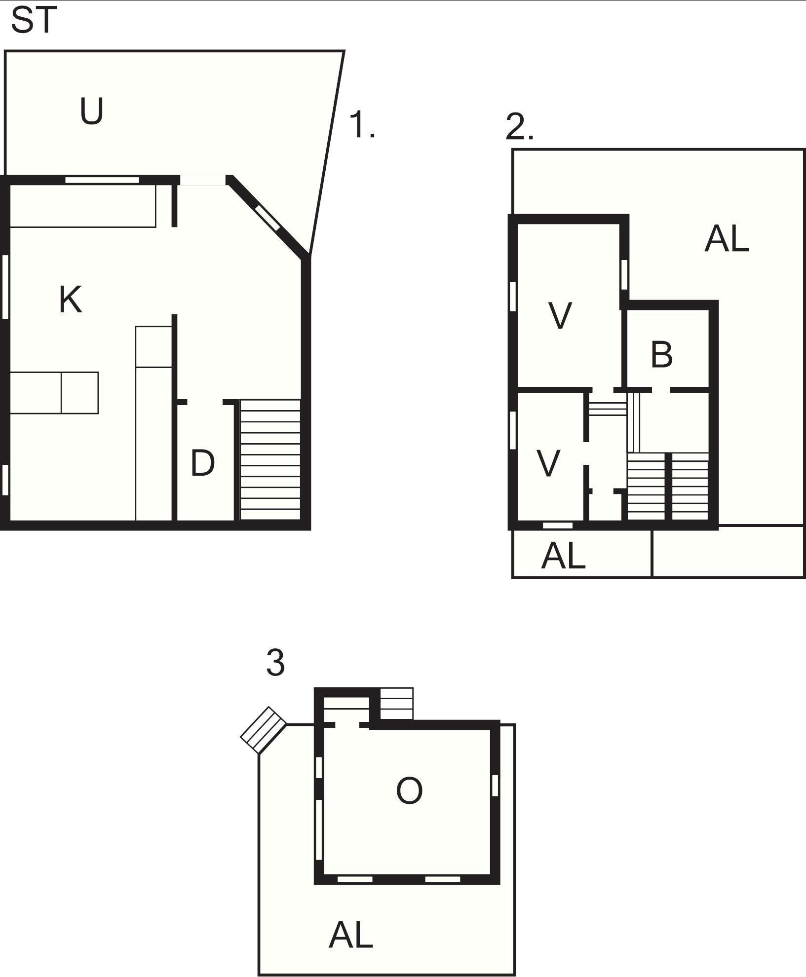 Huset är ett 2,5-plans suterränghus. Entrén går via ett uterum in till köket (obs låg takhöjd), härifrån kommer man också ut i trädgården. En halvtrappa upp finns de båda sovrummen, det ena med en 140cm bred säng och det andra med en dubbelsäng. På detta plan finns även en walk in closet samt ett badrum med tvättmaskin. Ytterligare en halvtrappa upp härifrån finns ett vardagsrum med utgång till altanen. I vardagsrummet finns en Smart-TV med utbud från Allente och en soundbar. Huset har klimatanläggning.