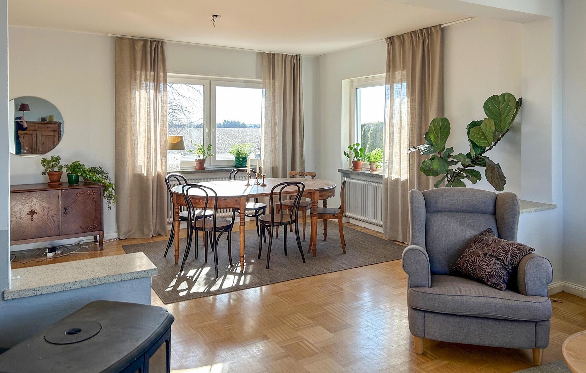 Tillbringa din nästa semester i detta semesterhus i Glemmingebro och njut av de idylliska omgivningarna på Österlen. Oavsett om du är med familj eller vänner, erbjuder detta semesterhus komfort, utrymme och en fantastisk utsikt över det öppna landskapet. Huset är ljust och smakfullt inrett. Det rymliga vardagsrummet inbjuder till avkopplande kvällar med en mysig soffgrupp, snygga lampor och ett stort matbord. Njut av måltider tillsammans, tillbringa en filmkväll eller njut av utsikten genom fönstren över det vidsträckta öppna landskapet. Det moderna köket ger dig möjlighet att laga till en kulinarisk njutning.