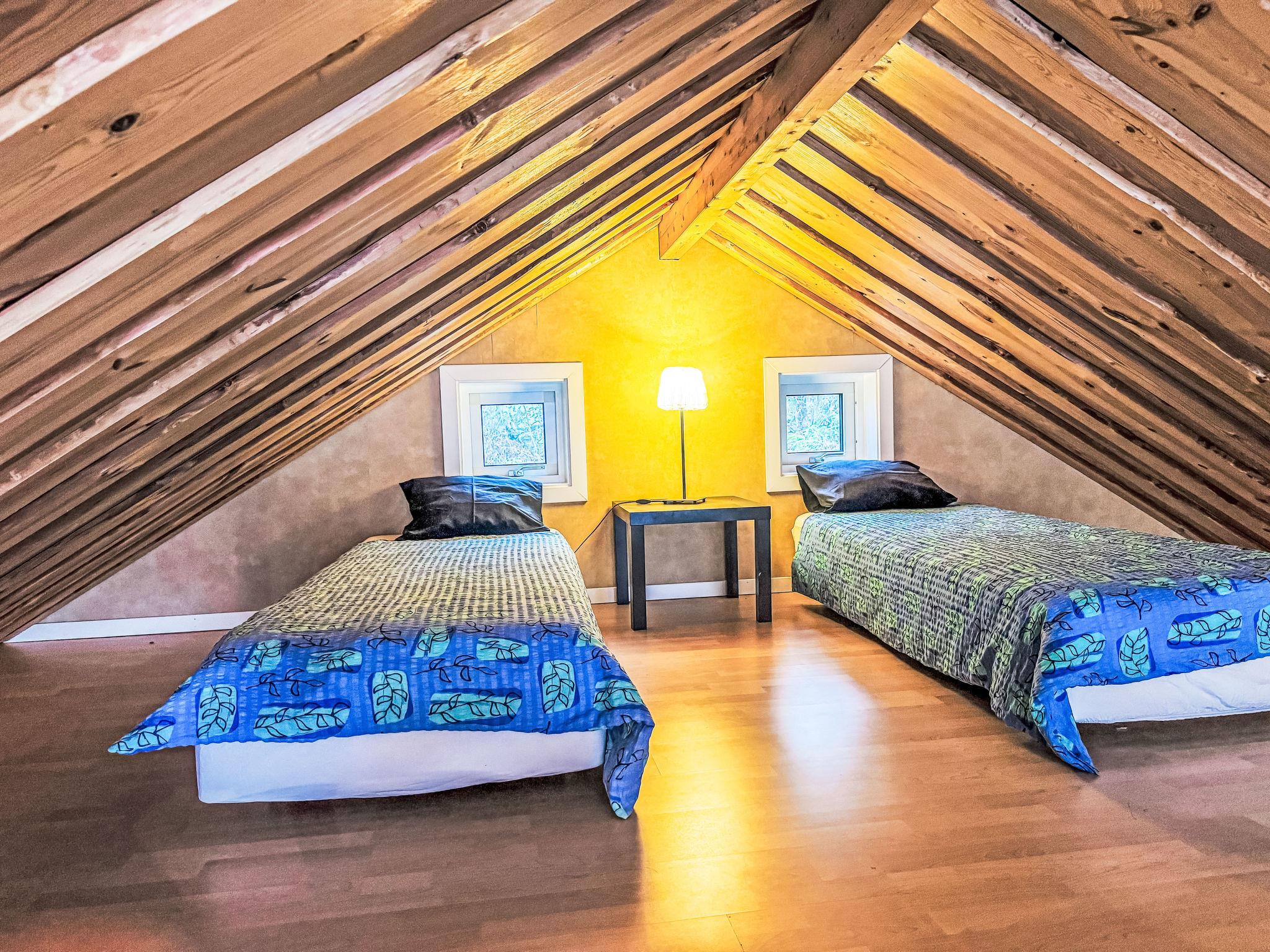 "Liane 3", 6-room house 130 m2. Modern and tasteful furnishings: living room with Scandinavian wood stove, TV and digital TV. 1 room with 1 double bed (180 cm, length 200 cm). 1 room with 2 beds (90 cm, length 200 cm). Living/sleeping room with 2 beds (90 cm, length 200 cm), dining table. Open kitchen (oven, dishwasher, 4 ceramic glass hob hotplates, toaster, kettle, microwave, freezer, electric coffee machine) with dining table. 2 showers/WC, Sauna. Electric heating, wood heating, air-conditioning. Upper floor: open gallery with 2 beds (90 cm, length 200 cm). Wooden floors. Terrace 70 m2. Barbecue (portable), deck chairs (2). Beautiful panoramic view of the lake. Facilities: washing machine. Internet (WiFi, free). Please note: non-smoking house. Maximum 2 pets/ dogs allowed. Smoke alarm. Instead of an enclosed bedroom, some sleeping areas are located in an open-plan area (gallery, alcove, etc.).