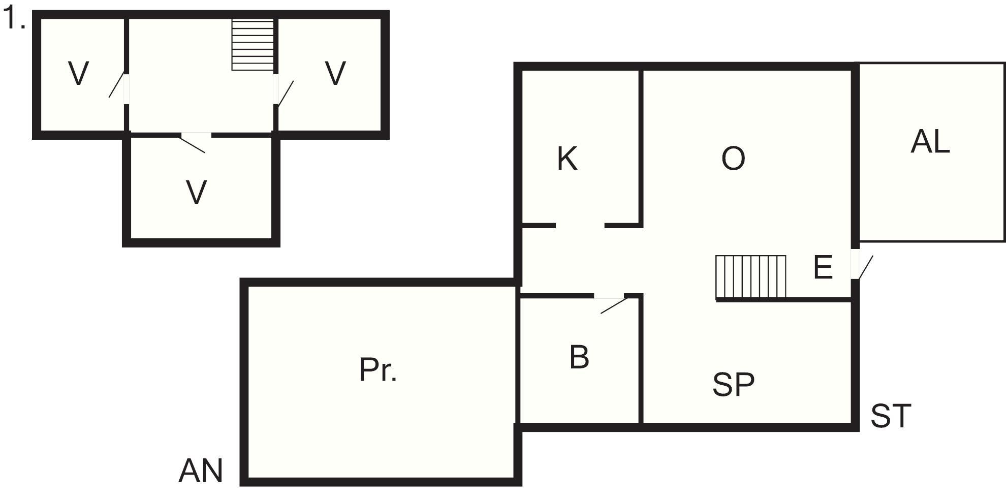 På nedre plan finns ett vardagsrum, en matsal, ett funktionellt kök och ett badrum. Det finns synliga takbjälkar och i vissa delar är takhöjden betydligt lägre, vilket bidrar till husets rustika karaktär. En något brant trappa leder upp till övervåningen där du hittar tre sovrum: två rum med varsin enkelsäng och ett rum med två enkelsängar – perfekt för familj eller mindre sällskap.